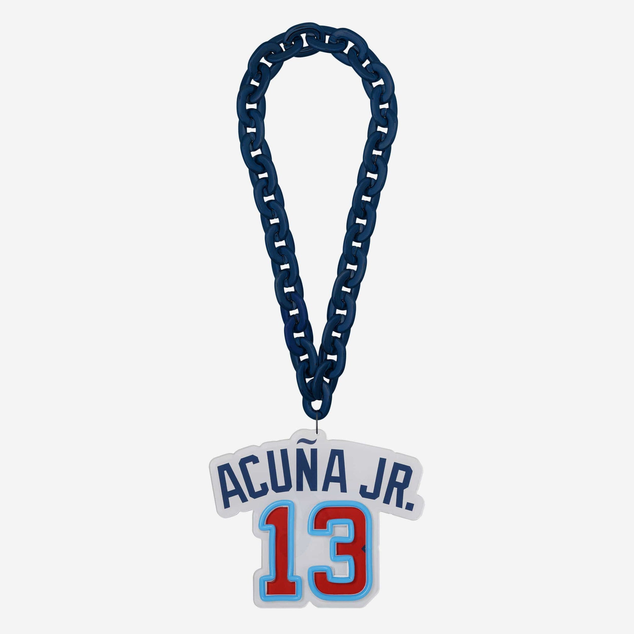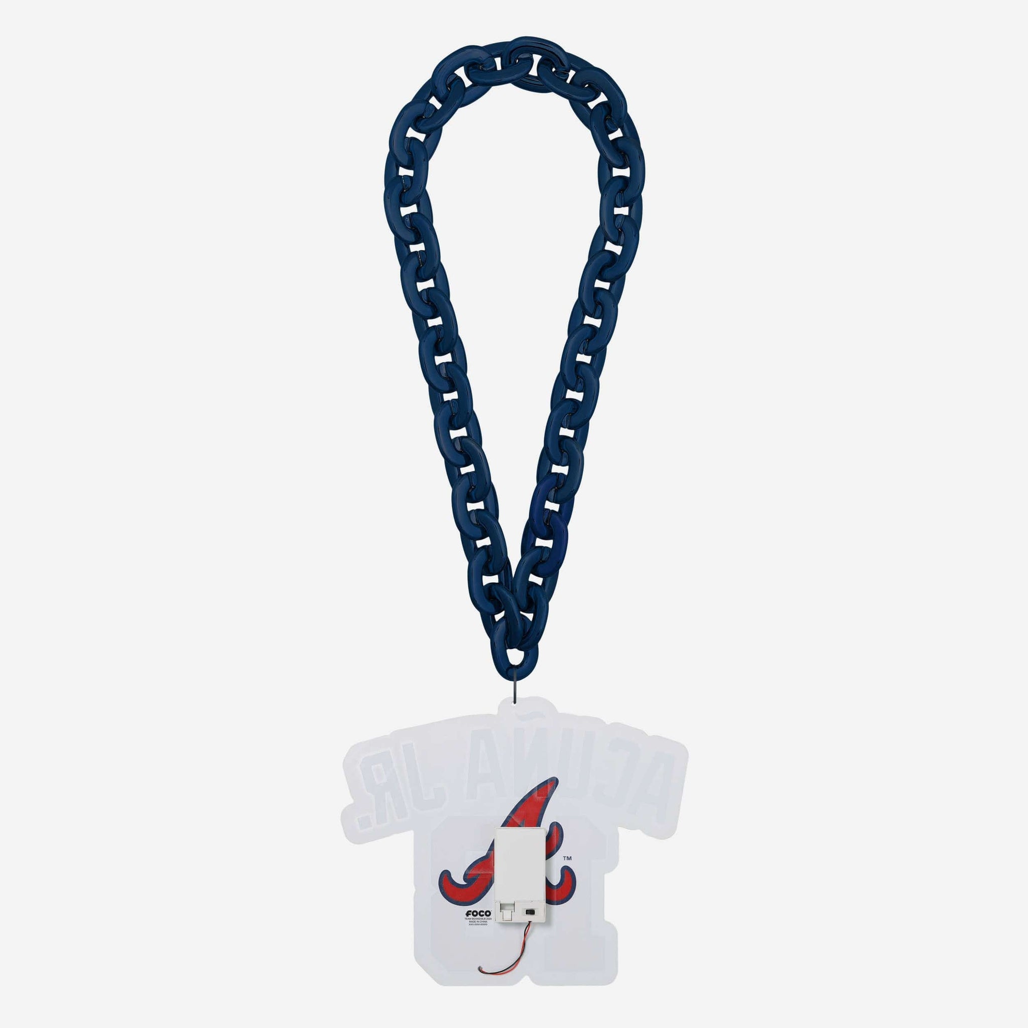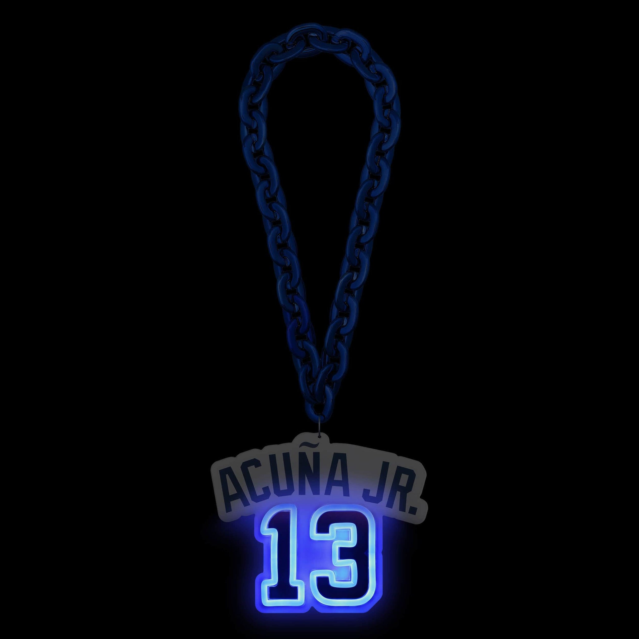 Your favorite star shines bright on the field. Now, you can shine just as bright in the stands! Add some glow to your gameday fit with this Ronald Acuna Jr Atlanta Braves Neon Light Up Big Logo Player Chain.