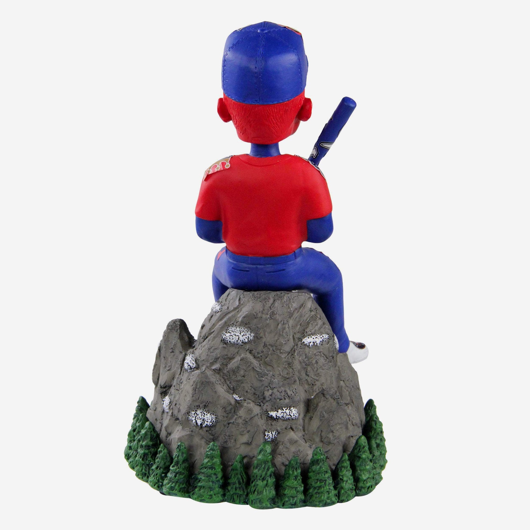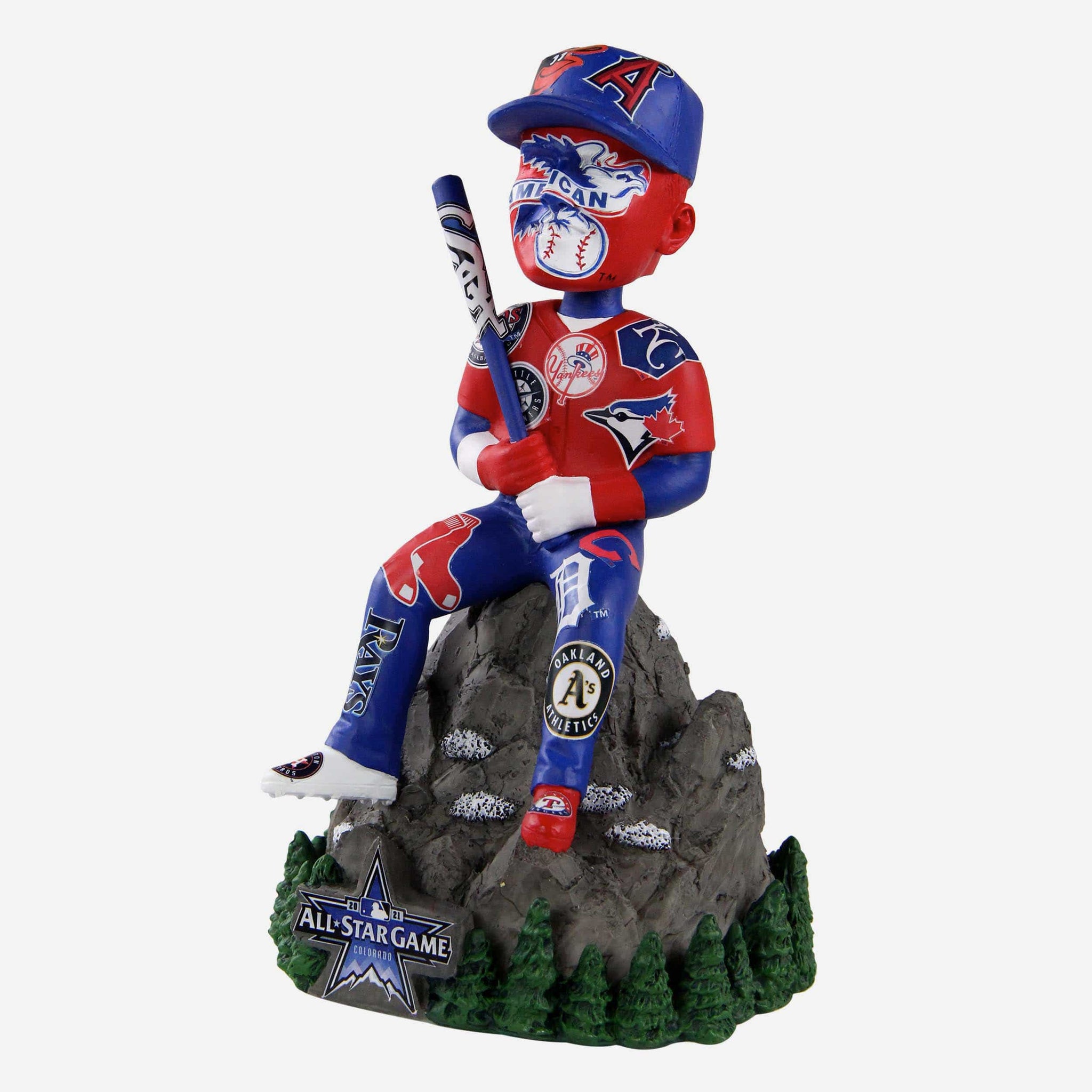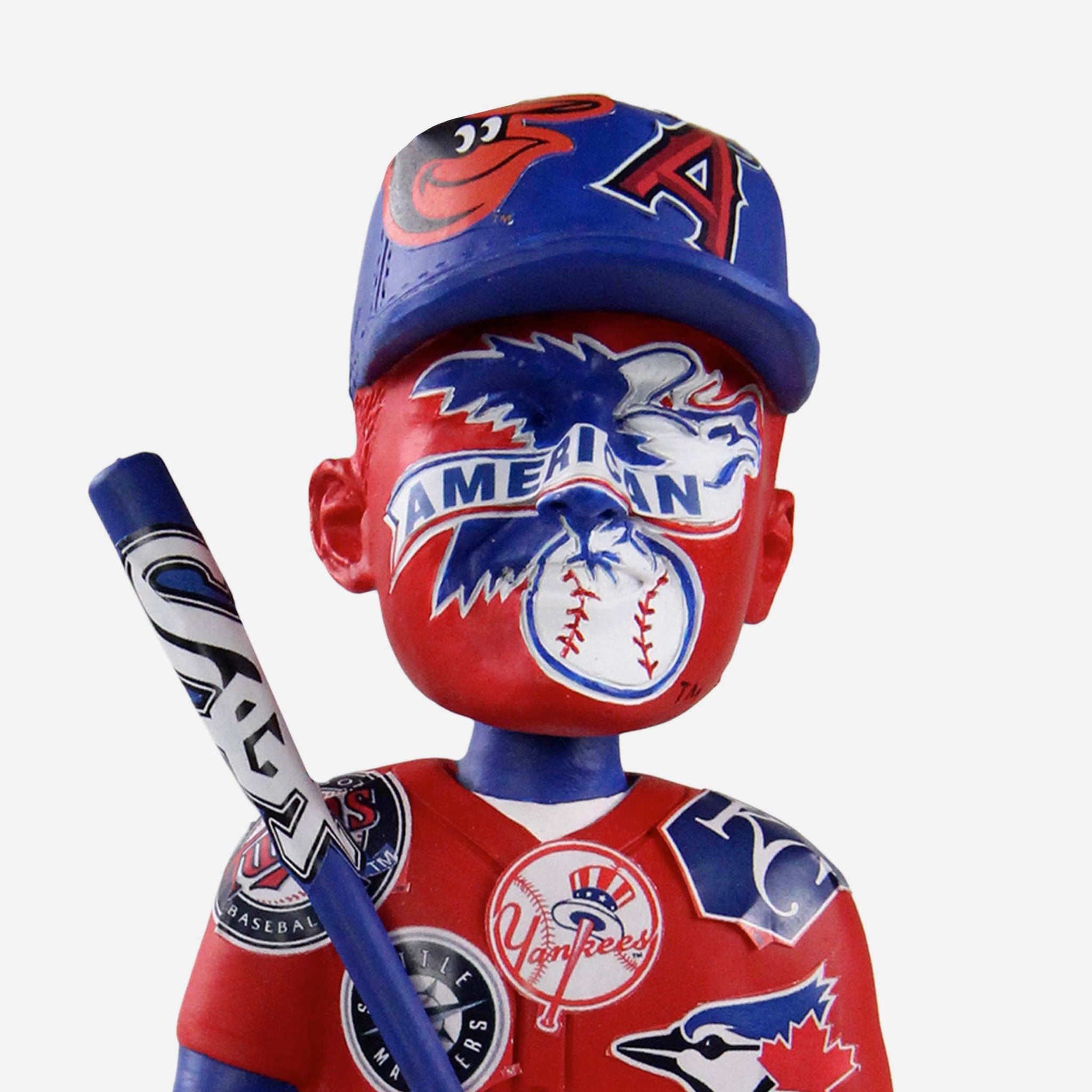 • Repeat red, white, and blue pattern design with American League and A.L. team logo displays across the body and bat of seated figure for a heaping helping of team spirit