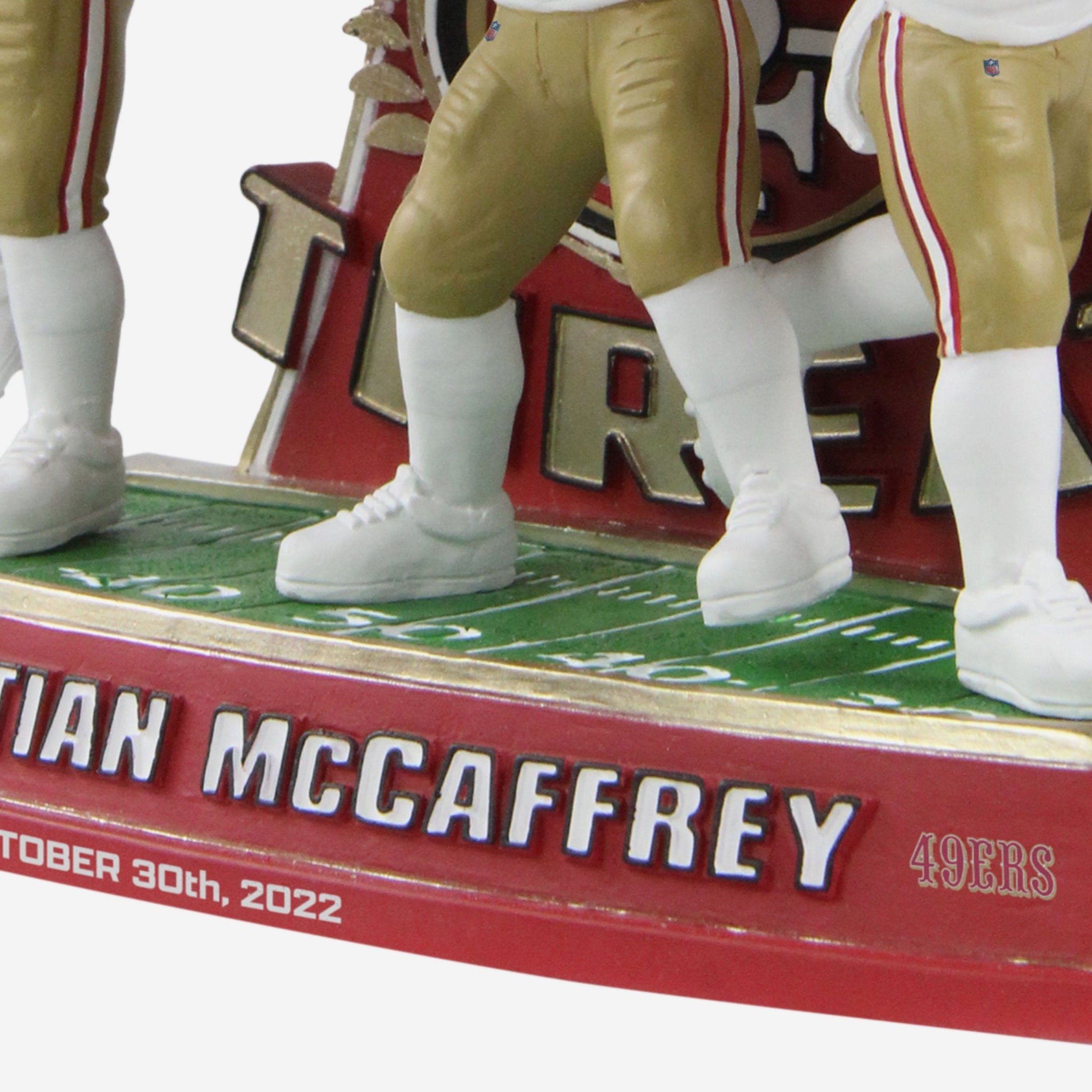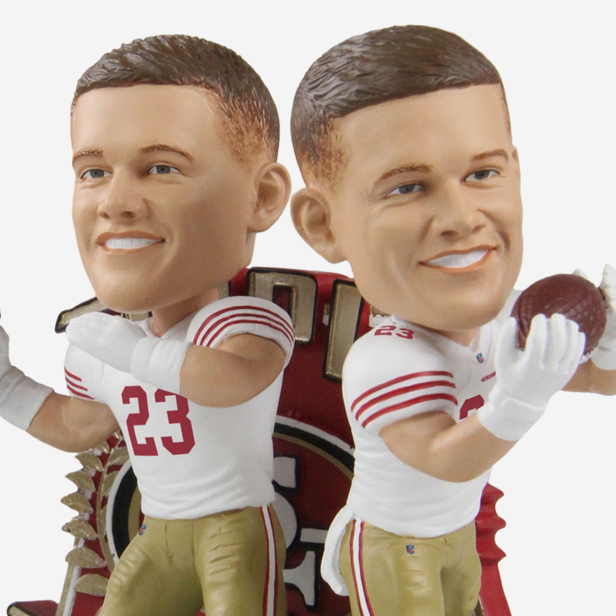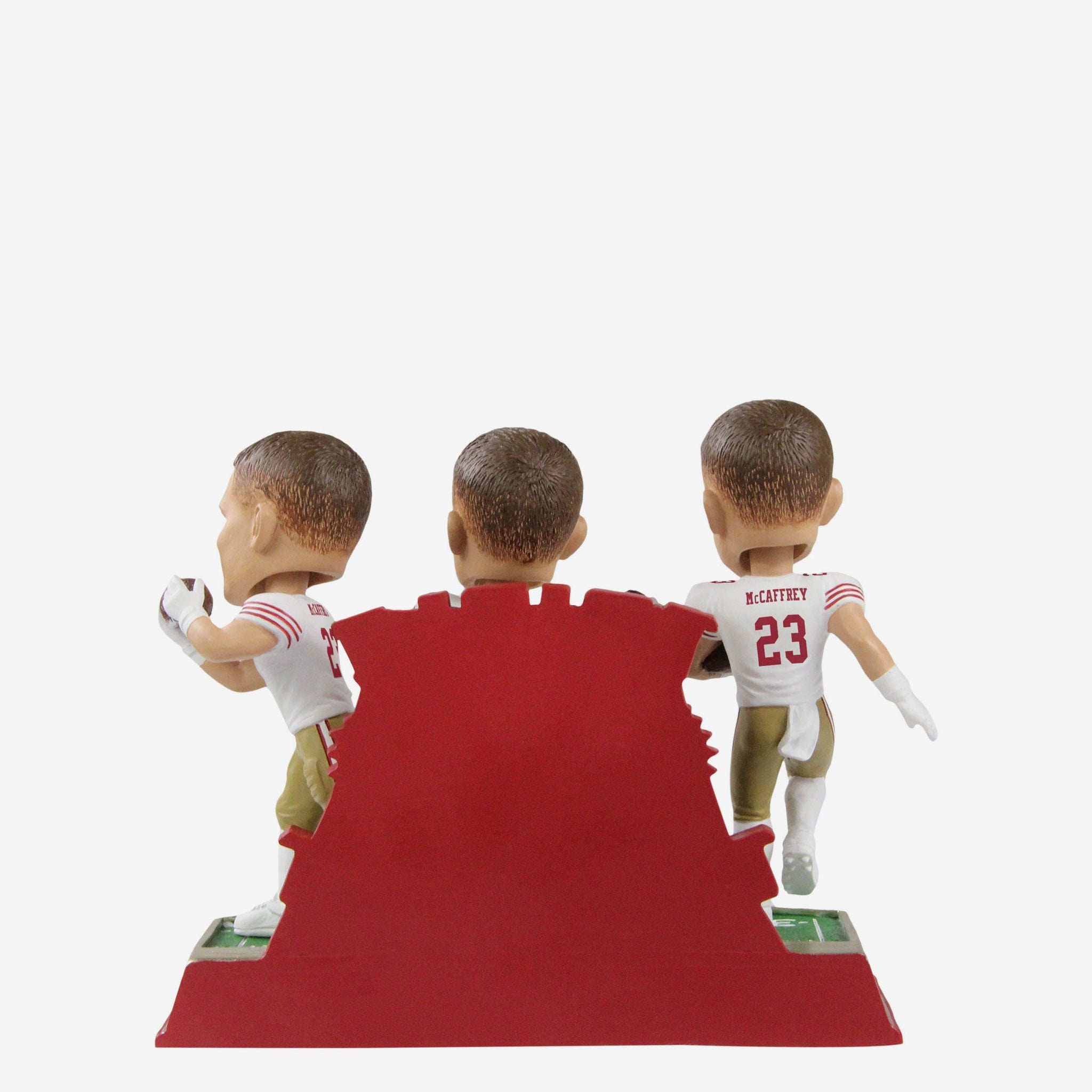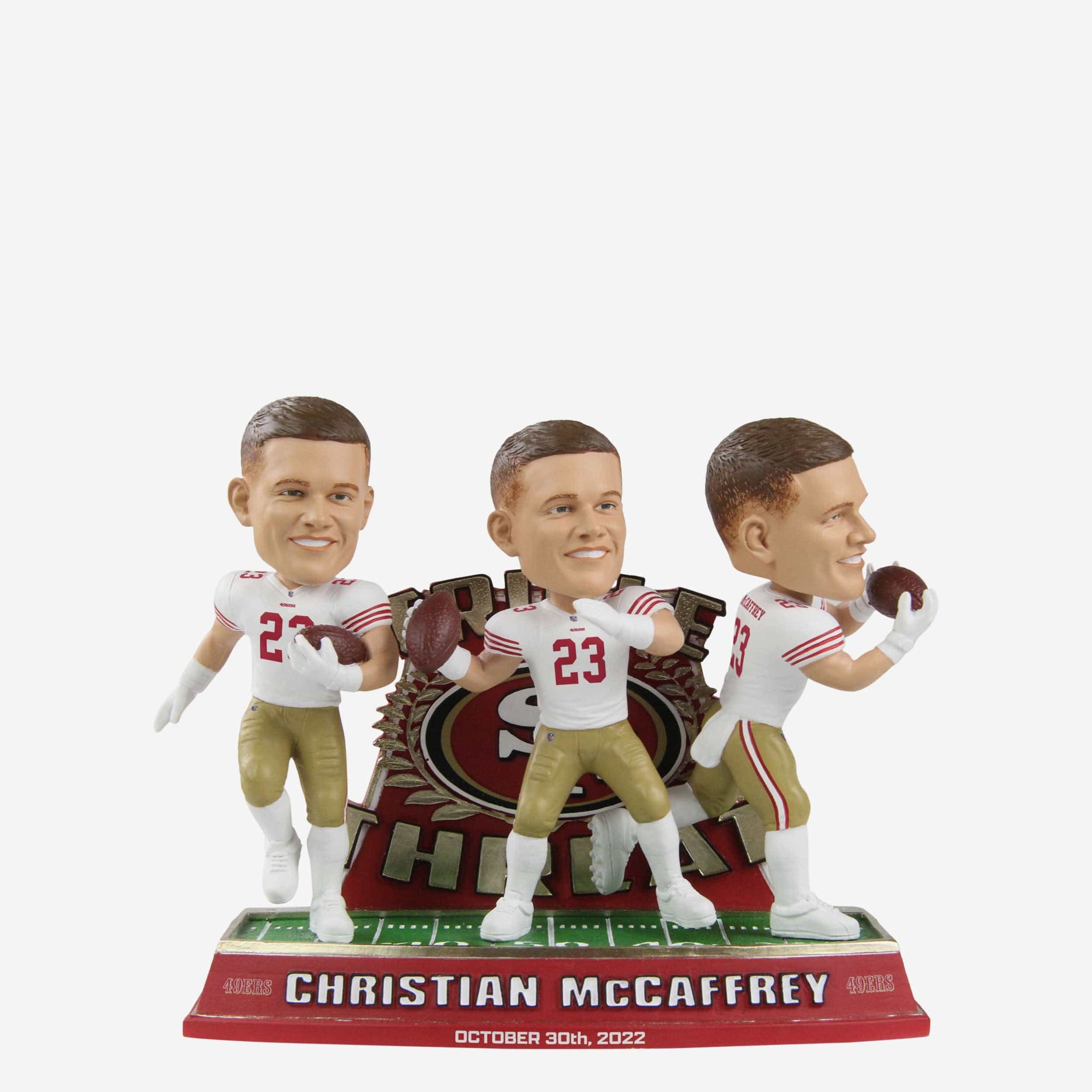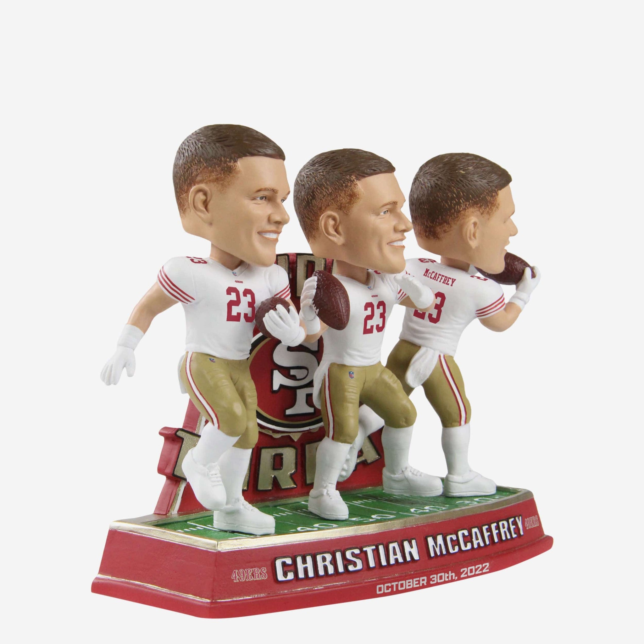 He throws! He catches! He runs! It didn't take long for CMC to wow the San Fran faithful, and you can celebrate his big game with this Christian McCaffrey San Francisco 49ers Triple Threat Bobblehead.