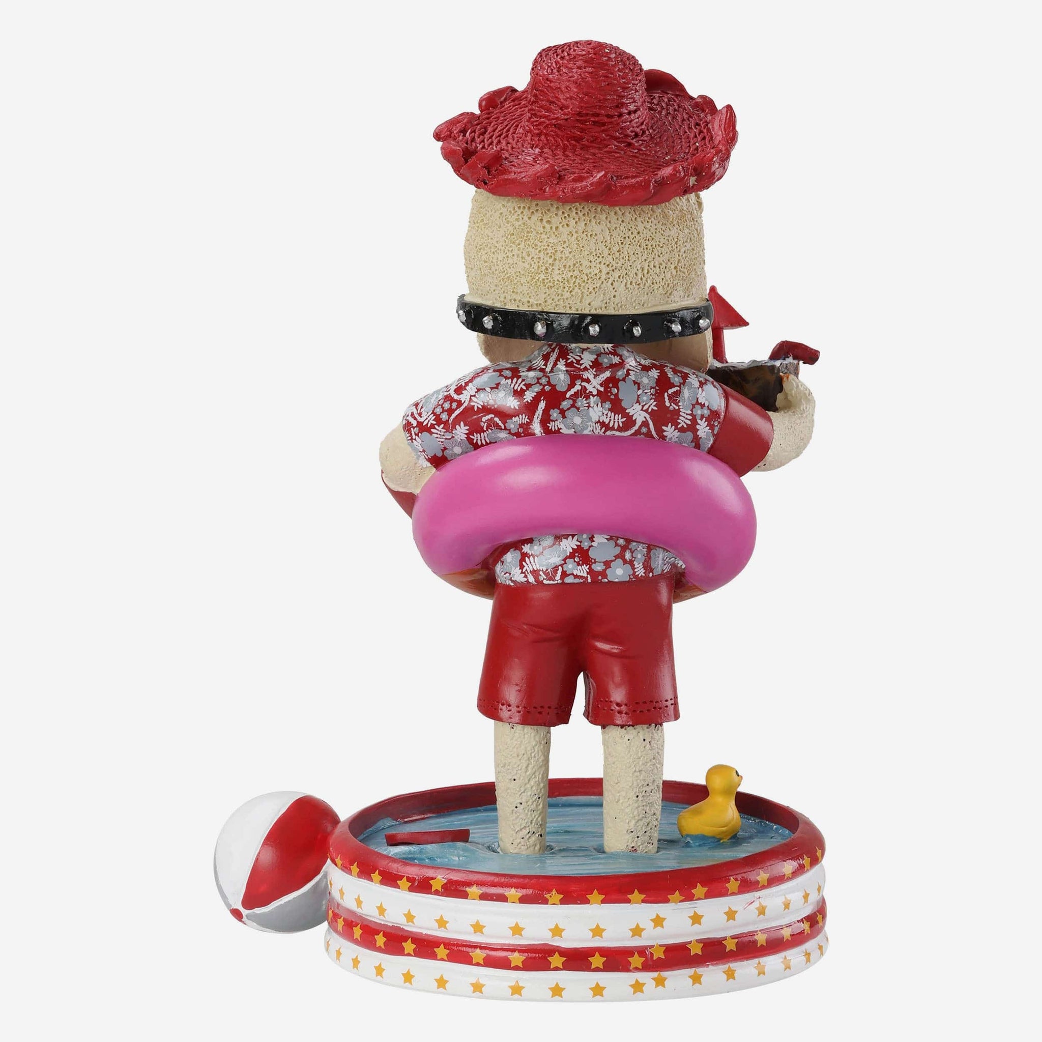 - Portrays mascot standing in a team-colored inflatable pool, posing in a tube and holding a coconut drink, ready to stay cool by the pool
