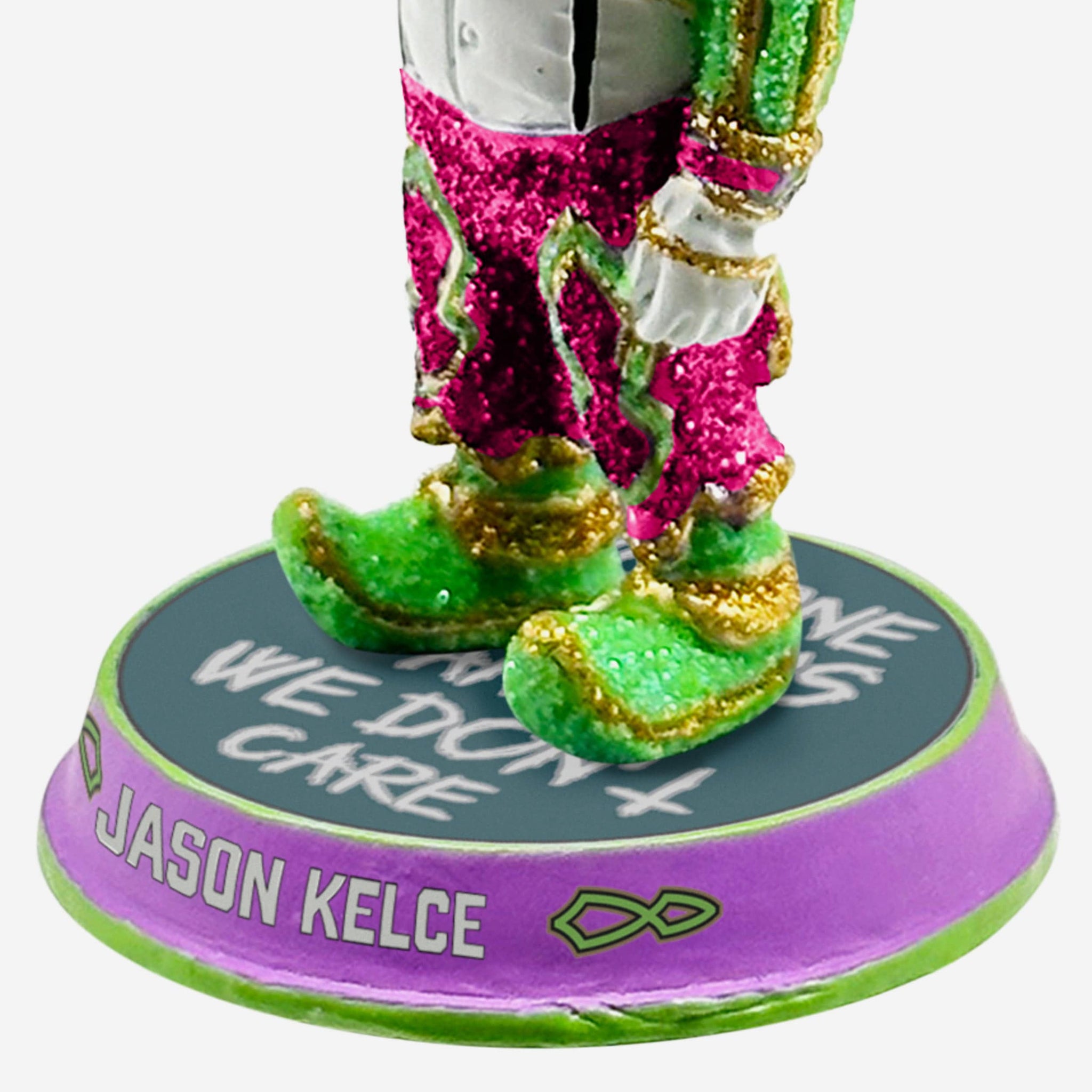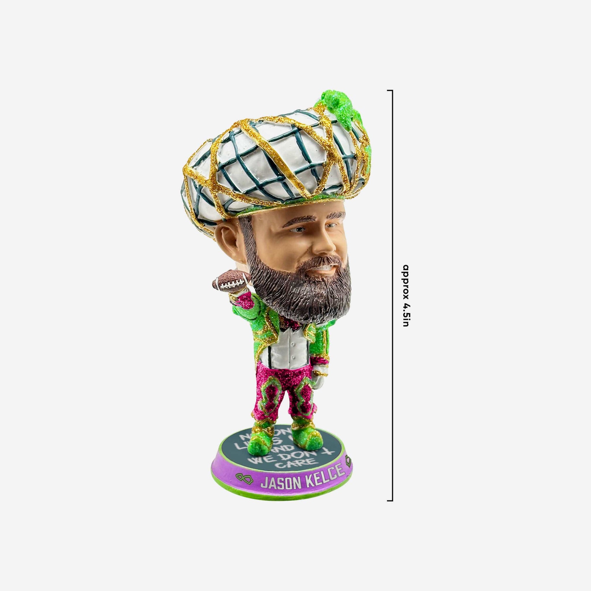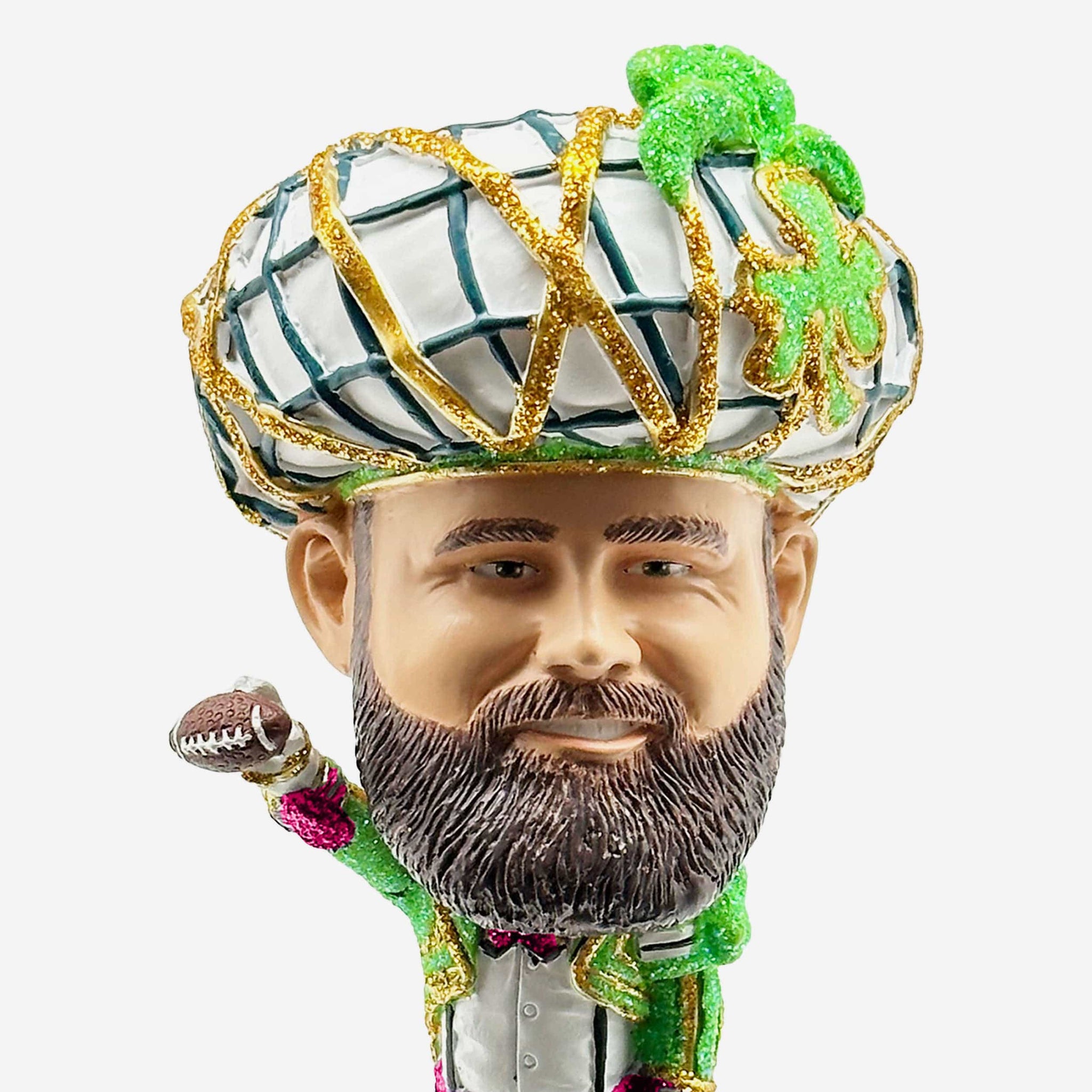 Step up to the championship podium dressed to the nines! It’ll always be time for an epic victory speech with the Jason Kelce Mummer Suit Mini Bighead Bobblehead.
