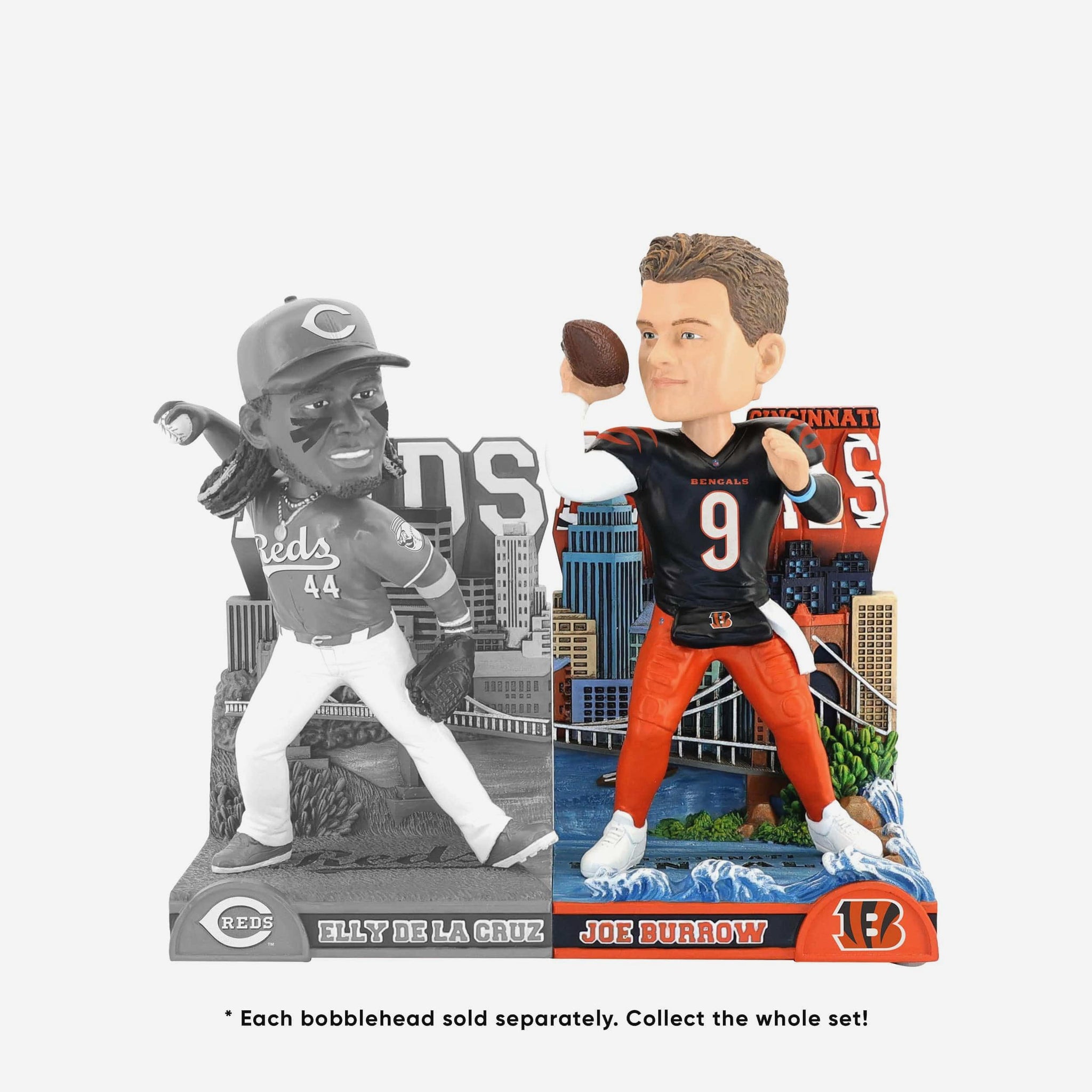 All hustle. All heart. All Queen City. Show your Bengals pride with this Joe Burrow Cincinnati Bengals The Queen City Bobblehead! Complete the Queen City connecting set with the Elly De La Cruz Cincinnati Reds The Queen City Bobblehead.
