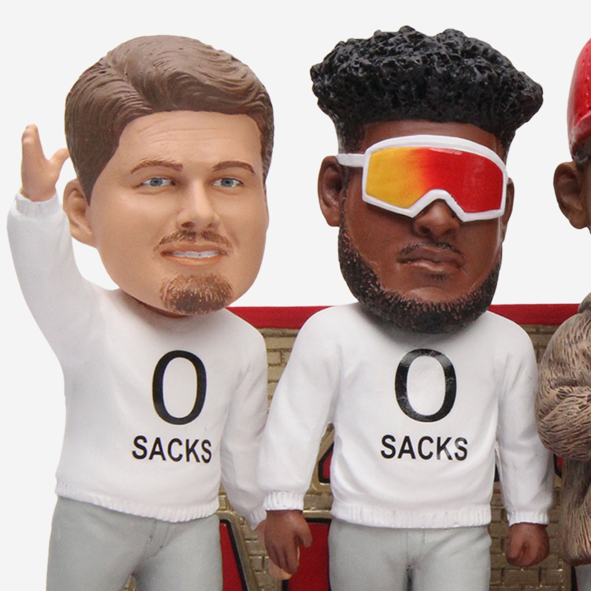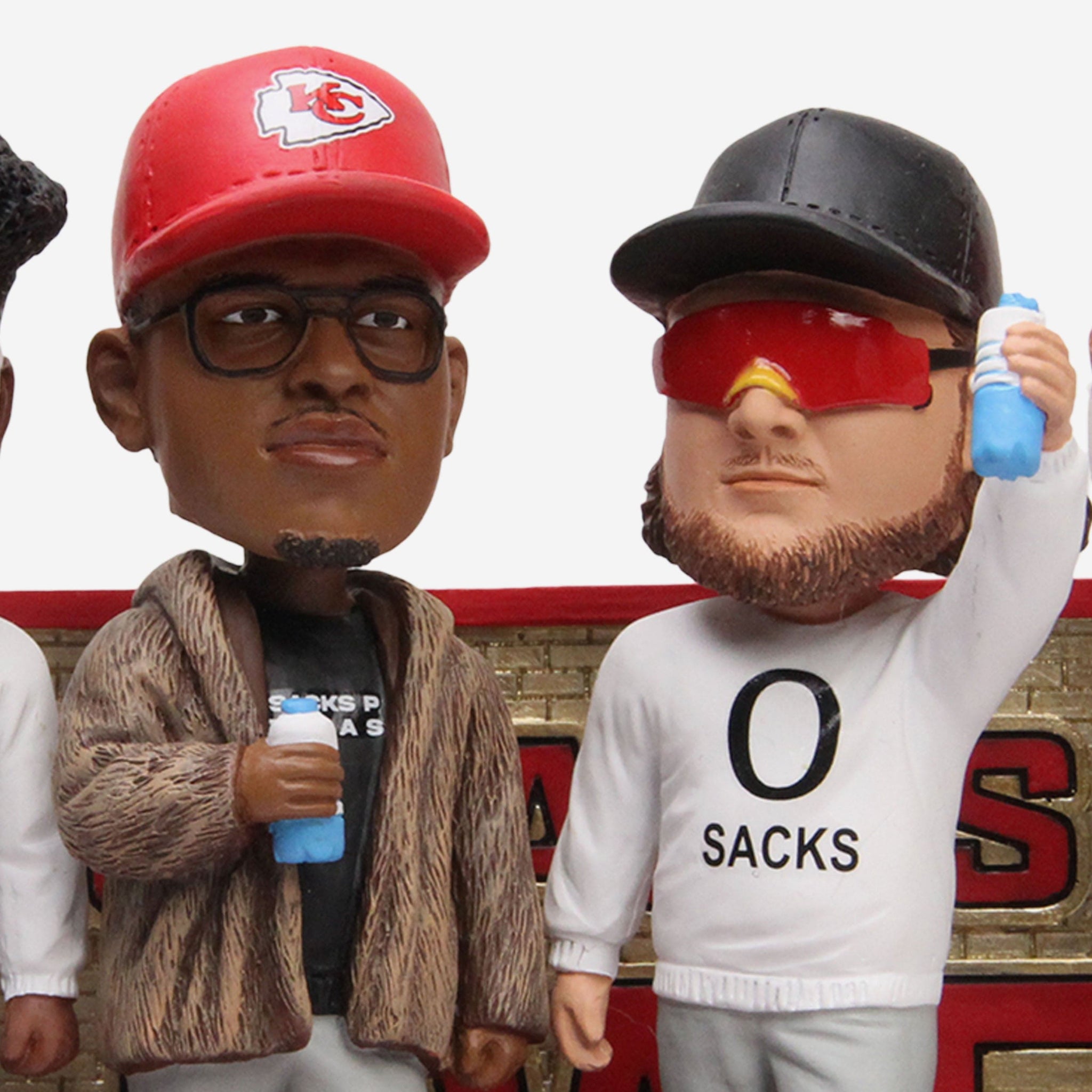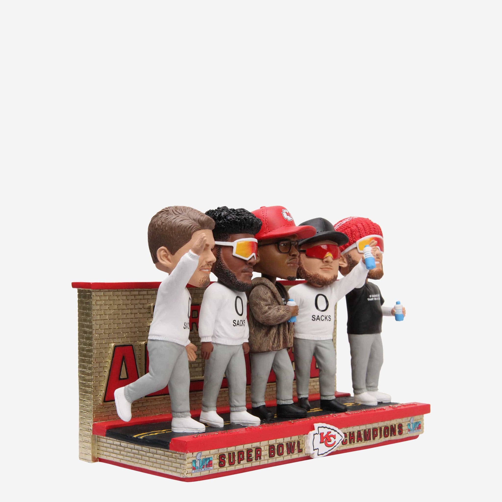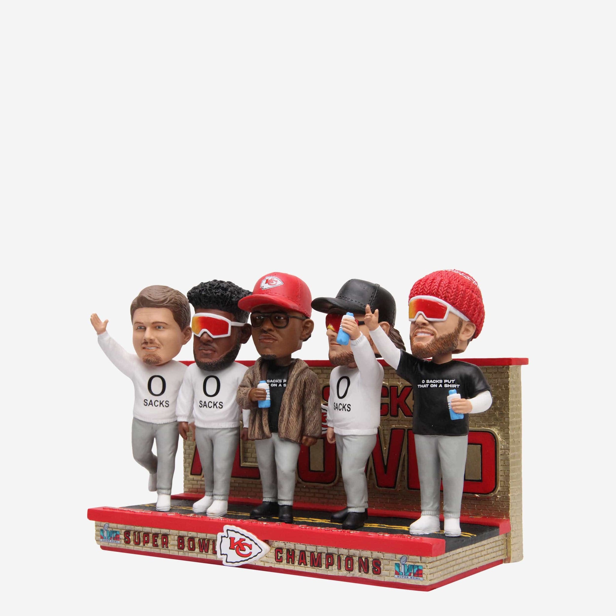 "Zero sacks - Put that on a bobblehead." Well, we did. Pitch a perfect game of pocket protection with the Kansas City Chiefs Super Bowl LVII Champions Offensive Line Zero Sacks Mini Bobblehead Scene.