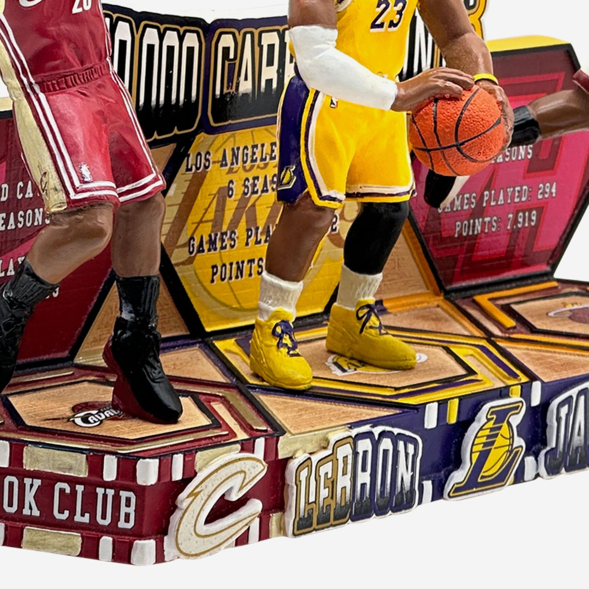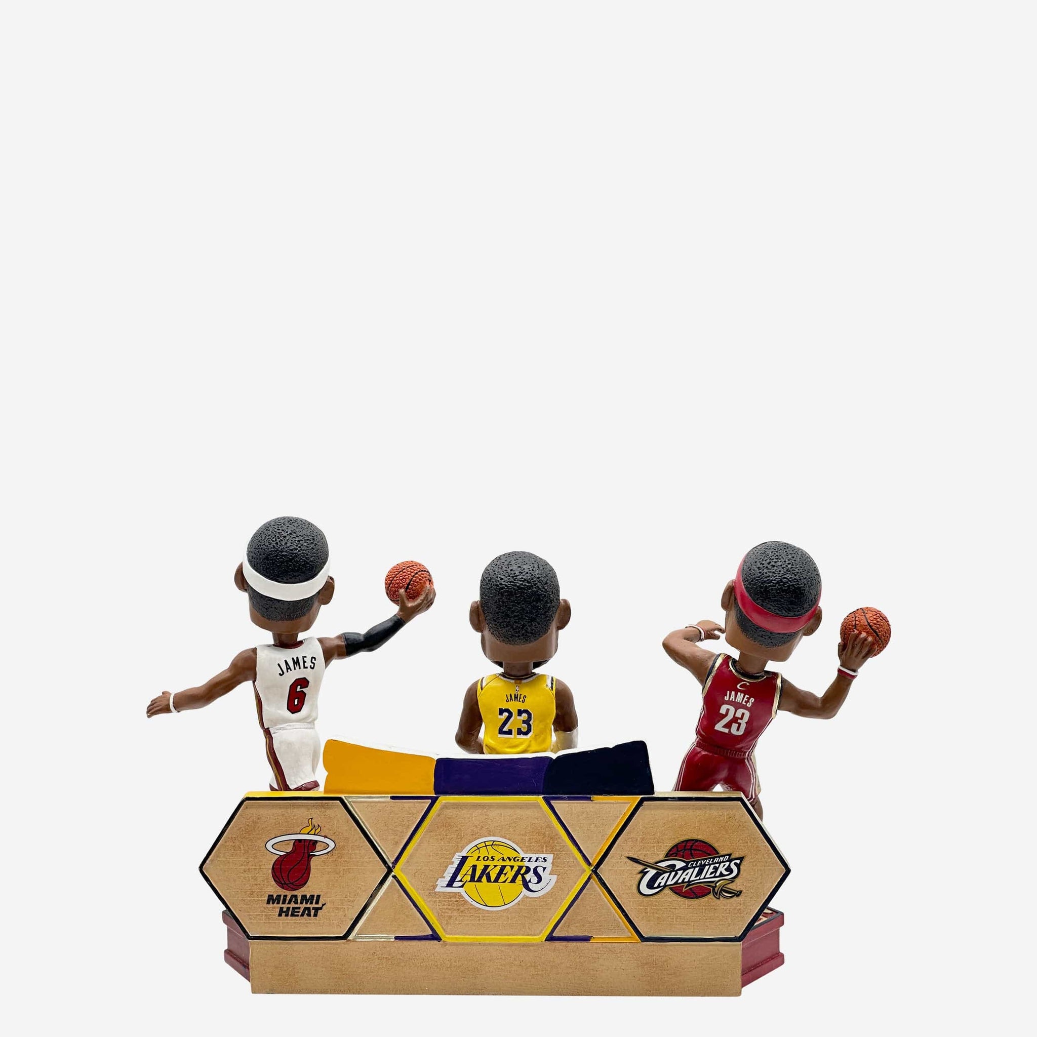 - Portrays three figures of James in his Cleveland Cavaliers, Miami Heat, and Los Angeles Lakers gameday uniforms in action poses for a triple dose of greatness