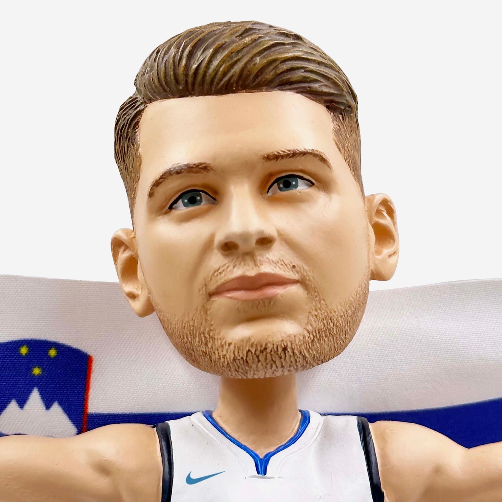 - Portrays Doncic posing in his white gameday uniform and holding a Slovenian flag, repping his home country