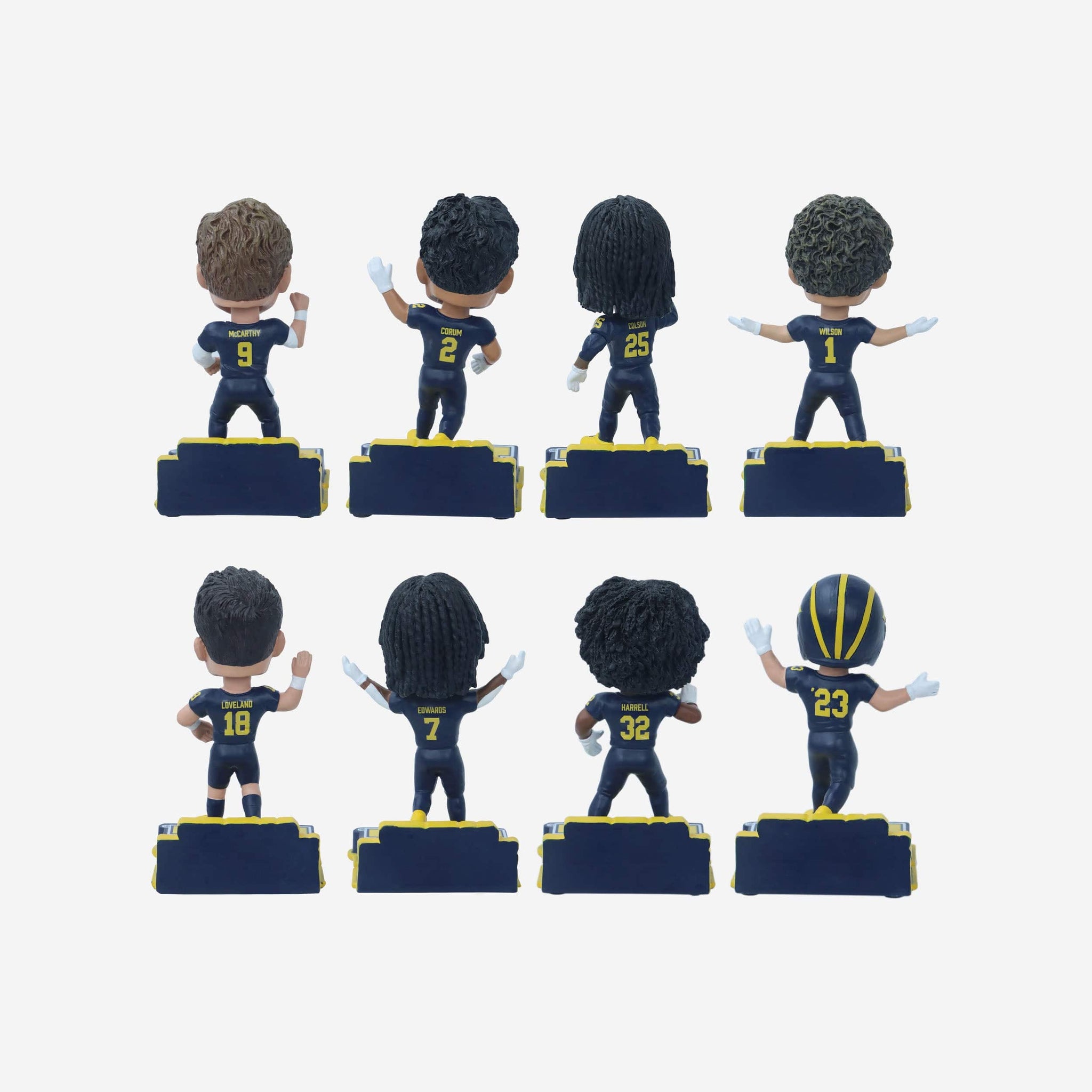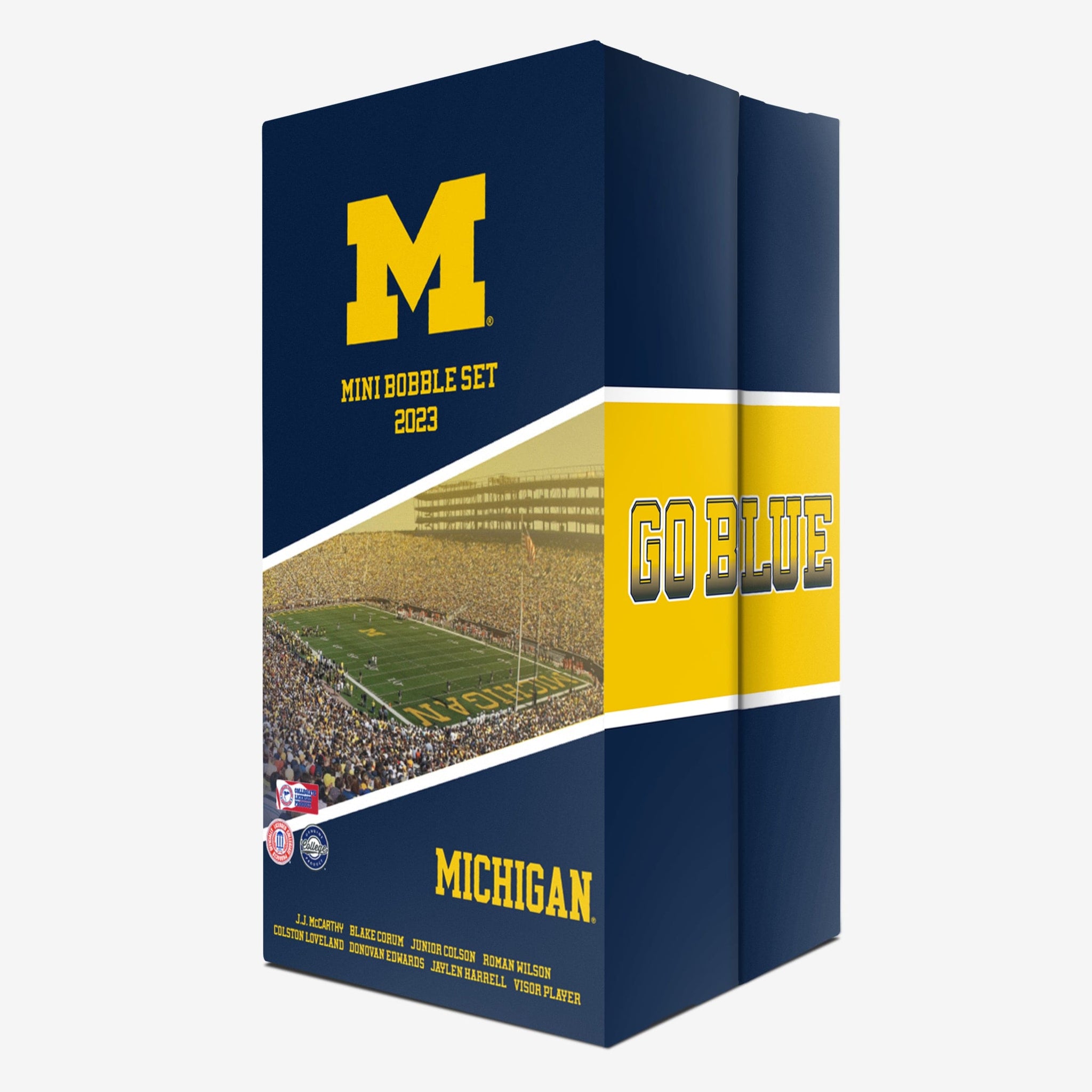 McCarthy. Corum. Colson. Wilson. Loveland. Edwards. Harrell. Michigan. Get ready to Hail to this set of Victors in miniature fashion with the Michigan Wolverines 2023 Football Mini Bobblehead Boxed Set.