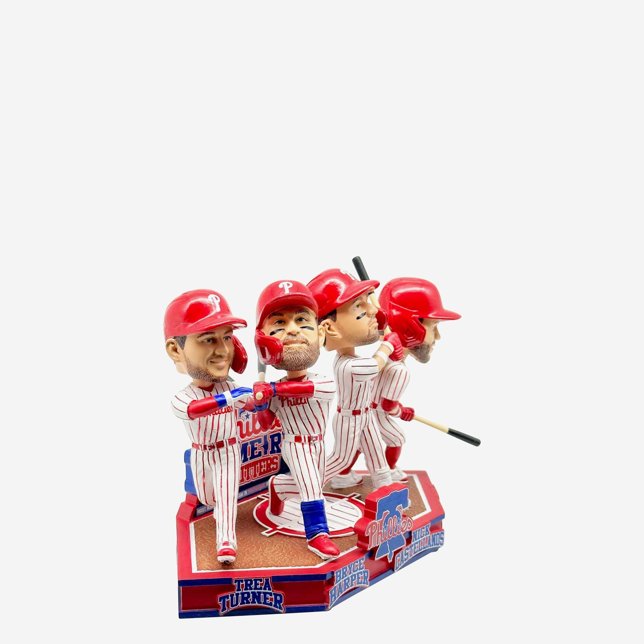 16 home runs in five games? That's not just impressive. That's historic. Step up to the plate and swing away with the Red October wrecking crew of Bryce Harper, Nick Castellanos, Kyle Schwarber, and Trea Turner with the Philadelphia Phillies Postseason Home Runs in Five Game Span Record Mini Bobblehead Scene.