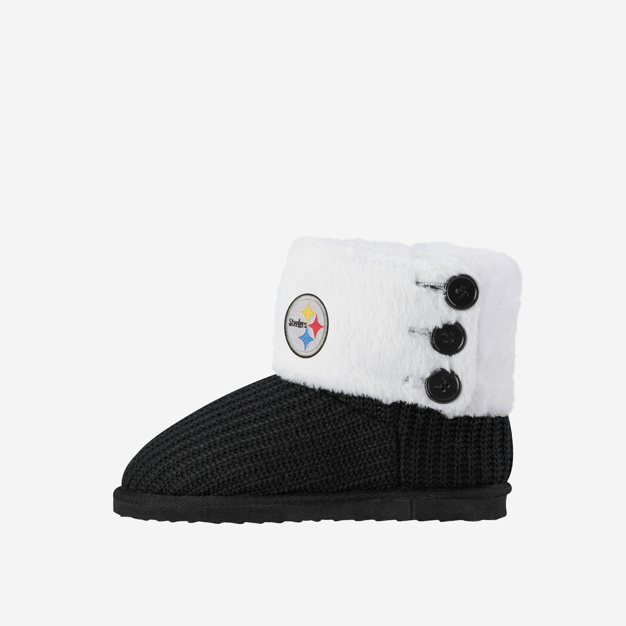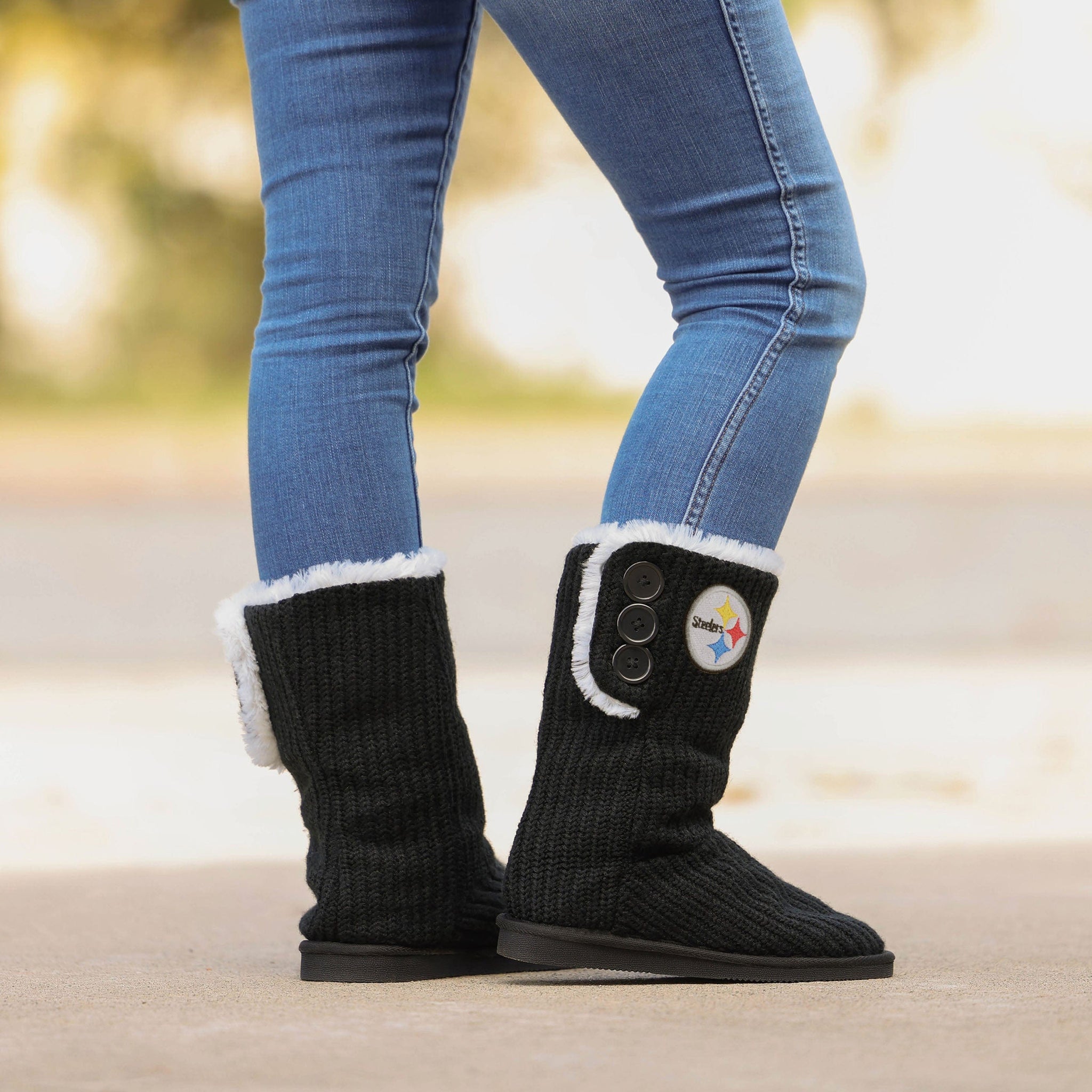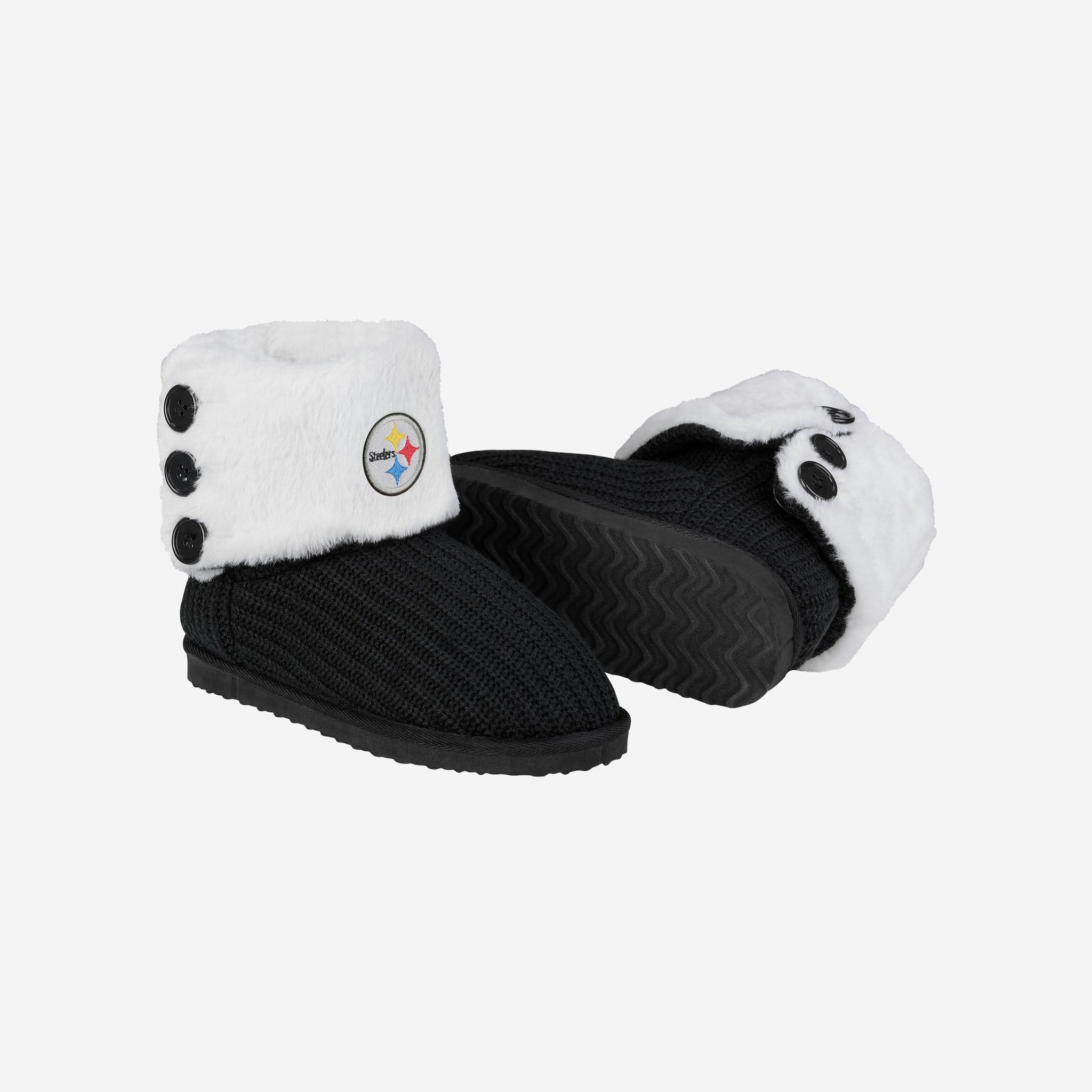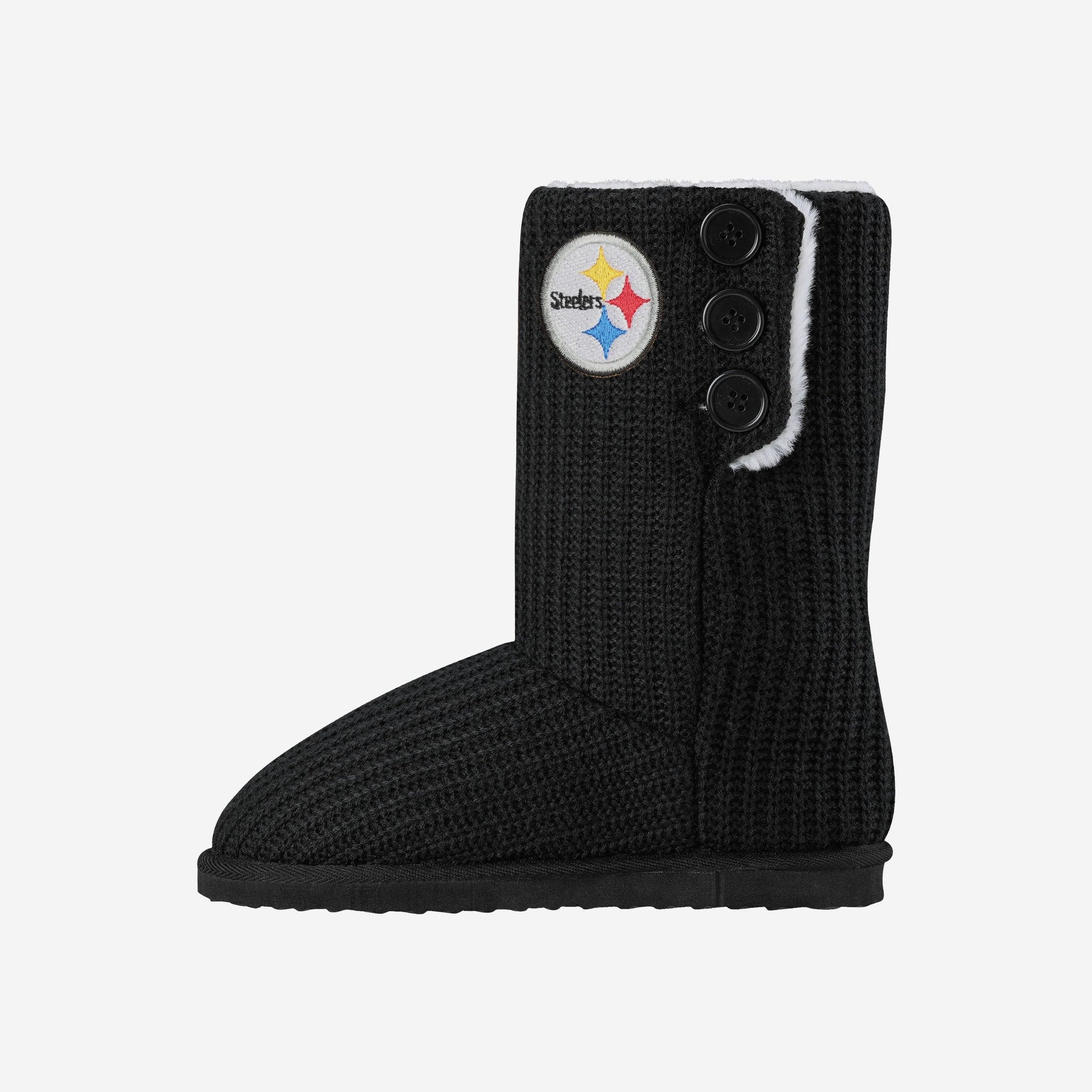 These Pittsburgh Steelers Knit High End Button Boot Slippers are perfect for rocking your team spirit from head to toe, or keeping yourself warm and comfortable while you sneak downstairs for that secret midnight snack. No judgment here.
