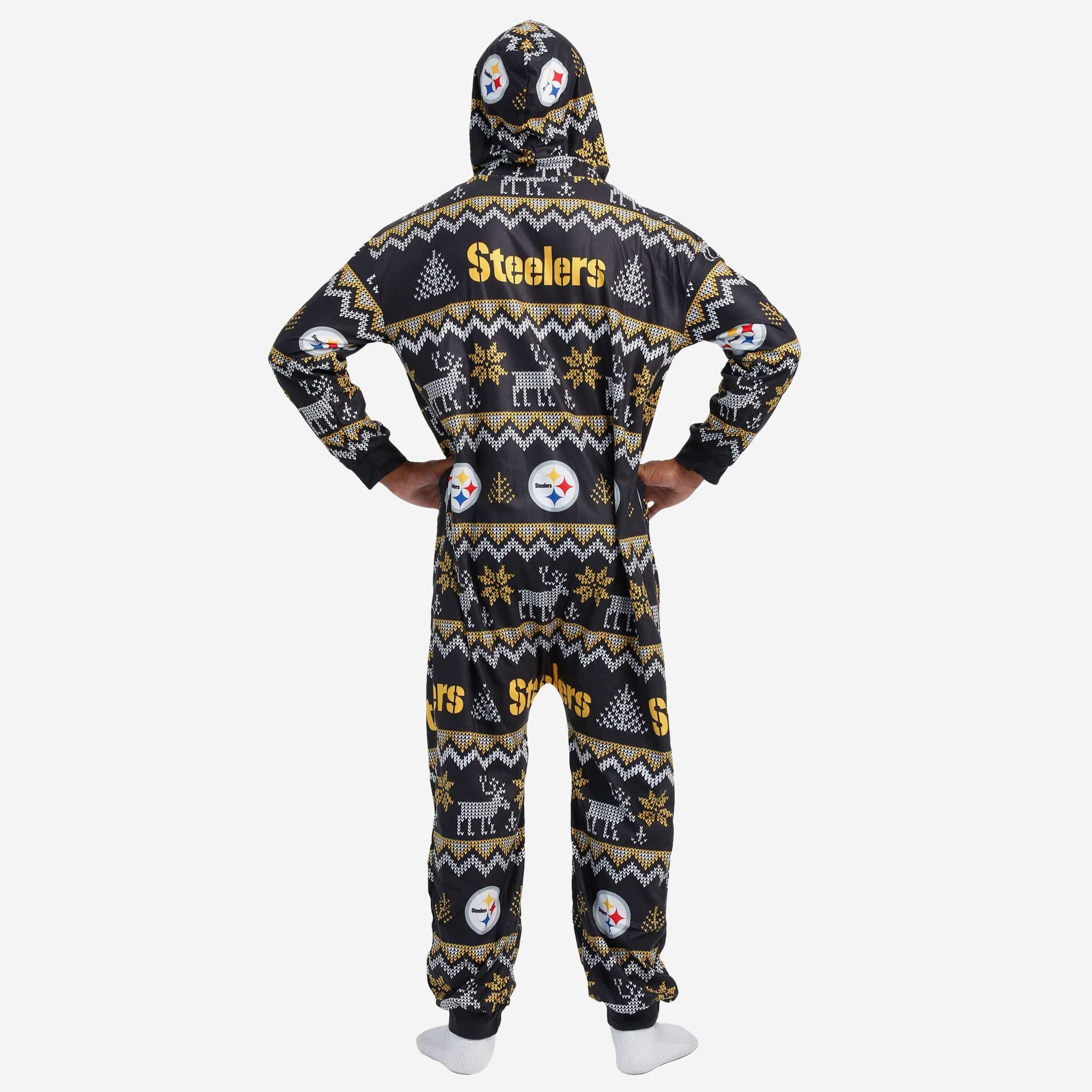 Get some matching family pajamas and dress to impress this holiday season! You won't want to miss these onesie team pajamas! These men's and women's PJ's are comfortable and show off your team spirit in the form of some sweet one piece jammies. Introducing the Pittsburgh Steelers Ugly Pattern One Piece Pajamas! Don't forget to take your holiday photo with the whole family wearing matching Christmas pajamas!
