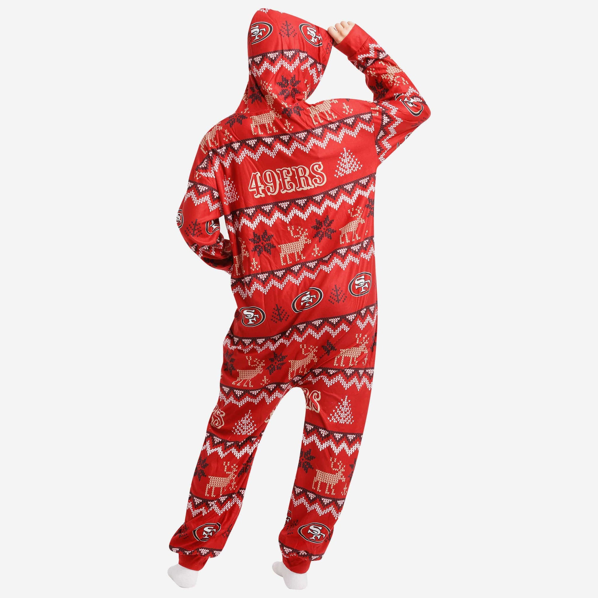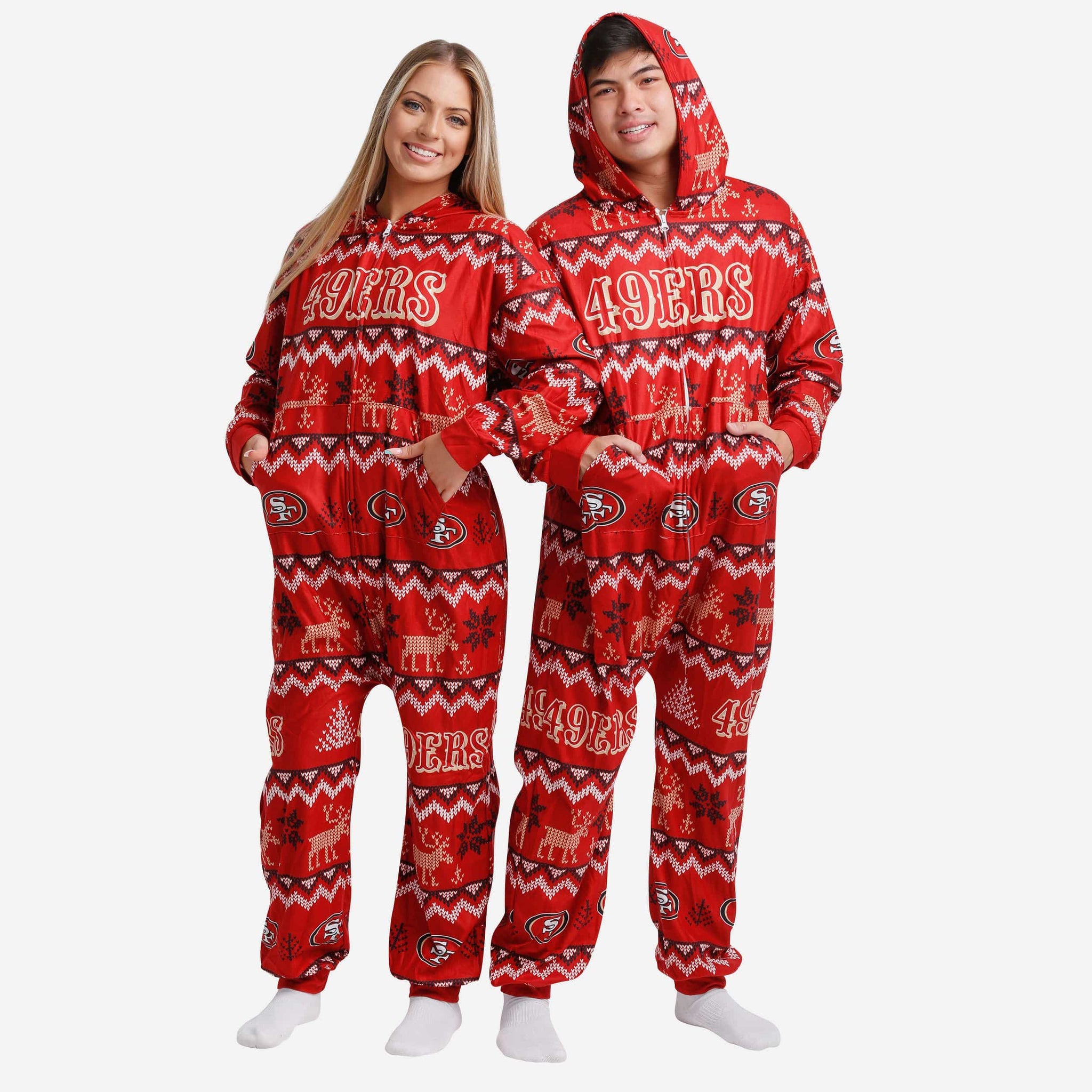 Get some matching family pajamas and dress to impress this holiday season! You won't want to miss these onesie team pajamas! These men's and women's PJ's are comfortable and show off your team spirit in the form of some sweet one piece jammies. Introducing the San Francisco 49ers Ugly Pattern One Piece Pajamas! Don't forget to take your holiday photo with the whole family wearing matching Christmas pajamas!