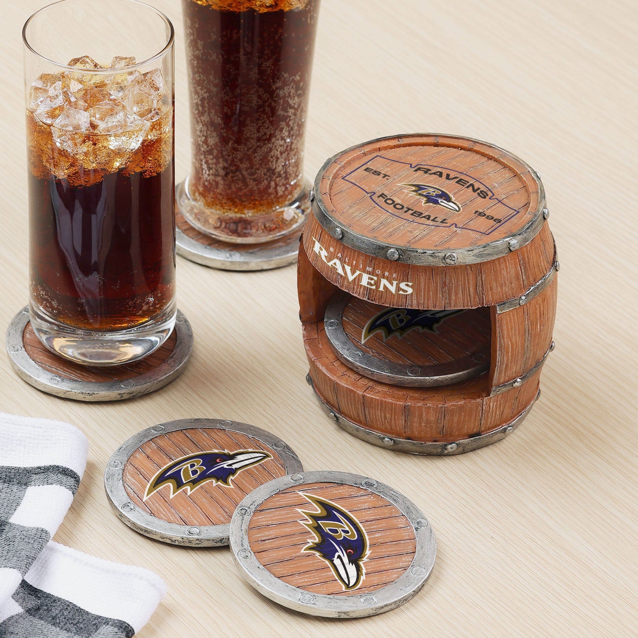 Championship rings? Yay! Unsightly rings on the coffee table? Boo! Break out the beverages worry-free and get ready for every watch party with this Baltimore Ravens 5 Pack Barrel Coaster Set.