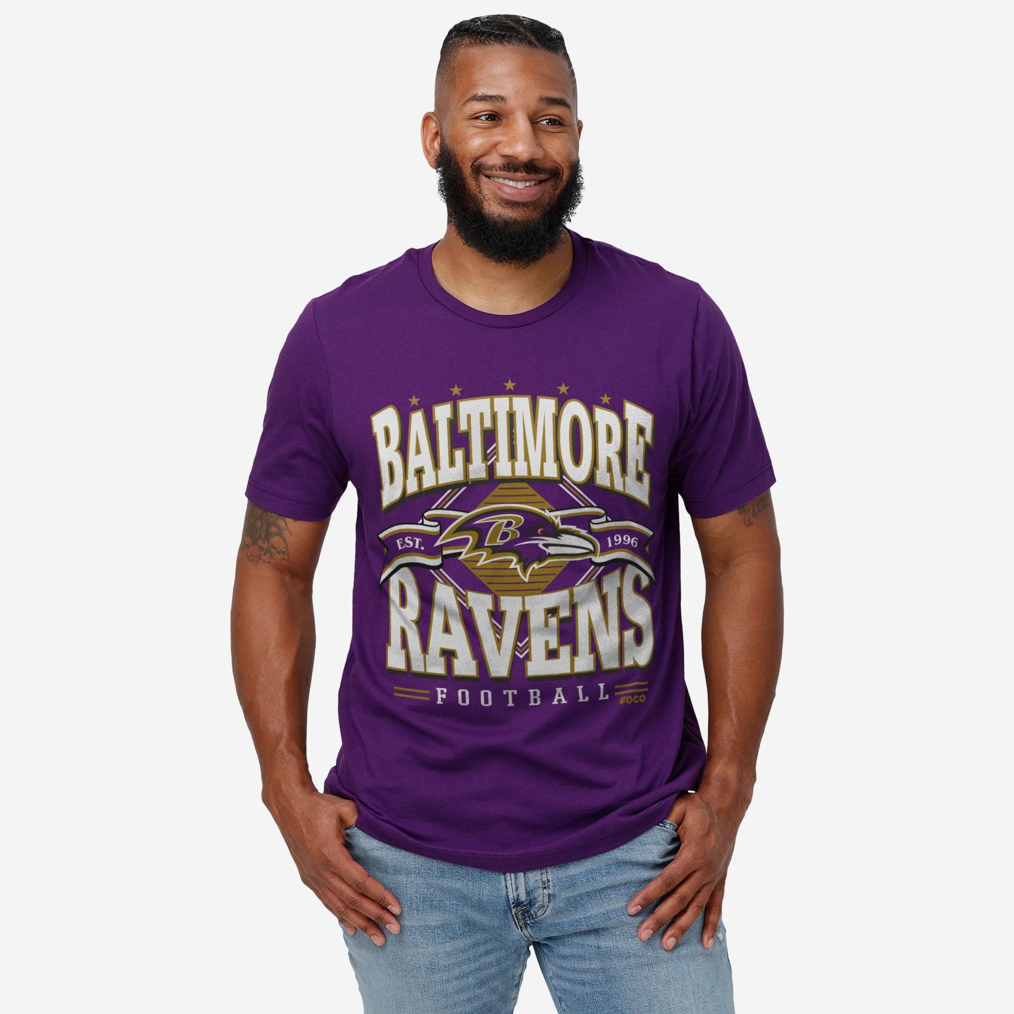 - All-over, team-colored design: This traditional t-shirt shows off the official Baltimore Ravens colors in an all-over, team-colored design, so you can show your team spirit with pride.