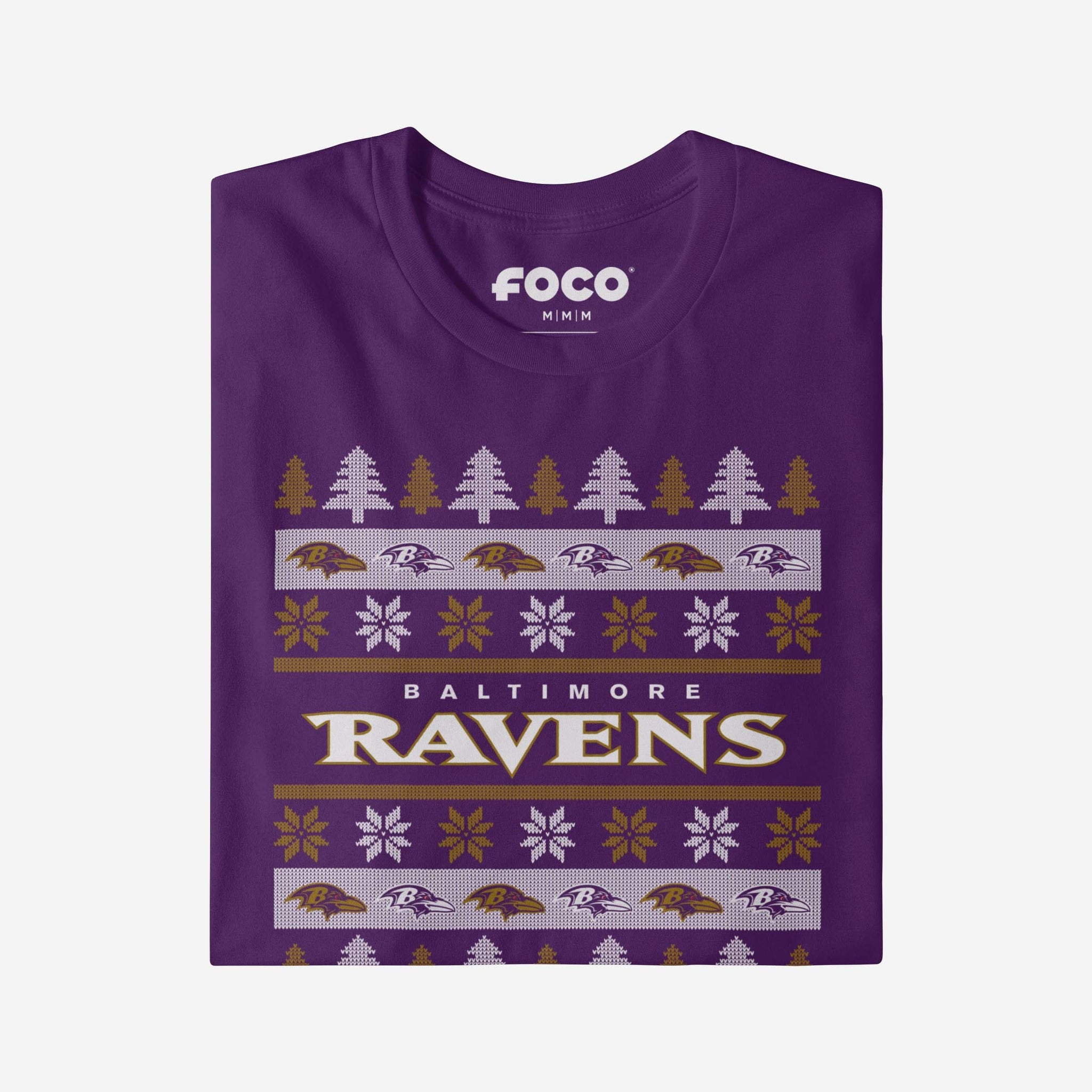 - Festive, team-colored design: This traditional t-shirt shows off the official Baltimore Ravens colors in an all-over team-colored design with winter tree and snowflake accents, so you can show your team spirit with pride.