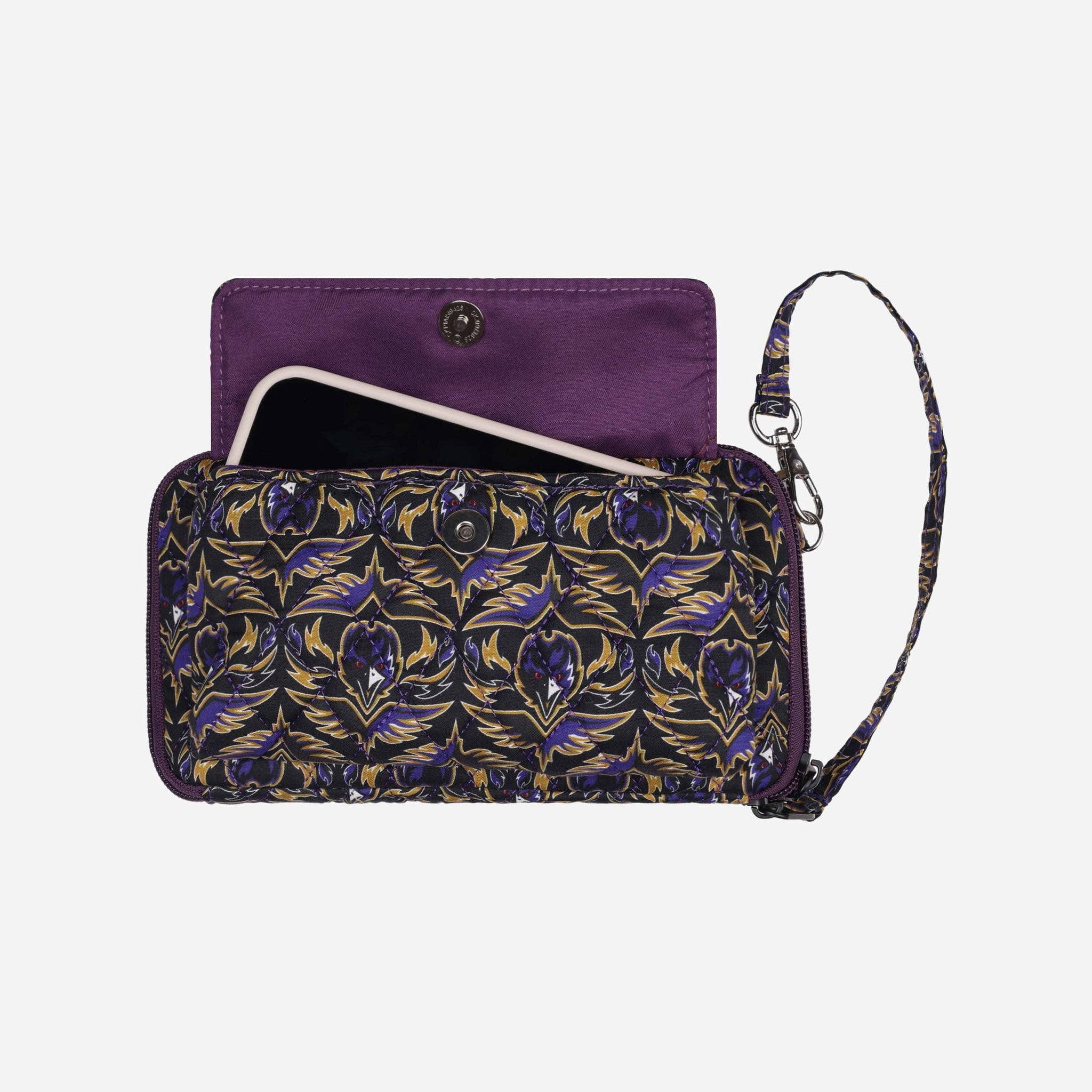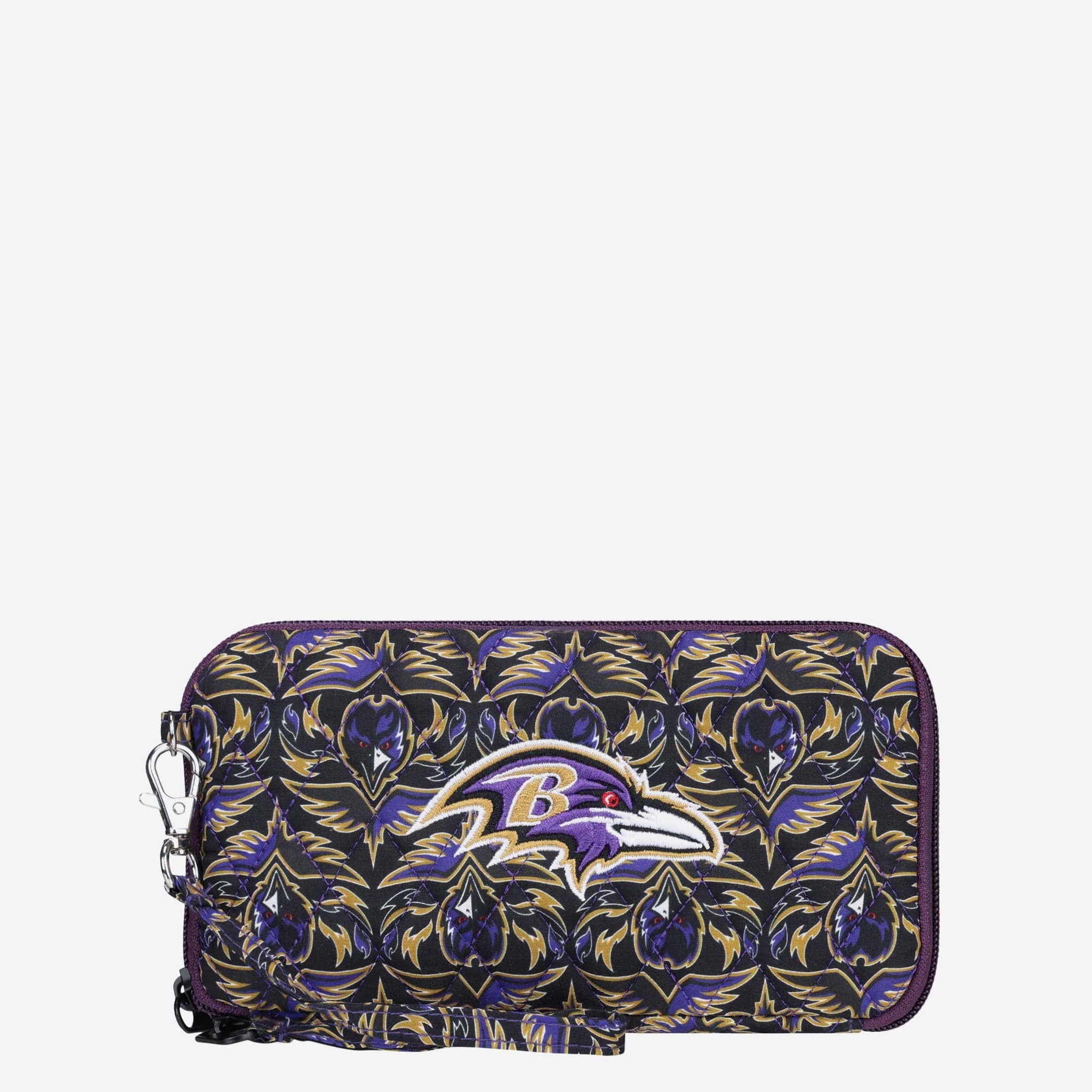 Get ready to fashionably flaunt your fandom! Keep your essentials close and your team pride on display with the Baltimore Ravens Quilted Printed Wristlet.