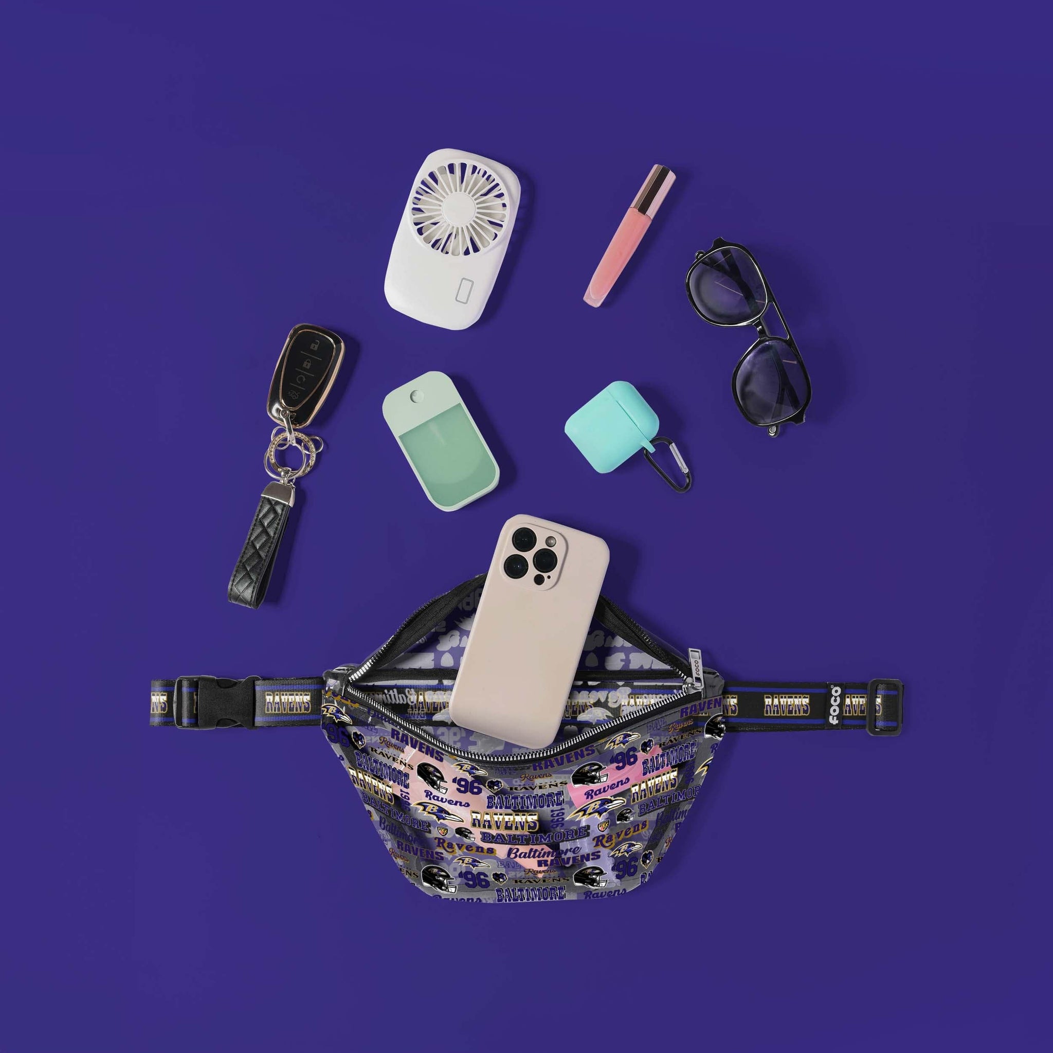• Repeat Baltimore Ravens current and retro team logo and wordmark displays on the fanny pack, in case there were any doubts where your allegiances lie