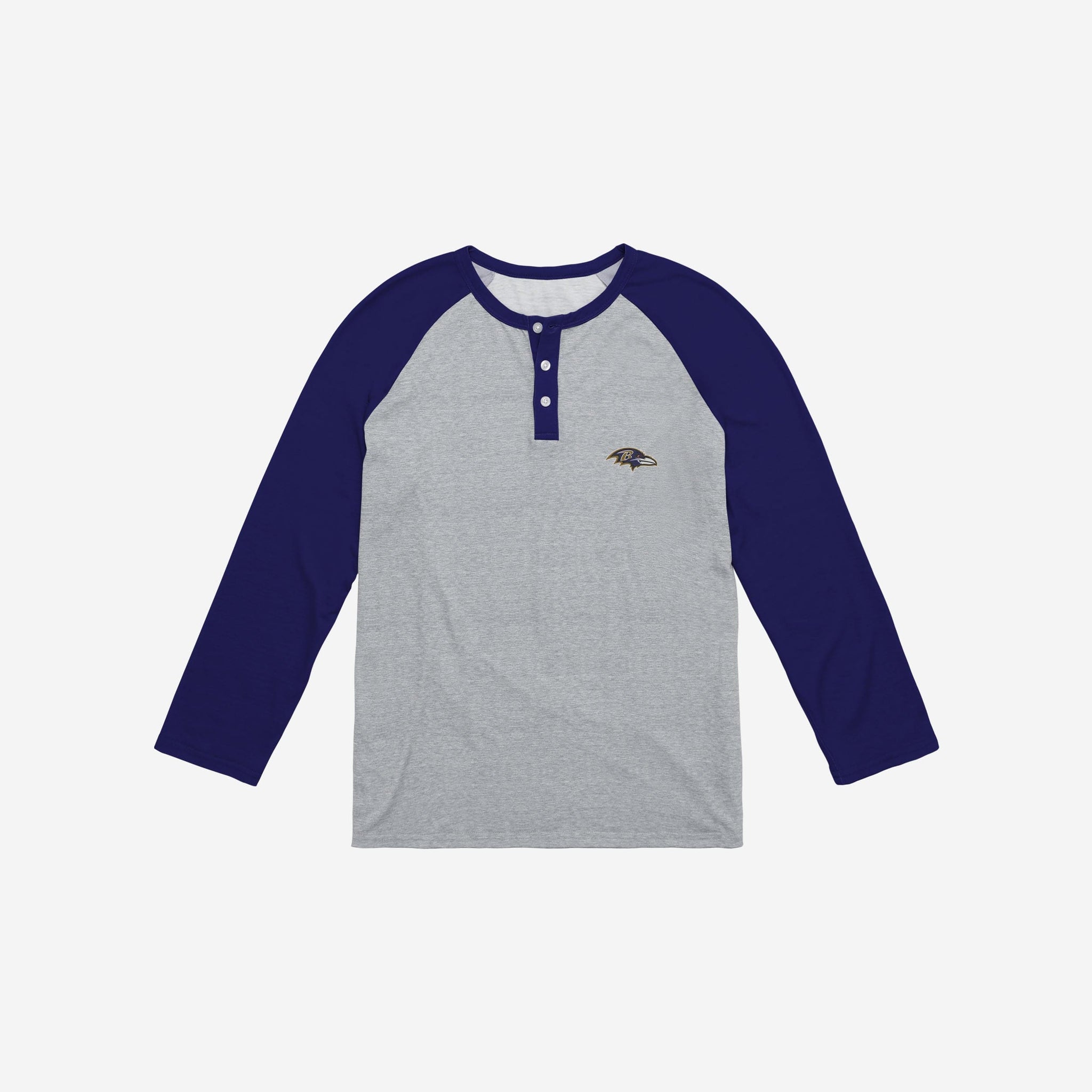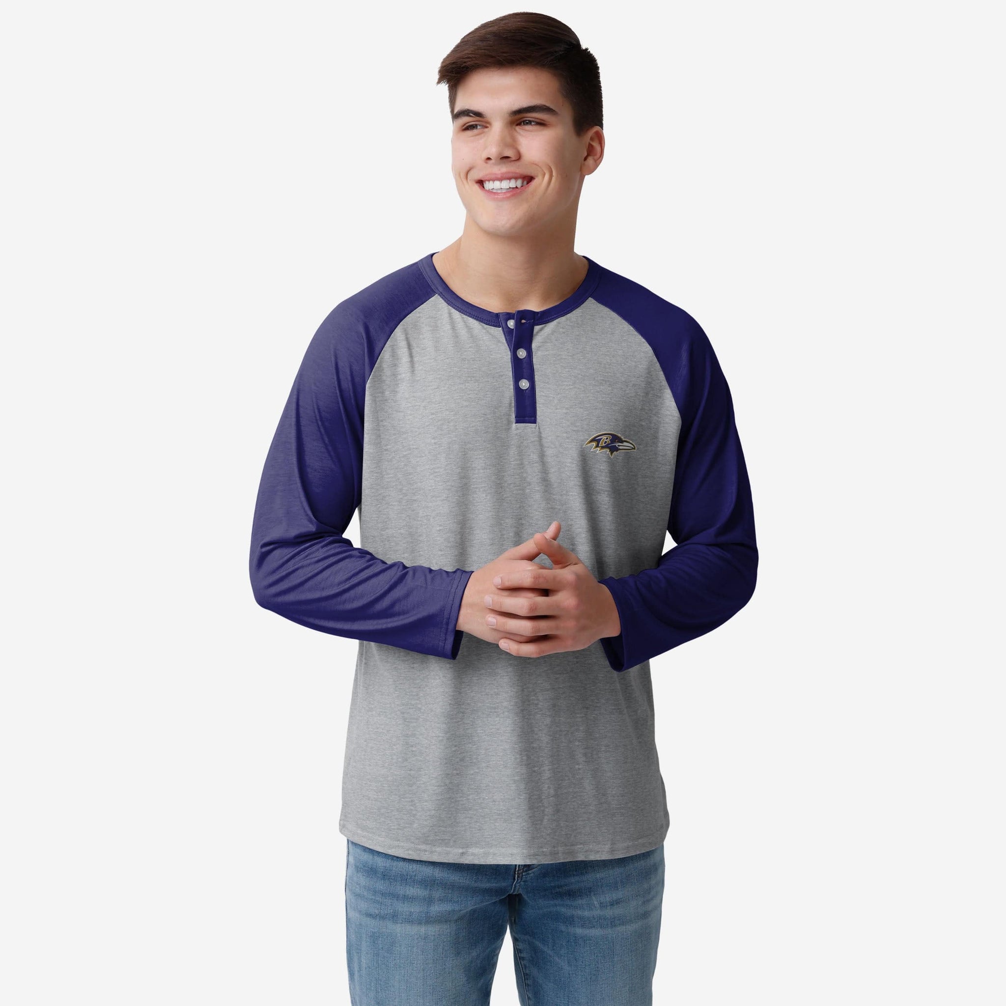 Even on the sunniest of days, there's nothing wrong with a little gray. Win the day in style with this Baltimore Ravens Team Logo Gray Long Sleeve Henley.