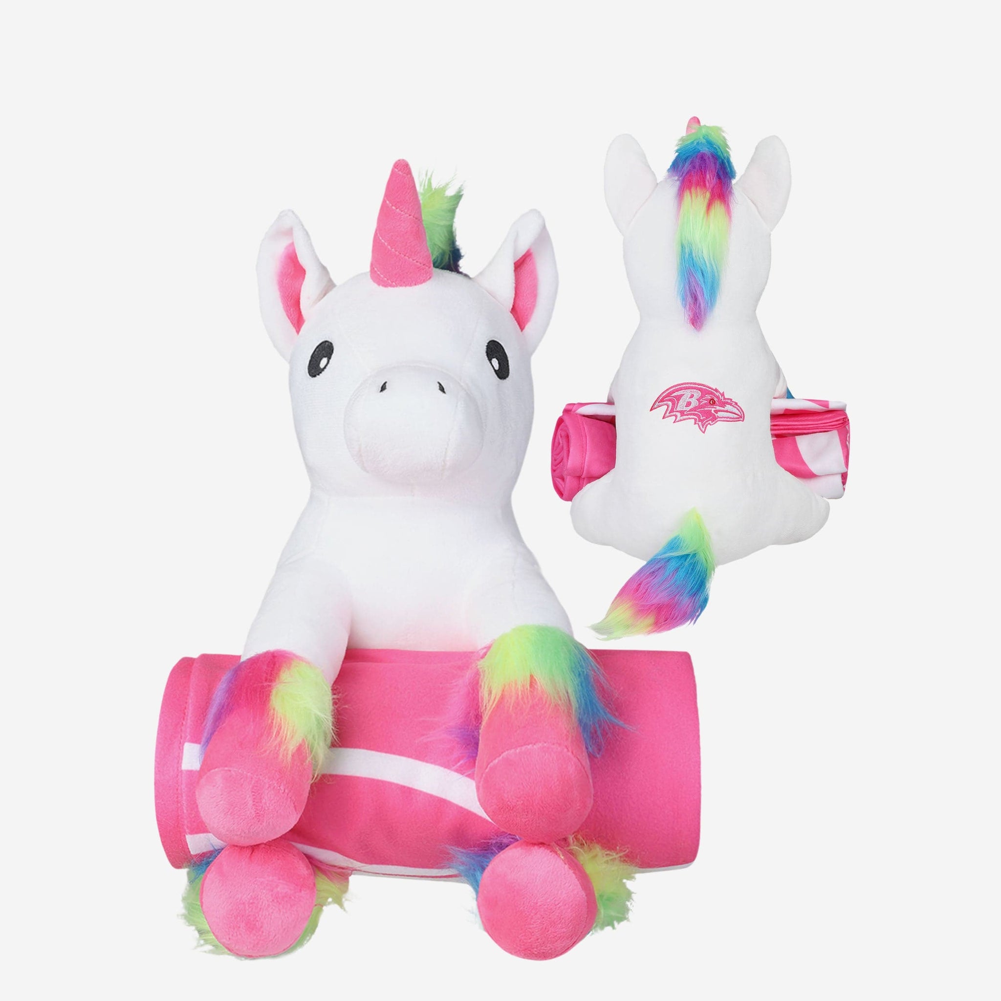 Your young fan's newest, magical teammate is here! Enjoy the sky-piercing glory of this Baltimore Ravens Throw Blanket with Plush Unicorn!