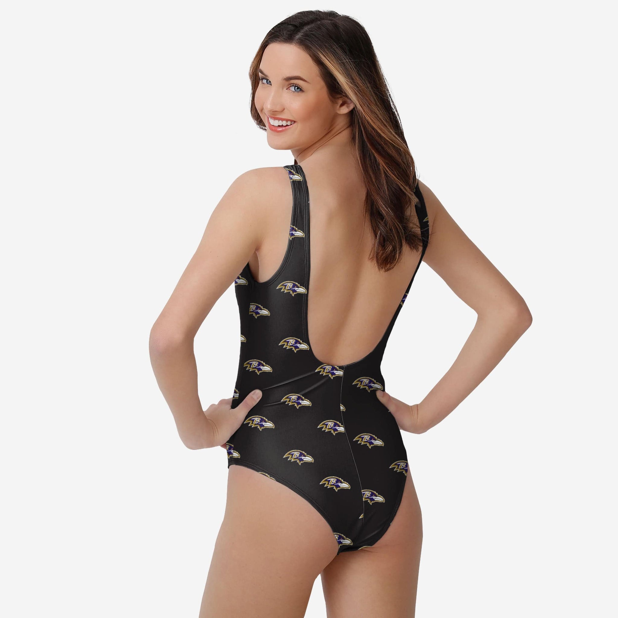 Meet your newest summer love! Everyone will shore-ly know where your allegiances lie when you're rocking this Baltimore Ravens Women's Mini Print One Piece Bathing Suit at the beach or by the pool.