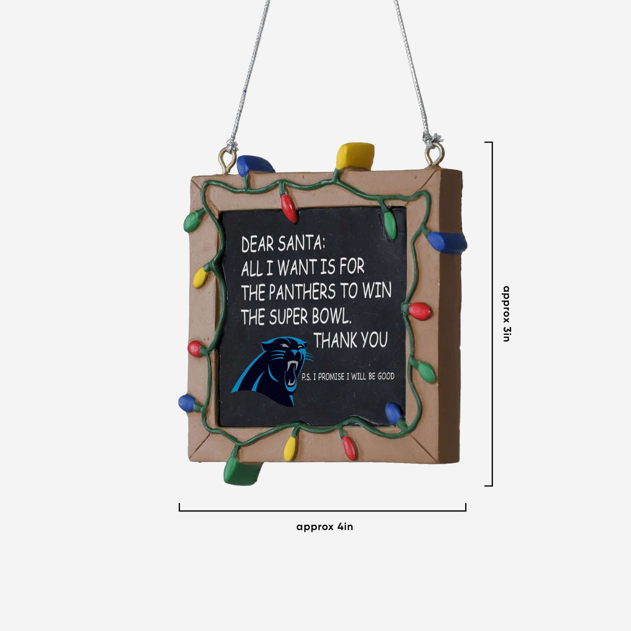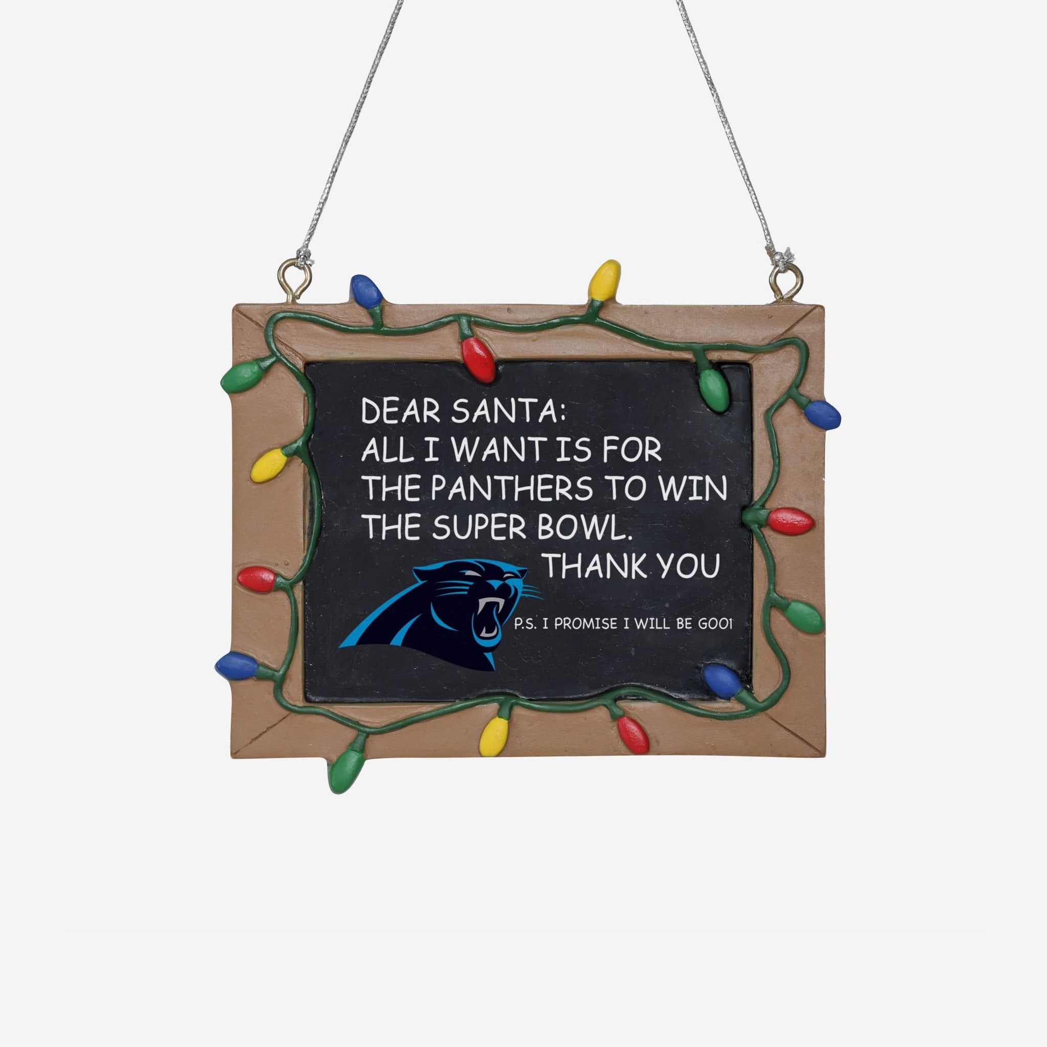So, you made your list and sent it to jolly ol' Fanta Claus, asking him for a championship. But sometimes letters can get lost in the mail. Just in case, put this Carolina Panthers Resin Chalkboard Sign Ornament on your tree to let him know how good you've been this year, and that all you want for the holidays is a trophy.