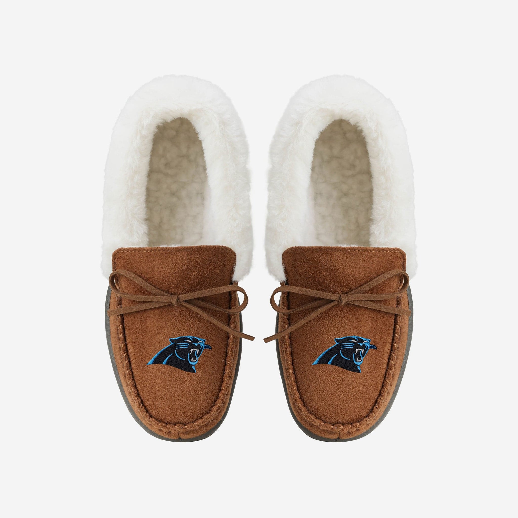 When you rocc these moccs, you can be an MVP on the couch watching TV! Introducing the Carolina Panthers Women's Tan Moccasin Slippers!