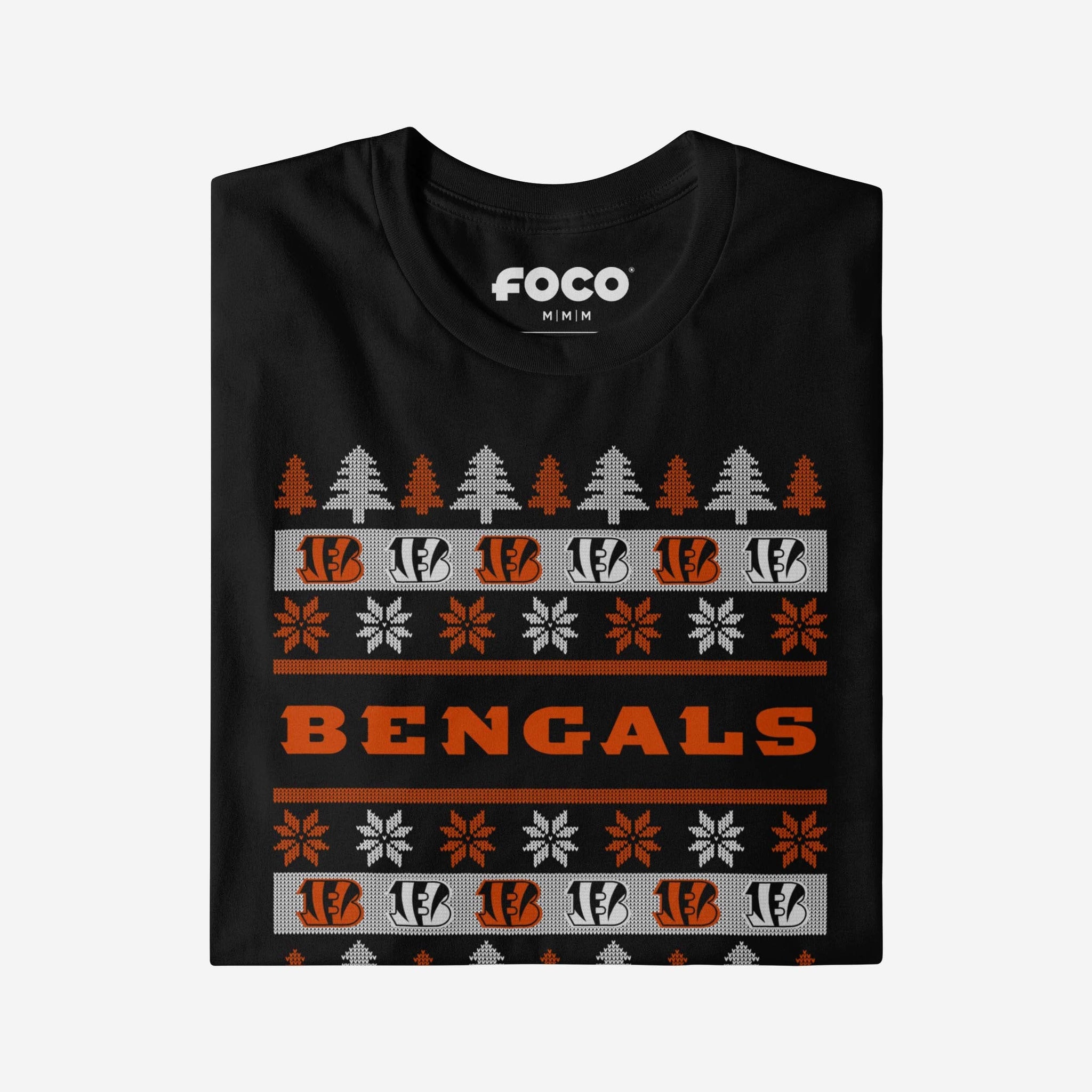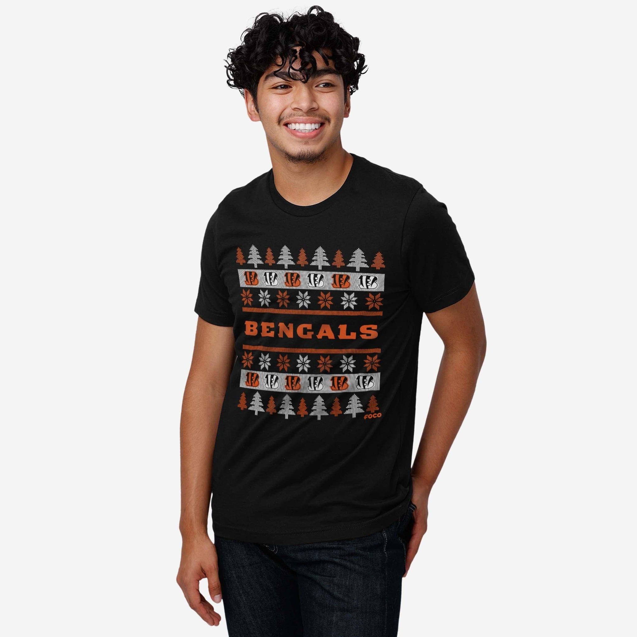 - Festive, team-colored design: This traditional t-shirt shows off the official Cincinnati Bengals colors in an all-over team-colored design with winter tree and snowflake accents, so you can show your team spirit with pride.