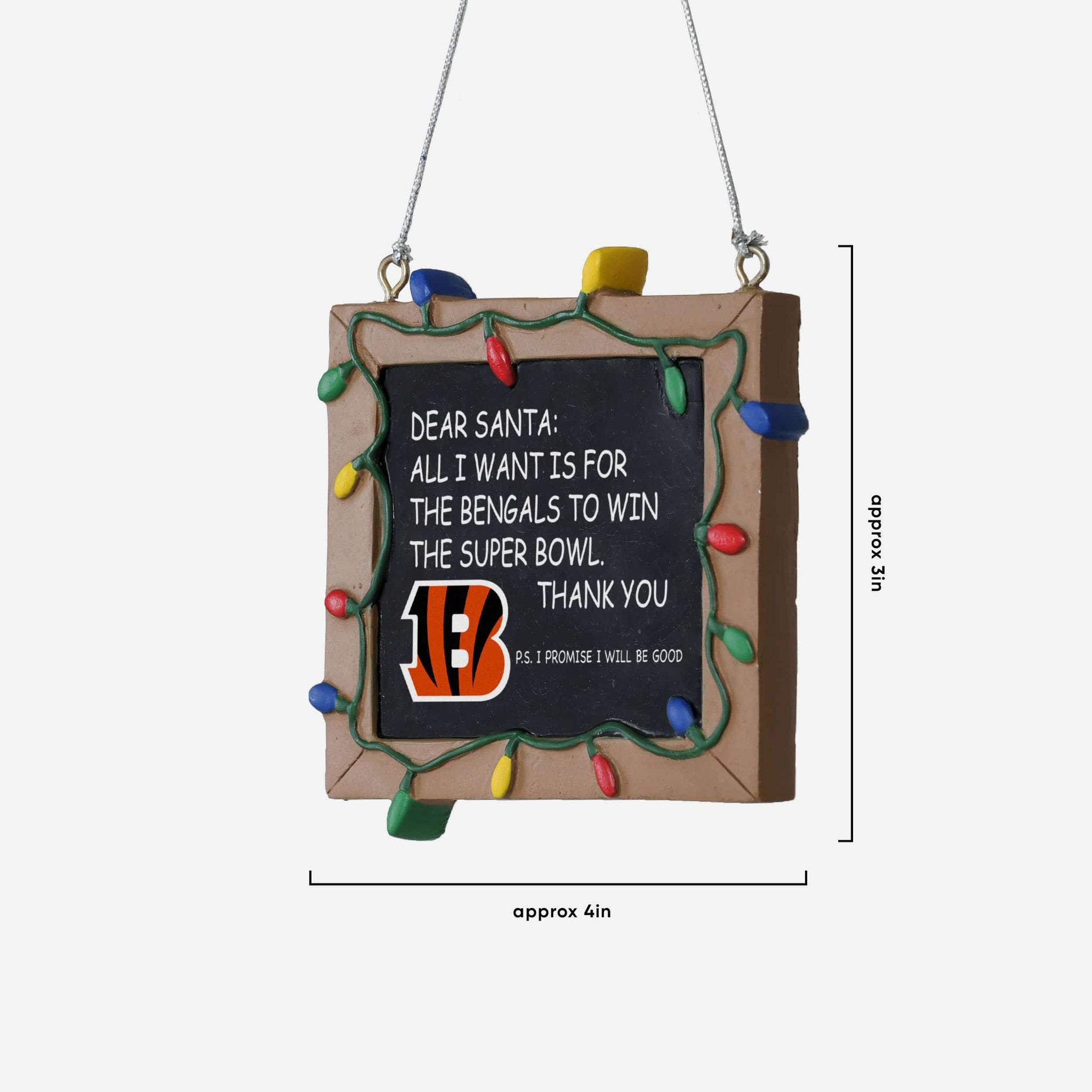 So, you made your list and sent it to jolly ol' Fanta Claus, asking him for a championship. But sometimes letters can get lost in the mail. Just in case, put this Cincinnati Bengals Resin Chalkboard Sign Ornament on your tree to let him know how good you've been this year, and that all you want for the holidays is a trophy.
