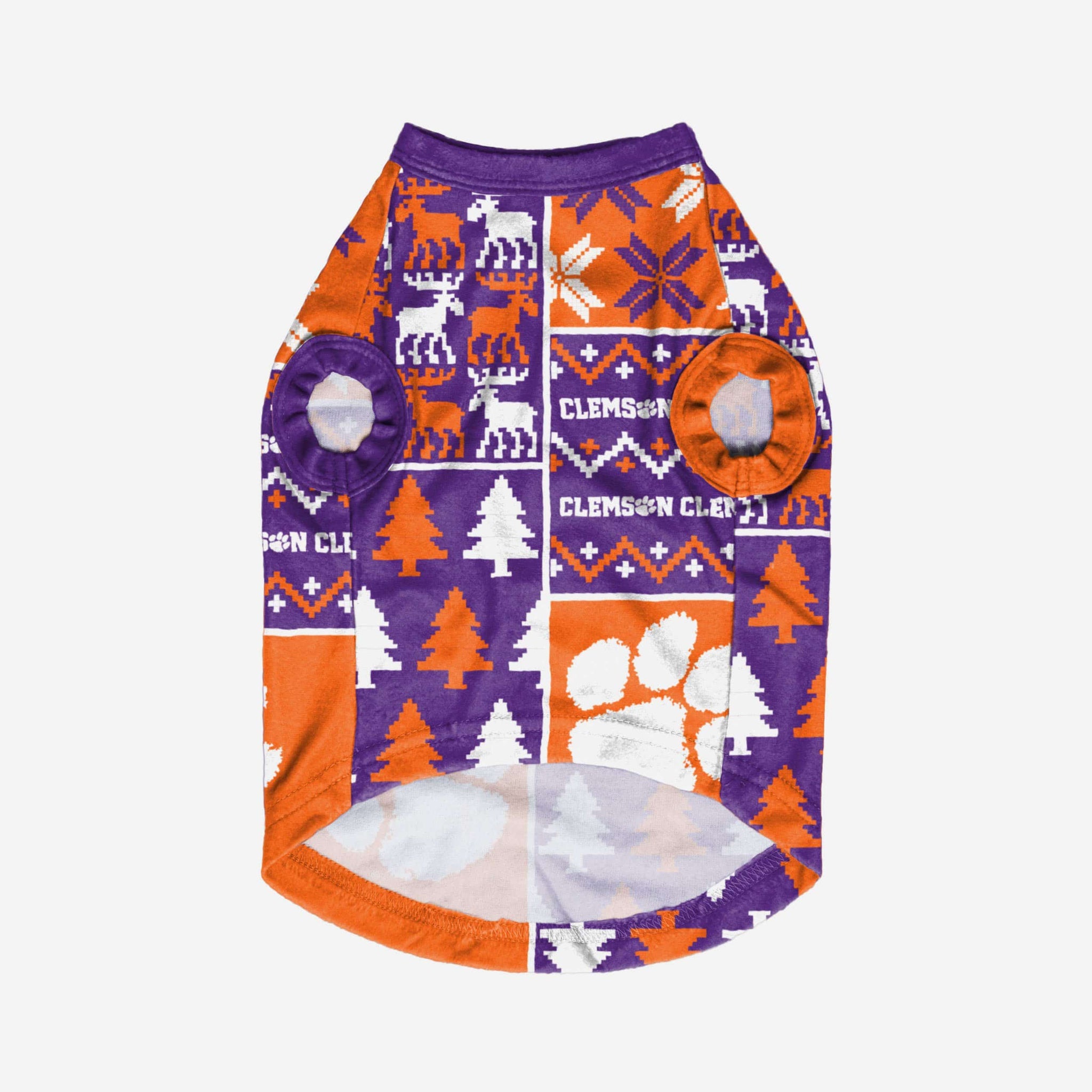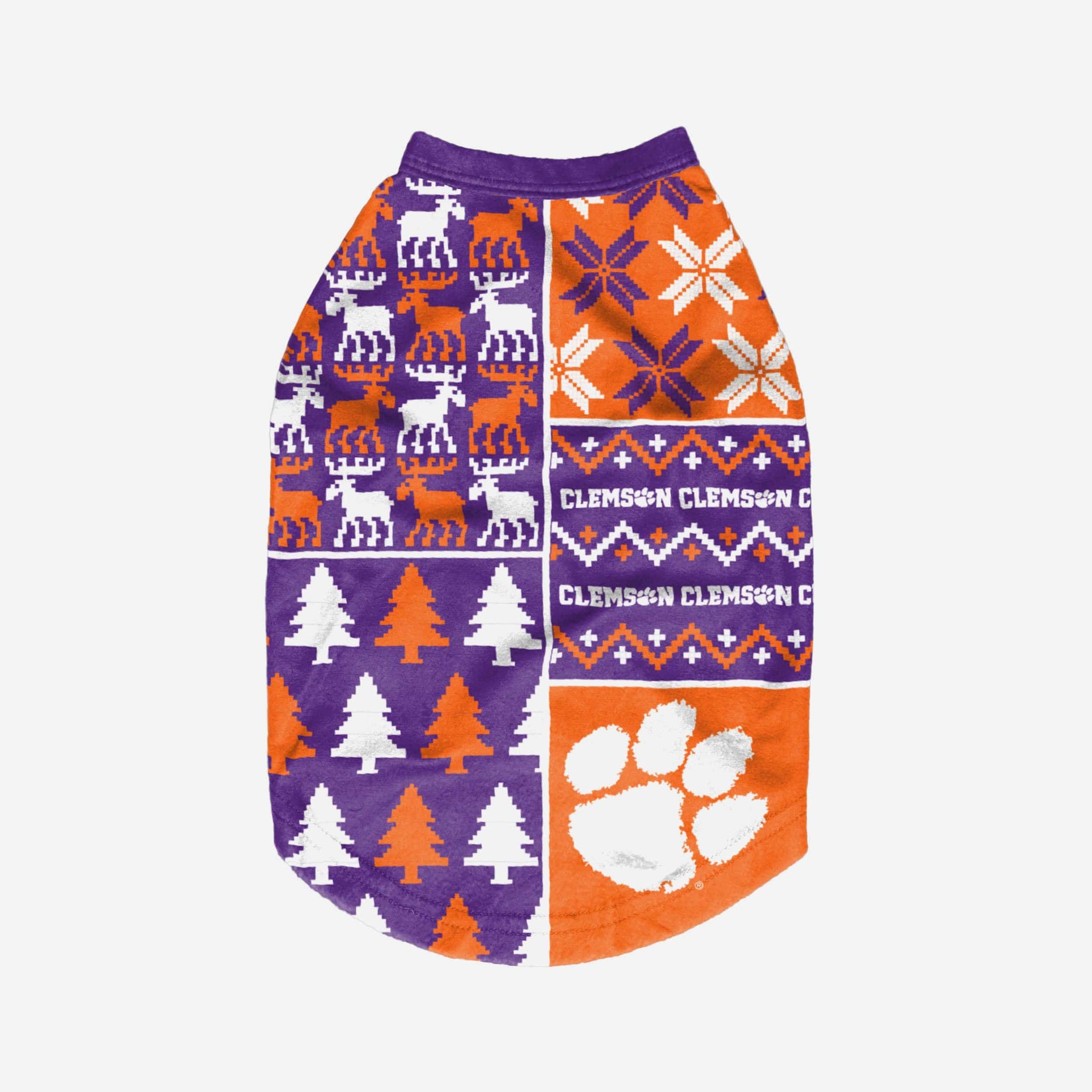 Show off your pet's holiday spirit with this dog sweater! Your good boy (or girl) will love this Clemson Tigers Busy Block Dog Sweater so much, they'll be saying "woof bark awooo" (that's "thank you" in pup language). Don't forget to match your canine's sweater with a set of matching holiday pajamas!