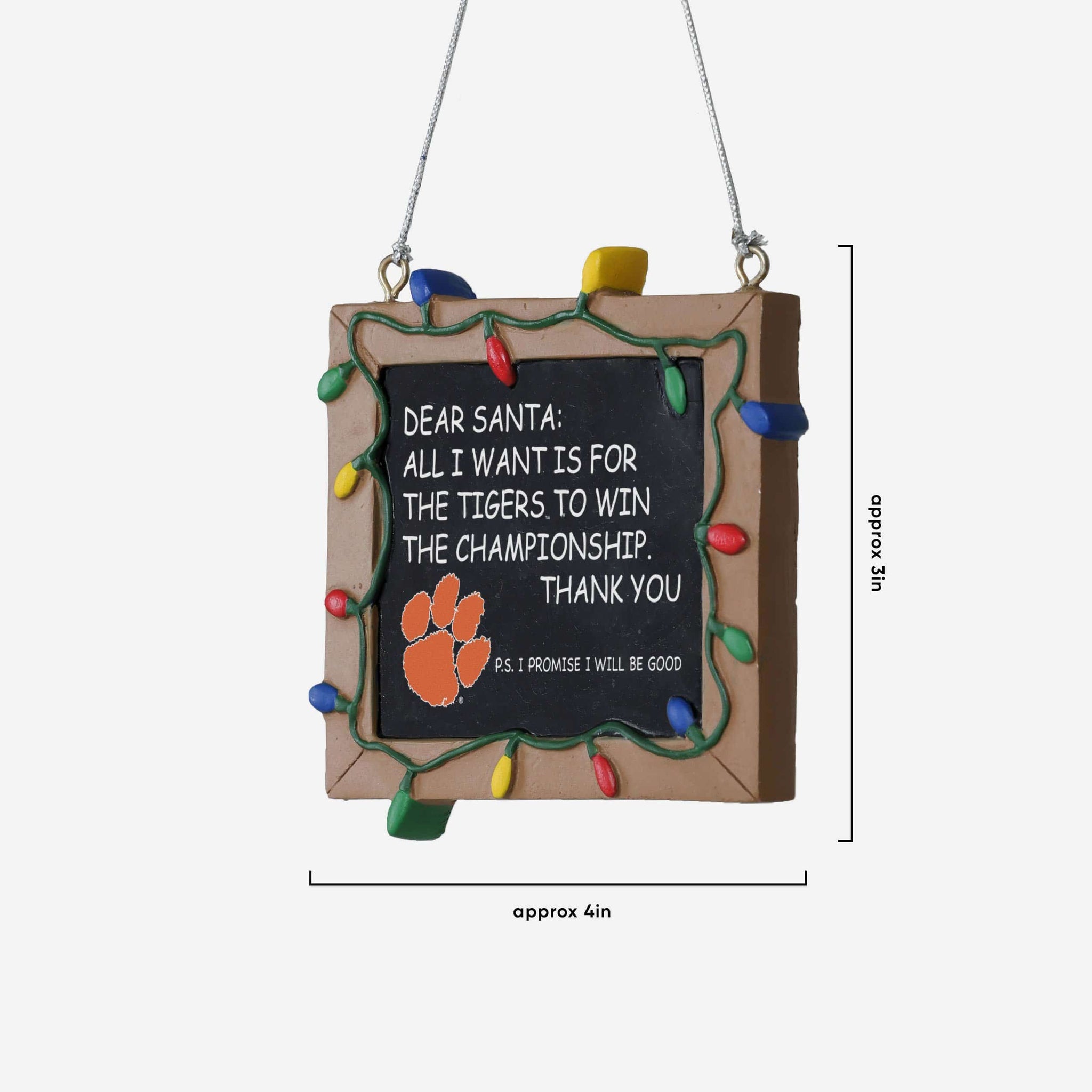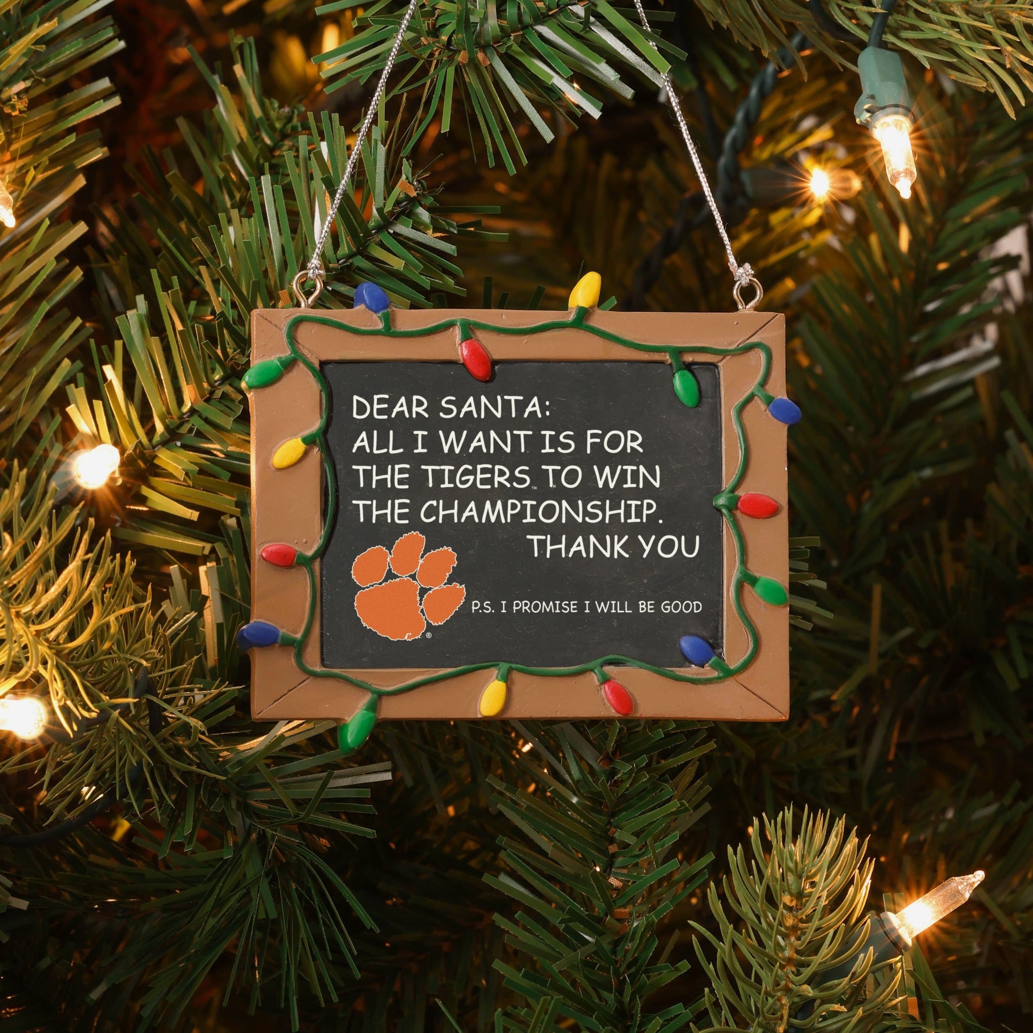 So, you made your list and sent it to jolly ol' Fanta Claus, asking him for a championship. But sometimes letters can get lost in the mail. Just in case, put this Clemson Tigers Resin Chalkboard Sign Ornament on your tree to let him know how good you've been this year, and that all you want for the holidays is a trophy.