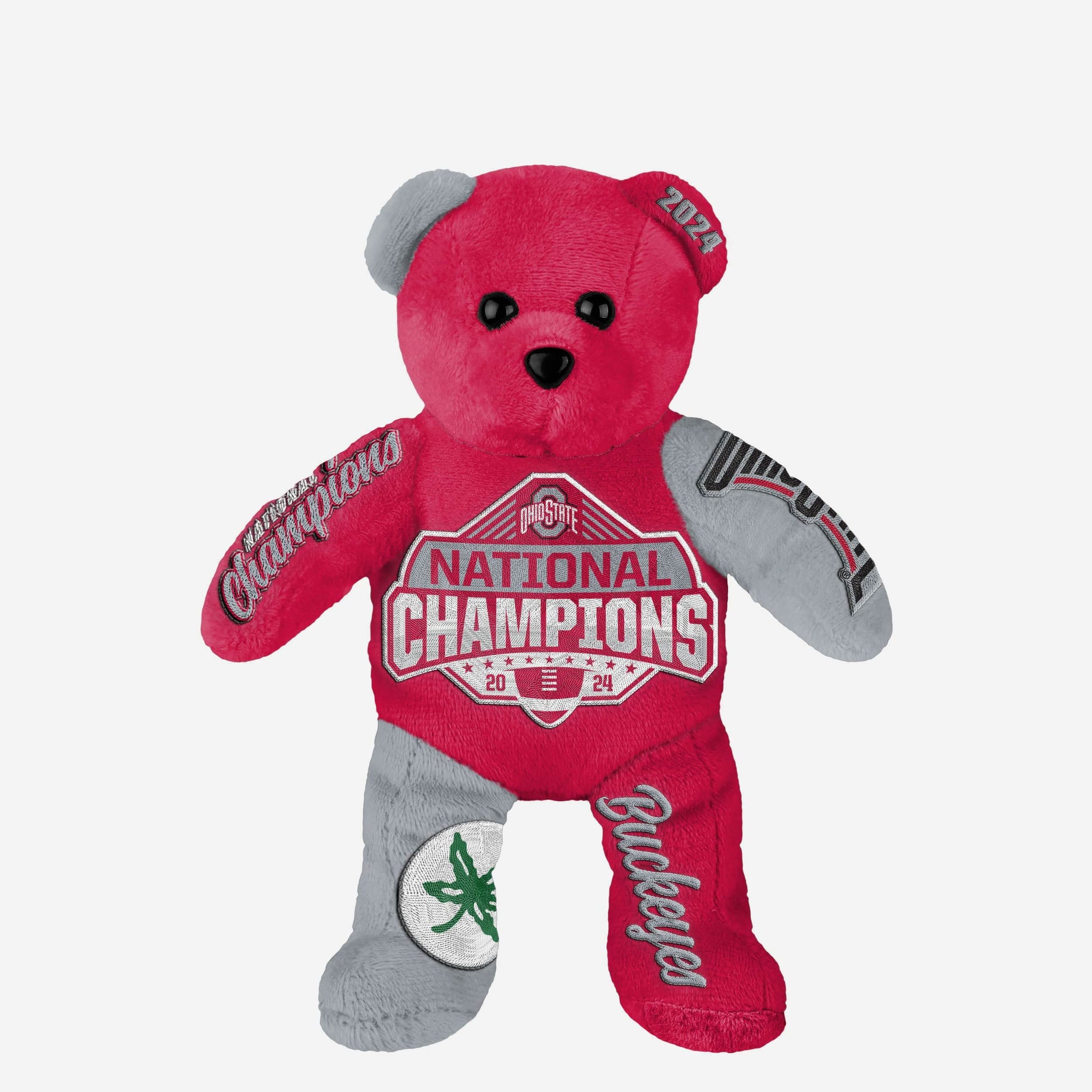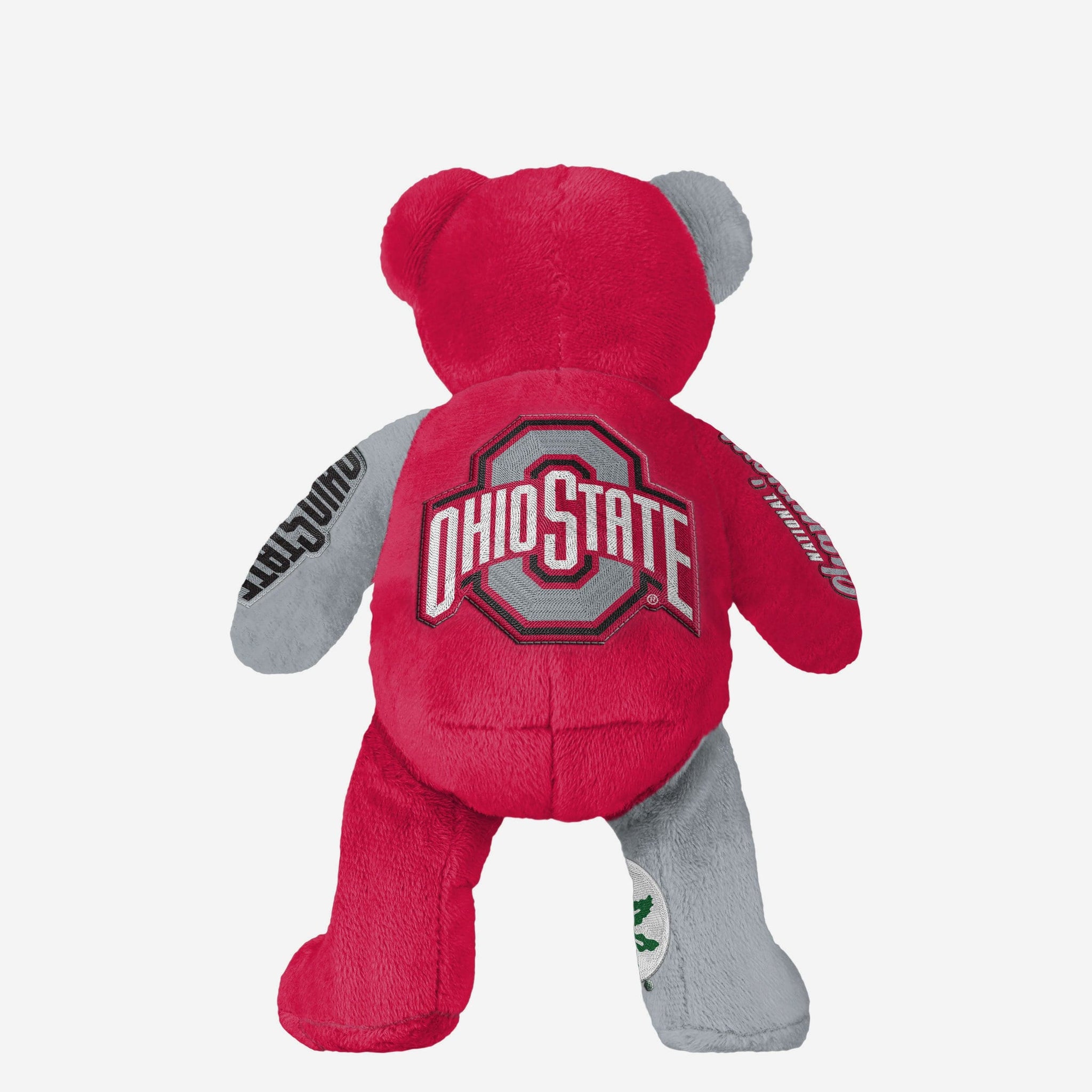 - “9-TIME NATIONAL CHAMPIONS,” “9X,” and “CHAMPIONS” text displays on right ear, front and back of body, and left leg to let everyone know how many times the Buckeyes have won it all