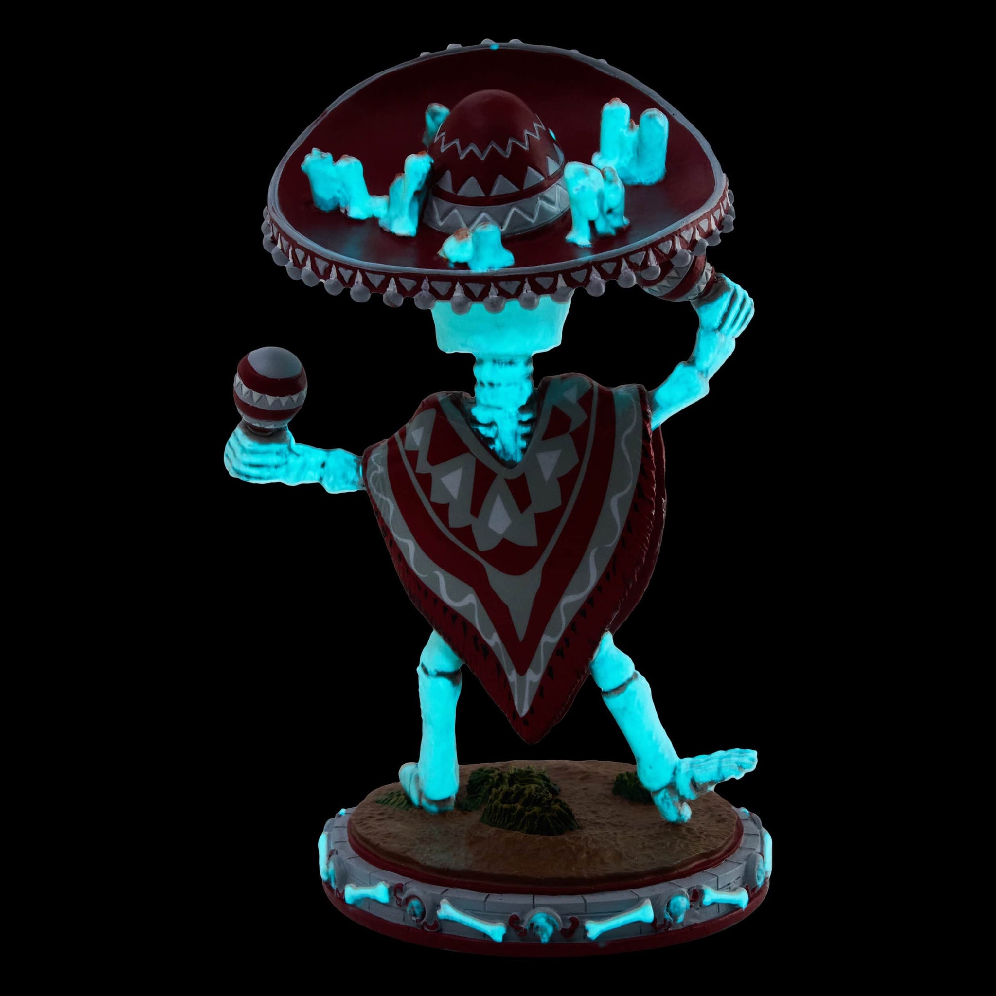 • Portrays skeleton with calavera skull wearing sombrero and poncho and holding maracas, ready to get the party started