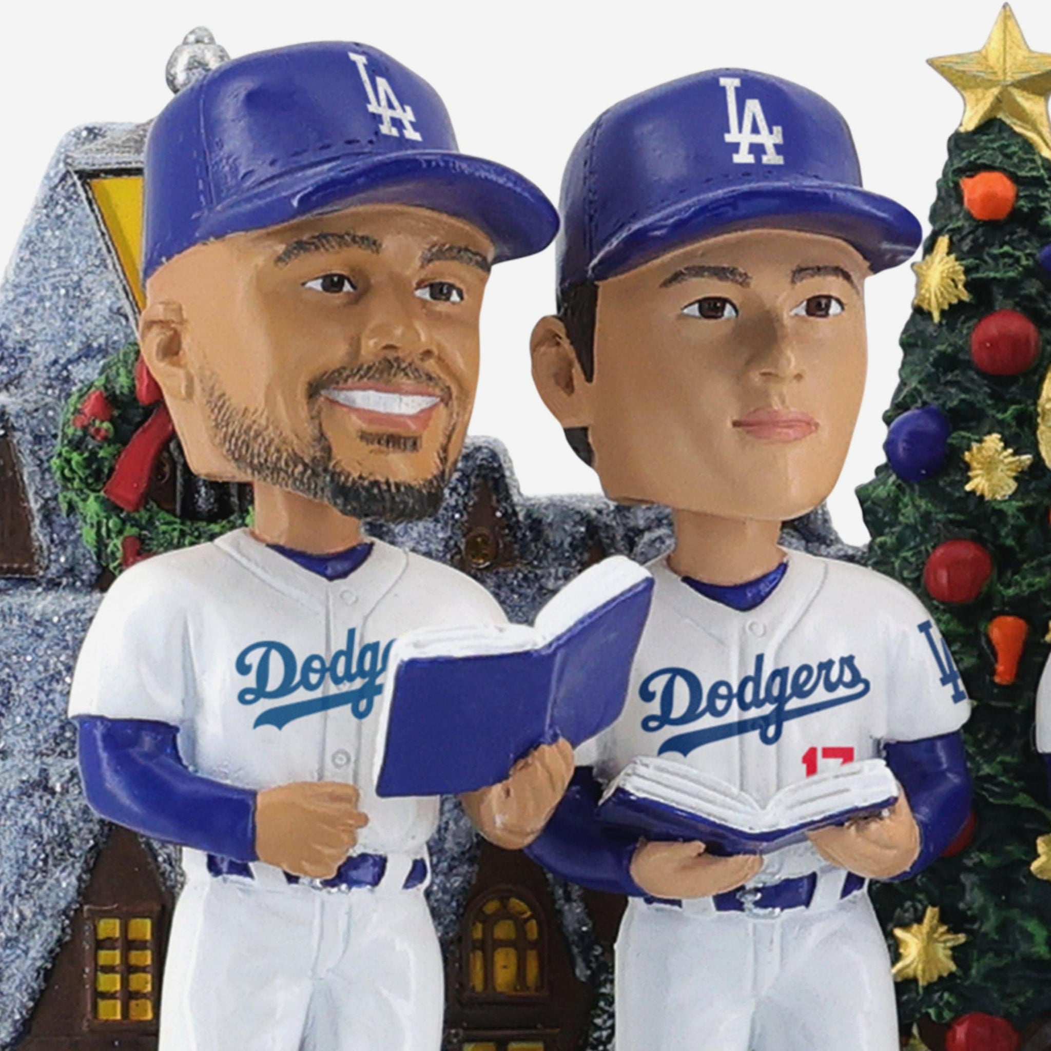 Light up your holidays the Dodger Blue way with this Los Angeles Dodgers Christmas Carol Sound Chip Mini Bobblehead Scene! Featuring Mookie Betts, Shohei Ohtani, Freddie Freeman, and Kiké Hernandez caroling together in front of a dazzling Christmas tree, this festive display brings ballpark magic and holiday cheer together like never before.