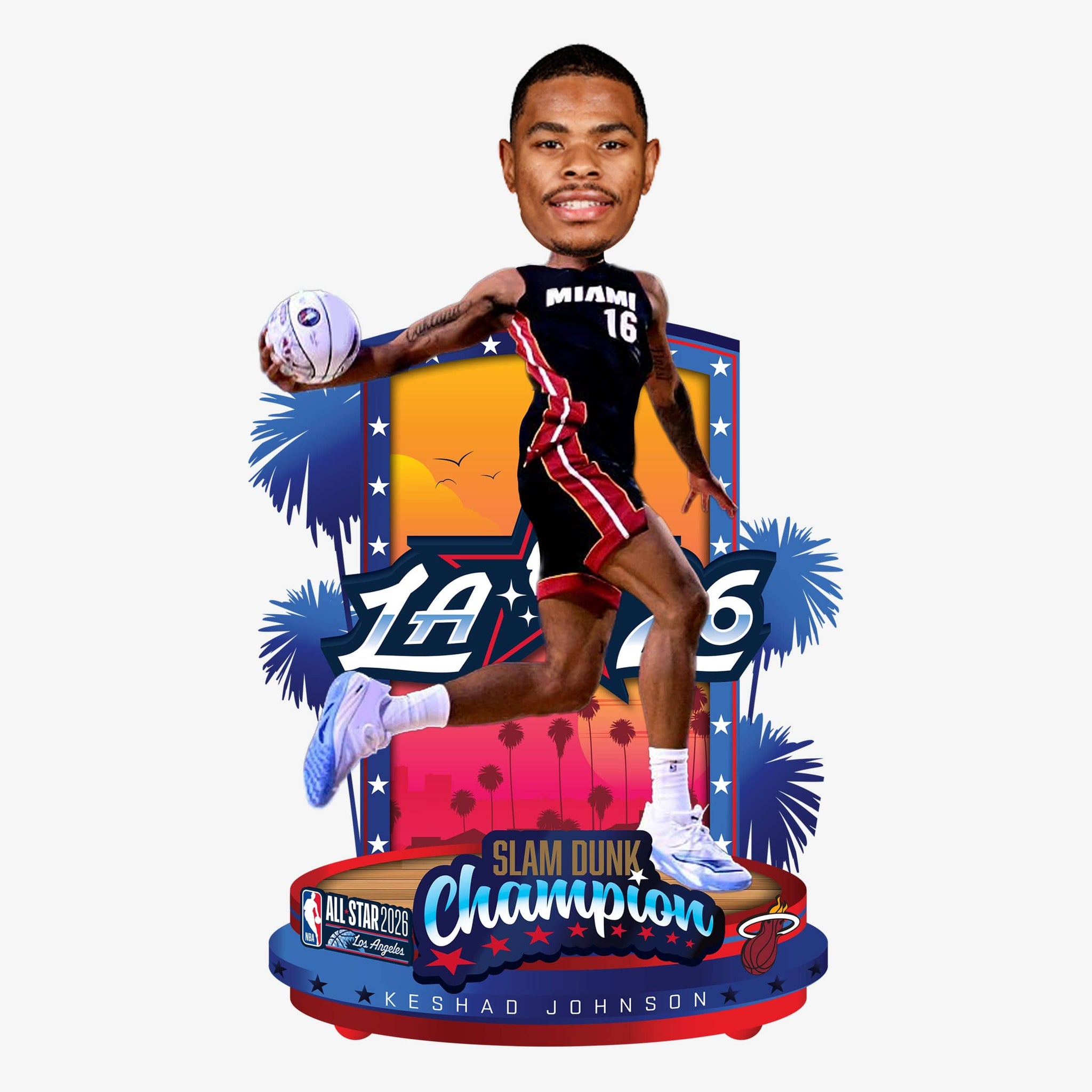 High flyer. Rim rocker. Dunk contest dominator. Celebrate an unforgettable All-Star Weekend performance with this Keshad Johnson Miami Heat 2026 NBA All-Star Slam Dunk Winner Bobblehead!