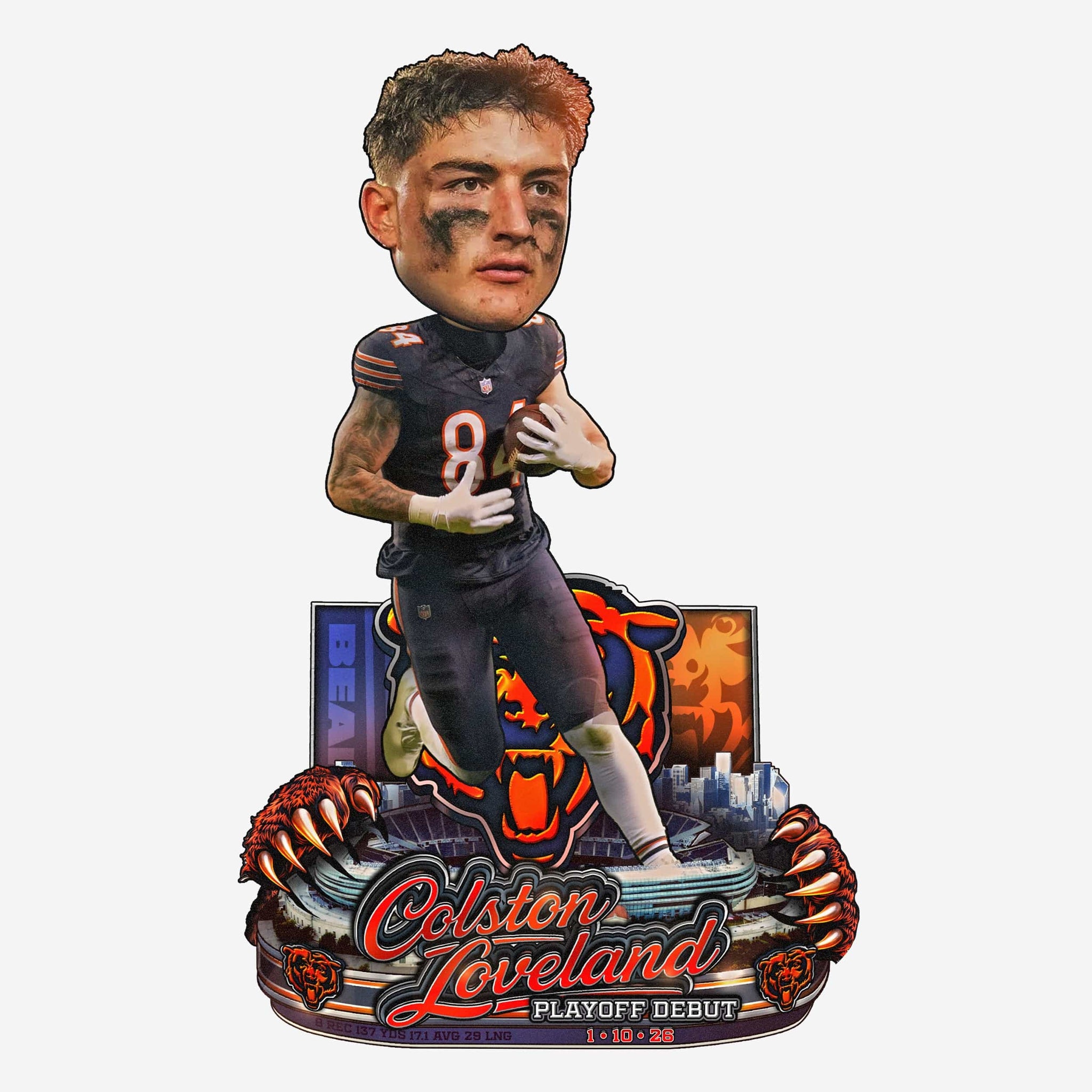 A debut to remember deserves a display to match! Celebrate a playoff debut for the ages with this Colston Loveland Chicago Bears Historic Performance Playoff Debut Bobblehead.