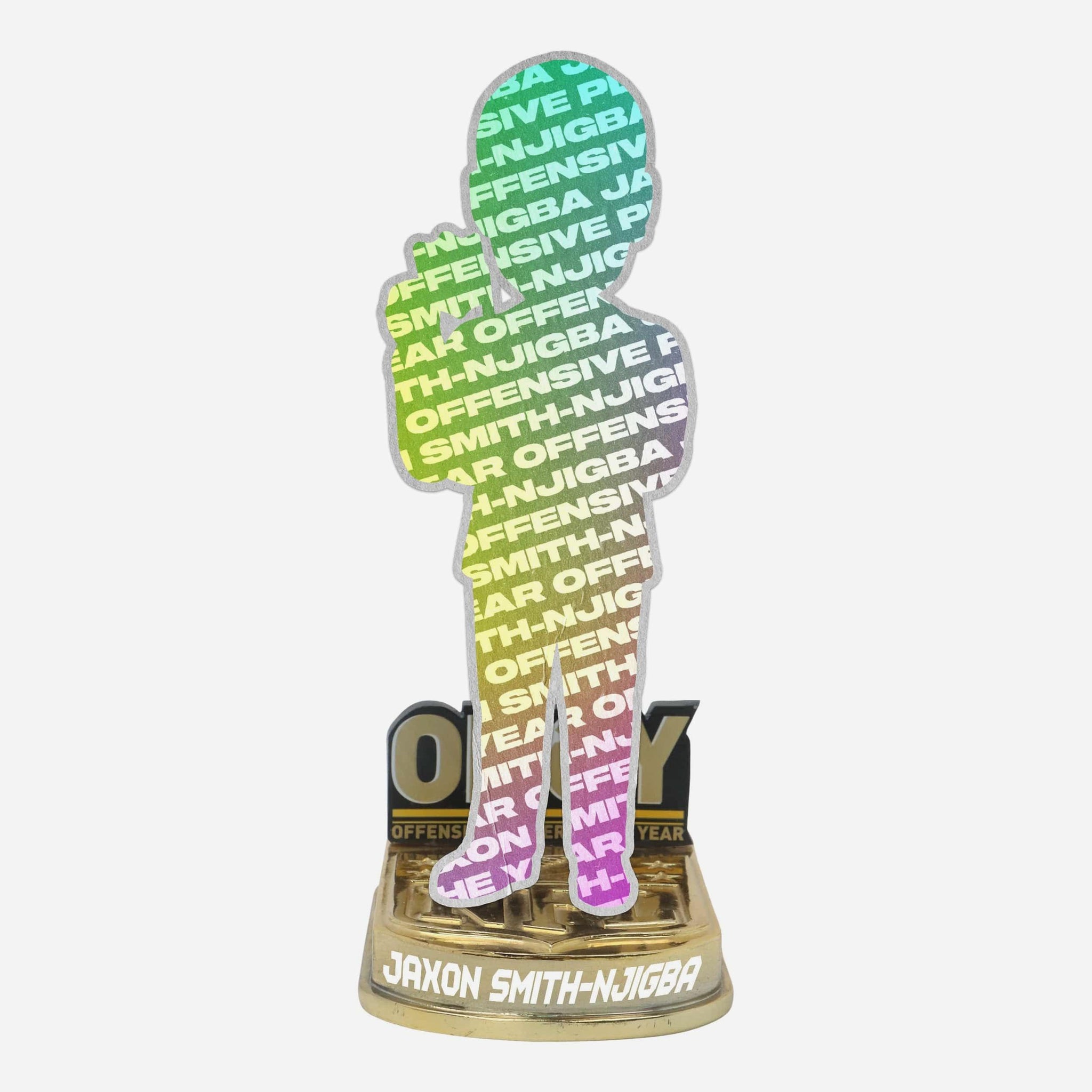- Portrays Offensive Player of the Year posing in a suit and holding a trophy, showing off some hard-earned hardware