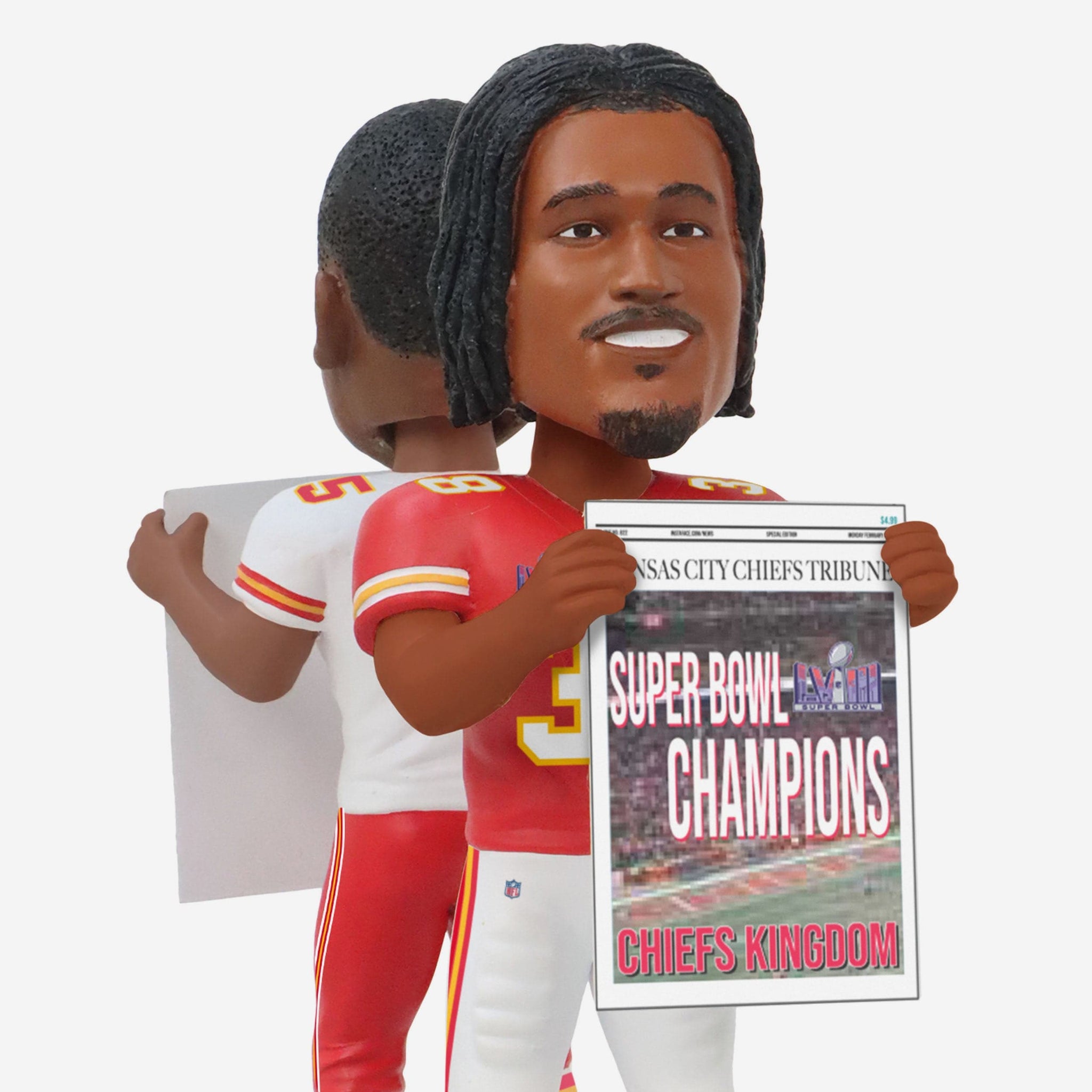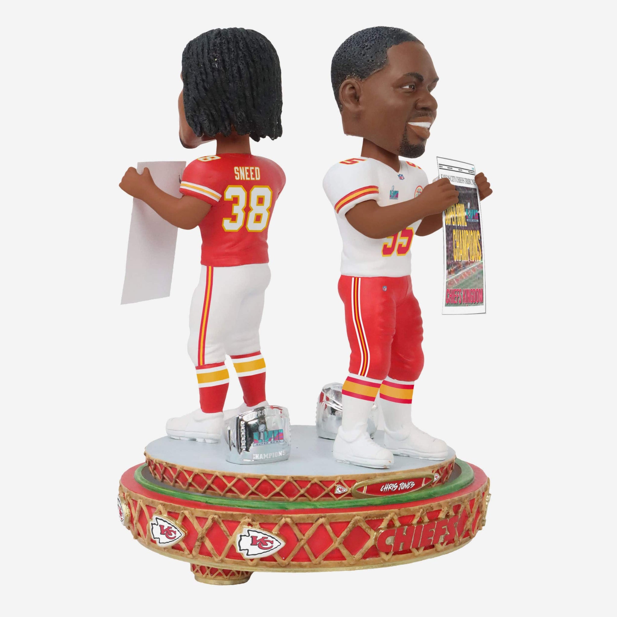 Two Super Bowl winners. One spinning bobble! The back-to-back champions are showing out in your collection with the L’Jarius Sneed & Chris Jones Kansas City Chiefs Super Bowl LVIII Champions Dual Spinner Bobblehead