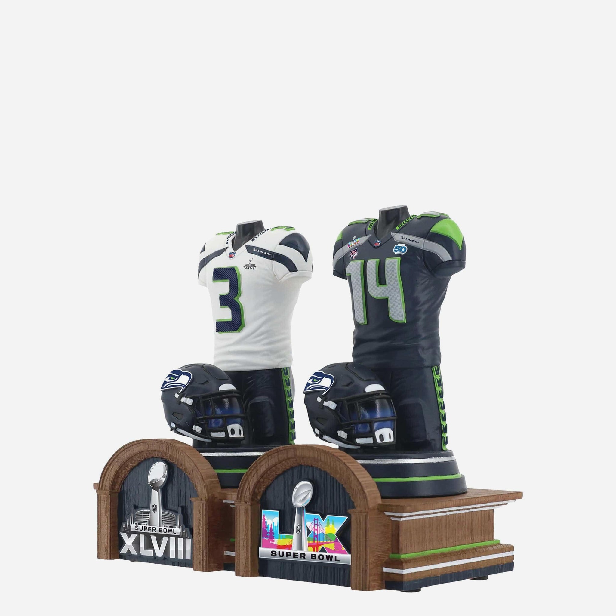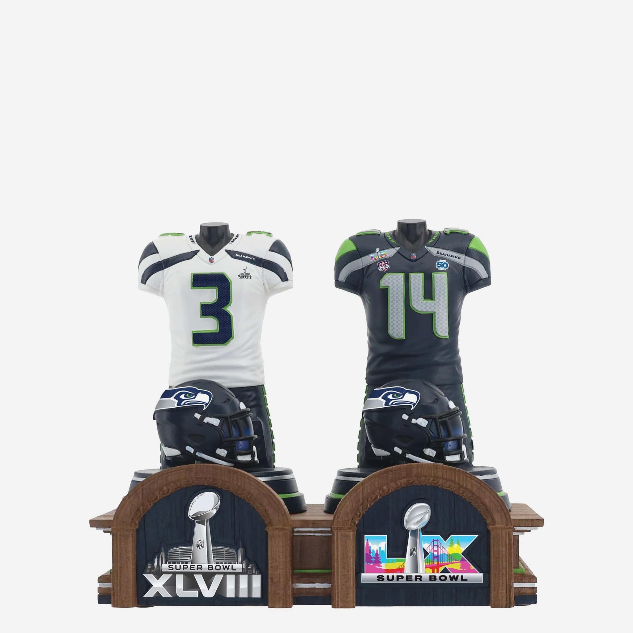 Celebrate championship history with the Seattle Seahawks Super Bowl LX Champions Historical Jersey Bust Bobblehead — a premium collectible honoring iconic Seahawks quarterbacks and their legendary uniforms.