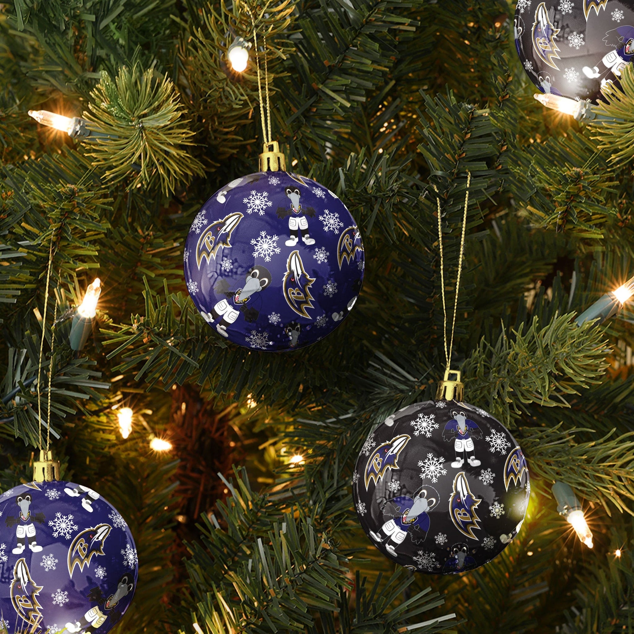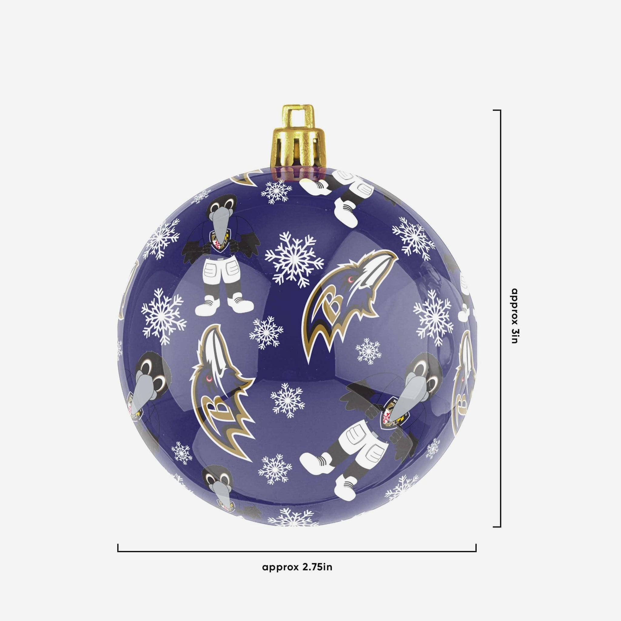 Bring the spirit of the season and your team together with the Baltimore Ravens 4 Pack Ball Mascot Ornament Set. This festive set includes four lightweight, plastic ornaments in two bold team-colored designs, each featuring repeat mascot and logo graphics.