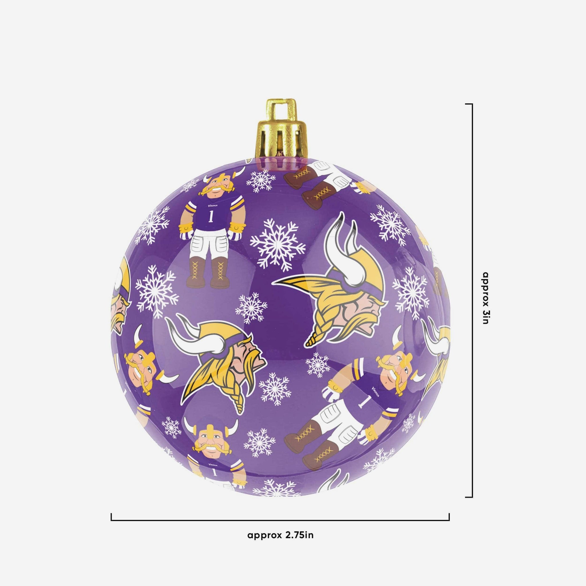 Bring the spirit of the season and your team together with the Minnesota Vikings 4 Pack Ball Mascot Ornament Set. This festive set includes four lightweight, plastic ornaments in two bold team-colored designs, each featuring repeat mascot and logo graphics.