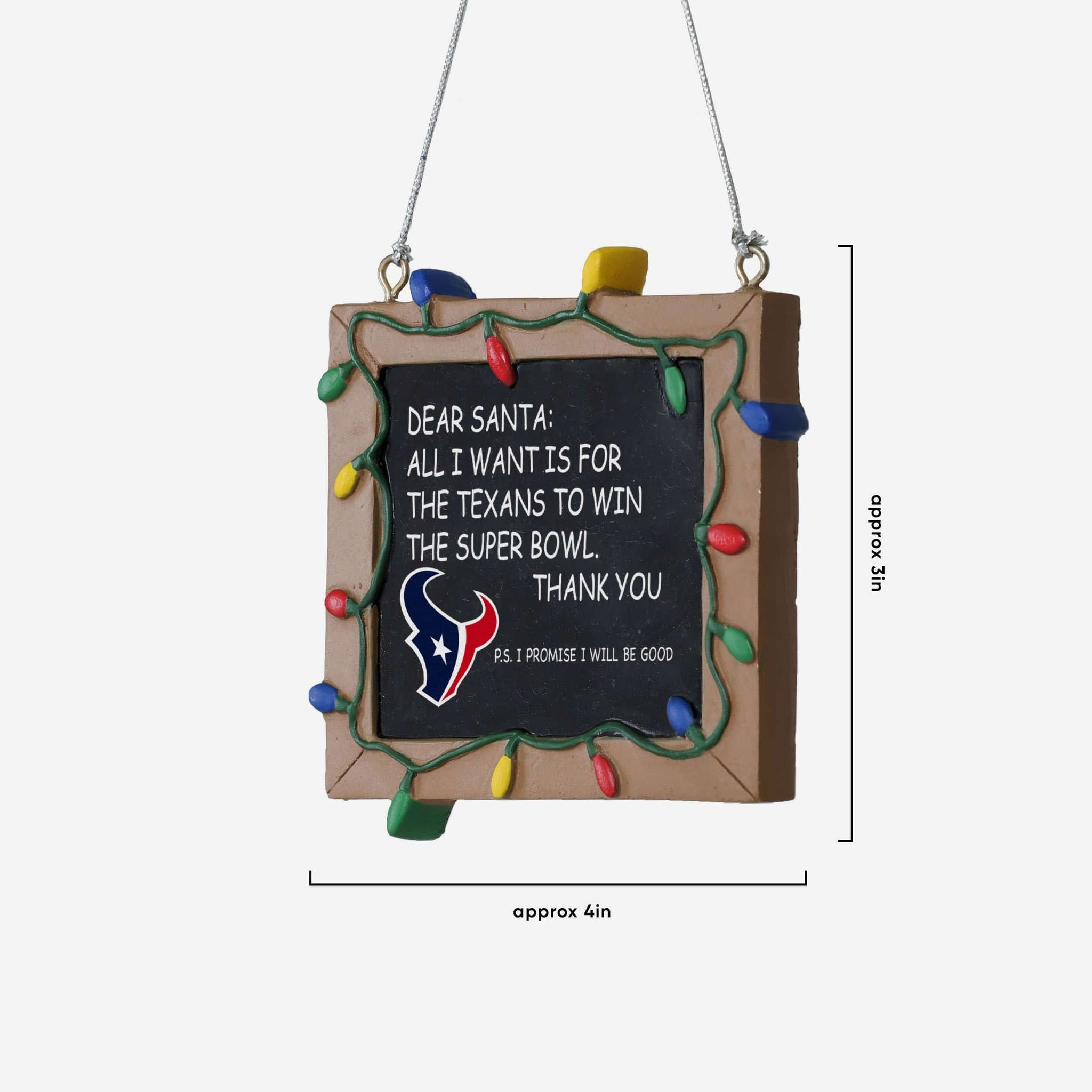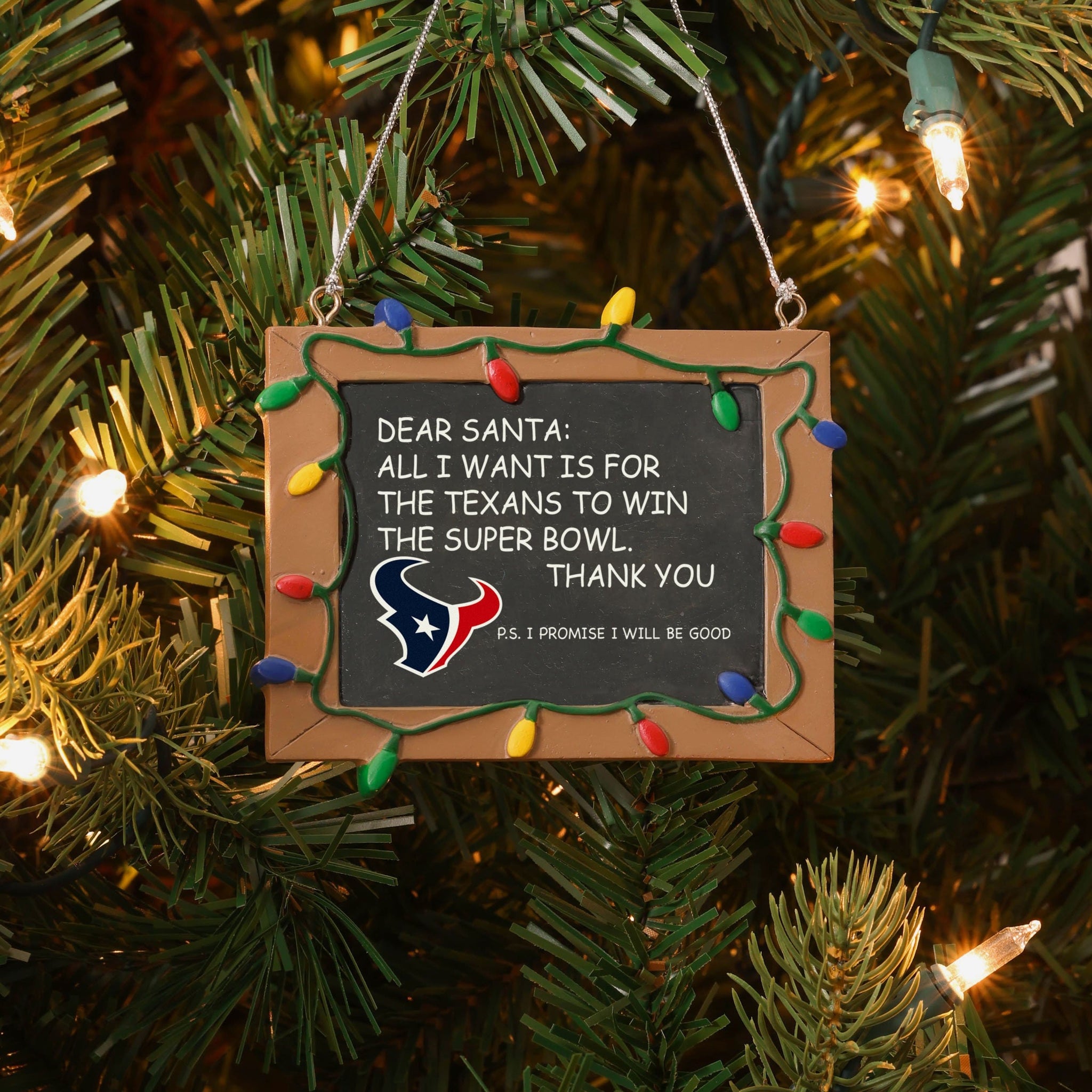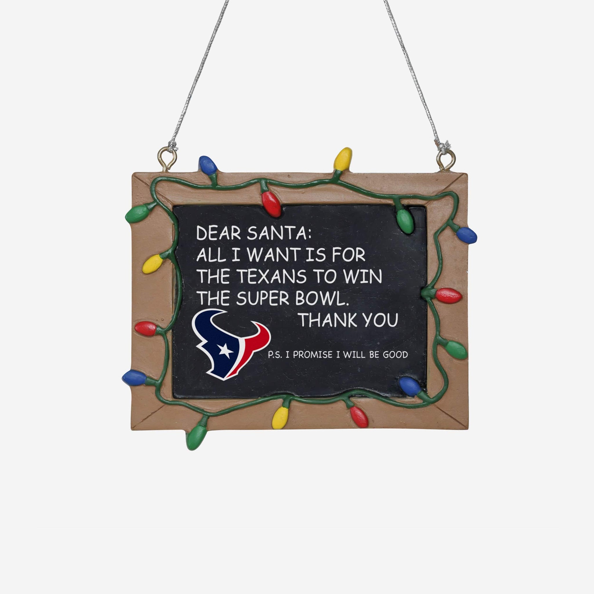 So, you made your list and sent it to jolly ol' Fanta Claus, asking him for a championship. But sometimes letters can get lost in the mail. Just in case, put this Houston Texans Resin Chalkboard Sign Ornament on your tree to let him know how good you've been this year, and that all you want for the holidays is a trophy.