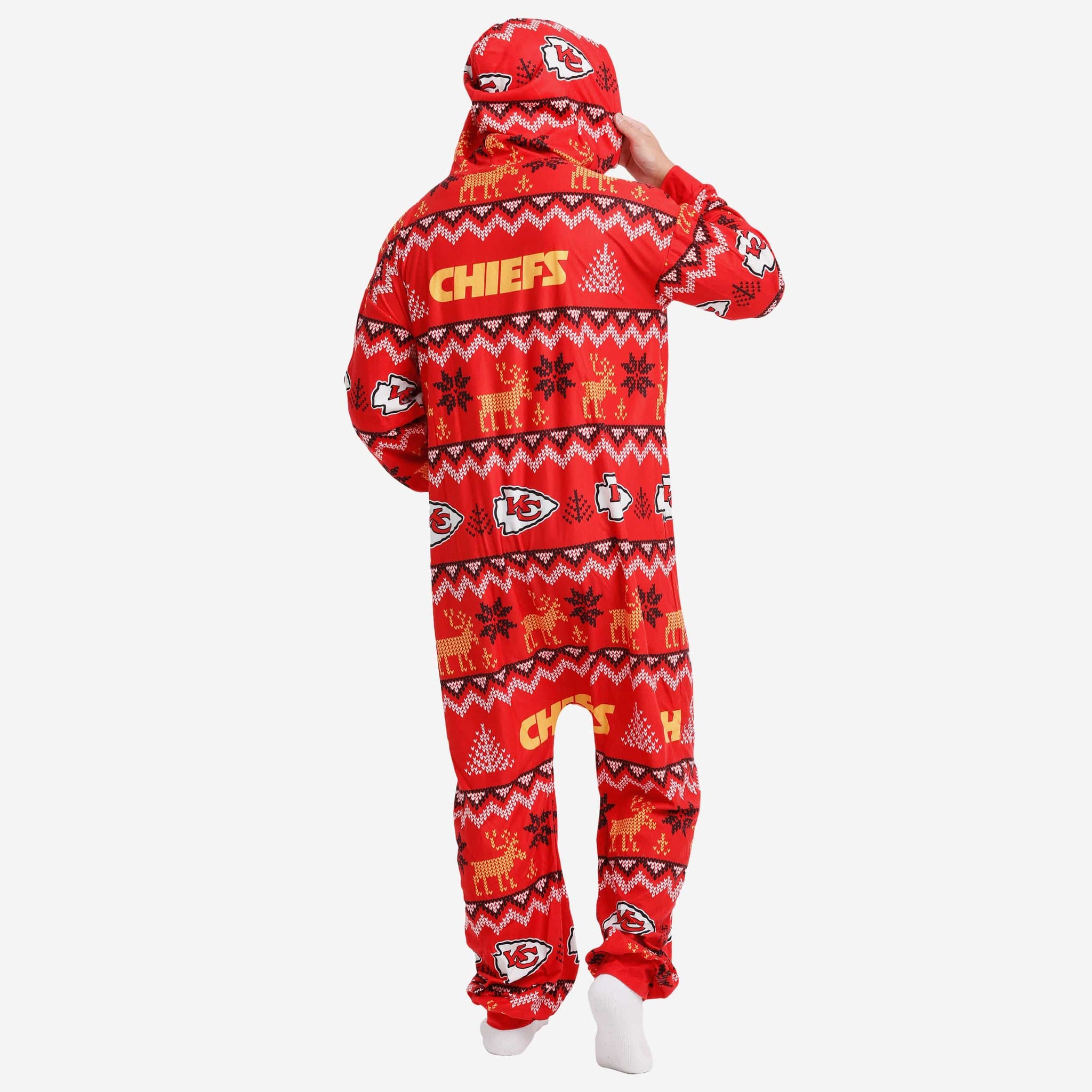 Get some matching family pajamas and dress to impress this holiday season! You won't want to miss these onesie team pajamas! These men's and women's PJ's are comfortable and show off your team spirit in the form of some sweet one piece jammies. Introducing the Kansas City Chiefs Ugly Pattern One Piece Pajamas! Don't forget to take your holiday photo with the whole family wearing matching Christmas pajamas!