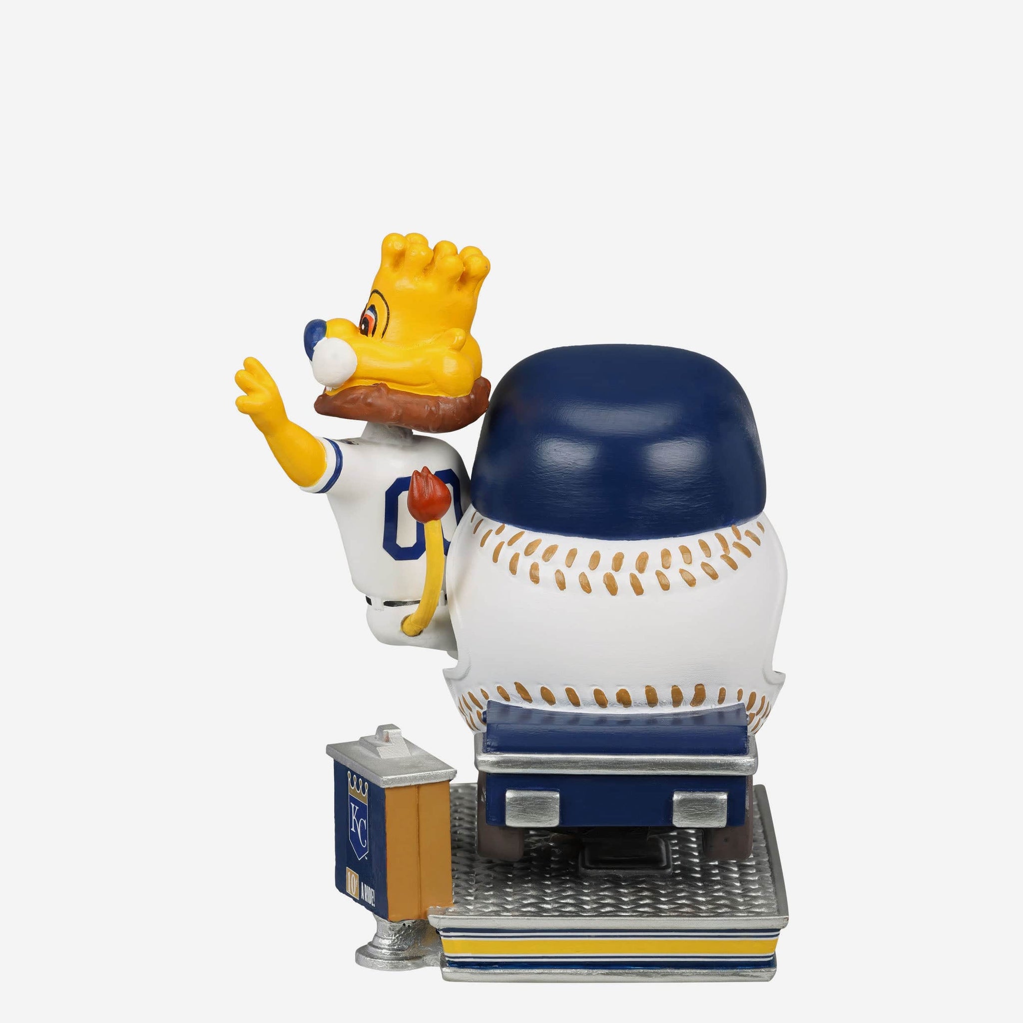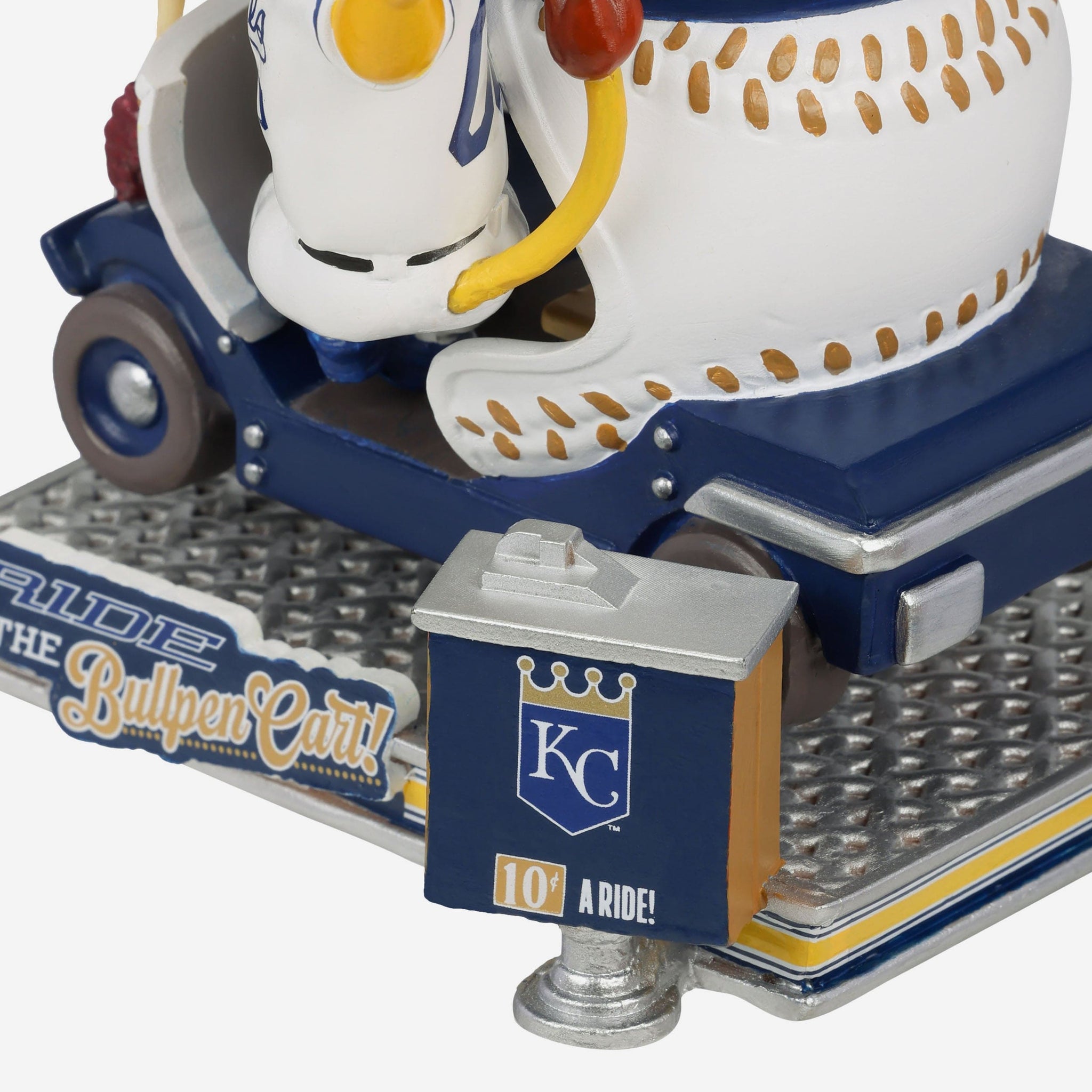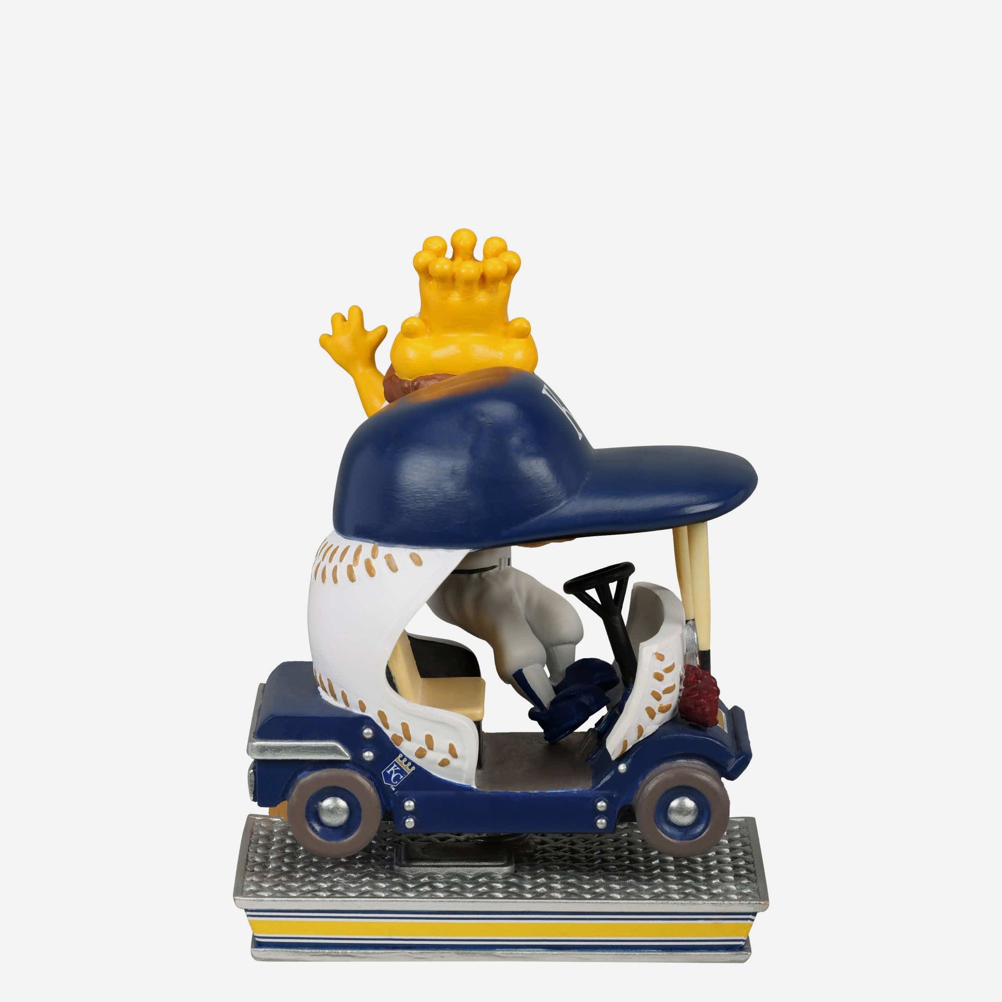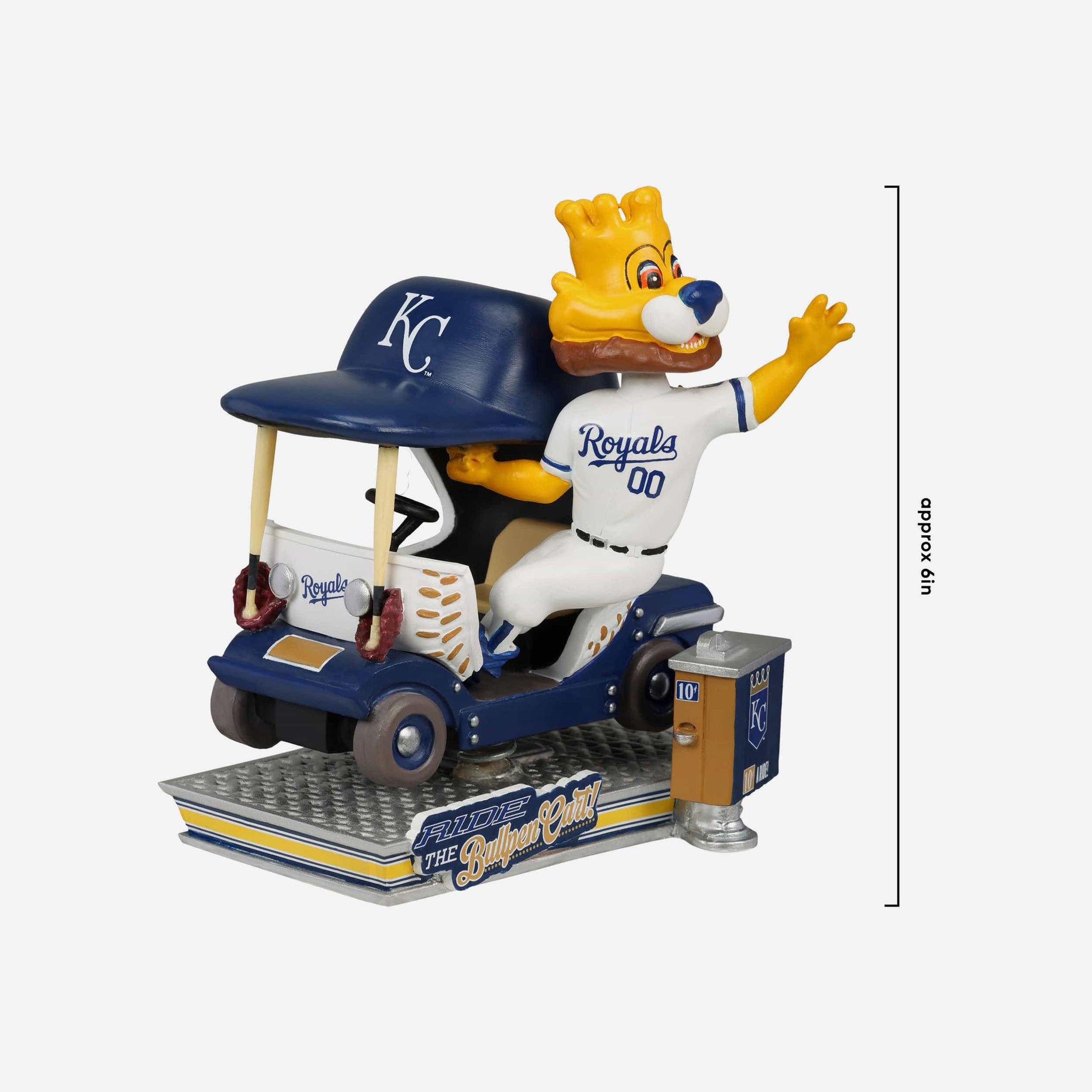 Ride the bullpen cart with Sluggerrr! Cruise your way to fandom with the Sluggerrr Kansas City Royals Bullpen Cart Mascot Bobblehead.