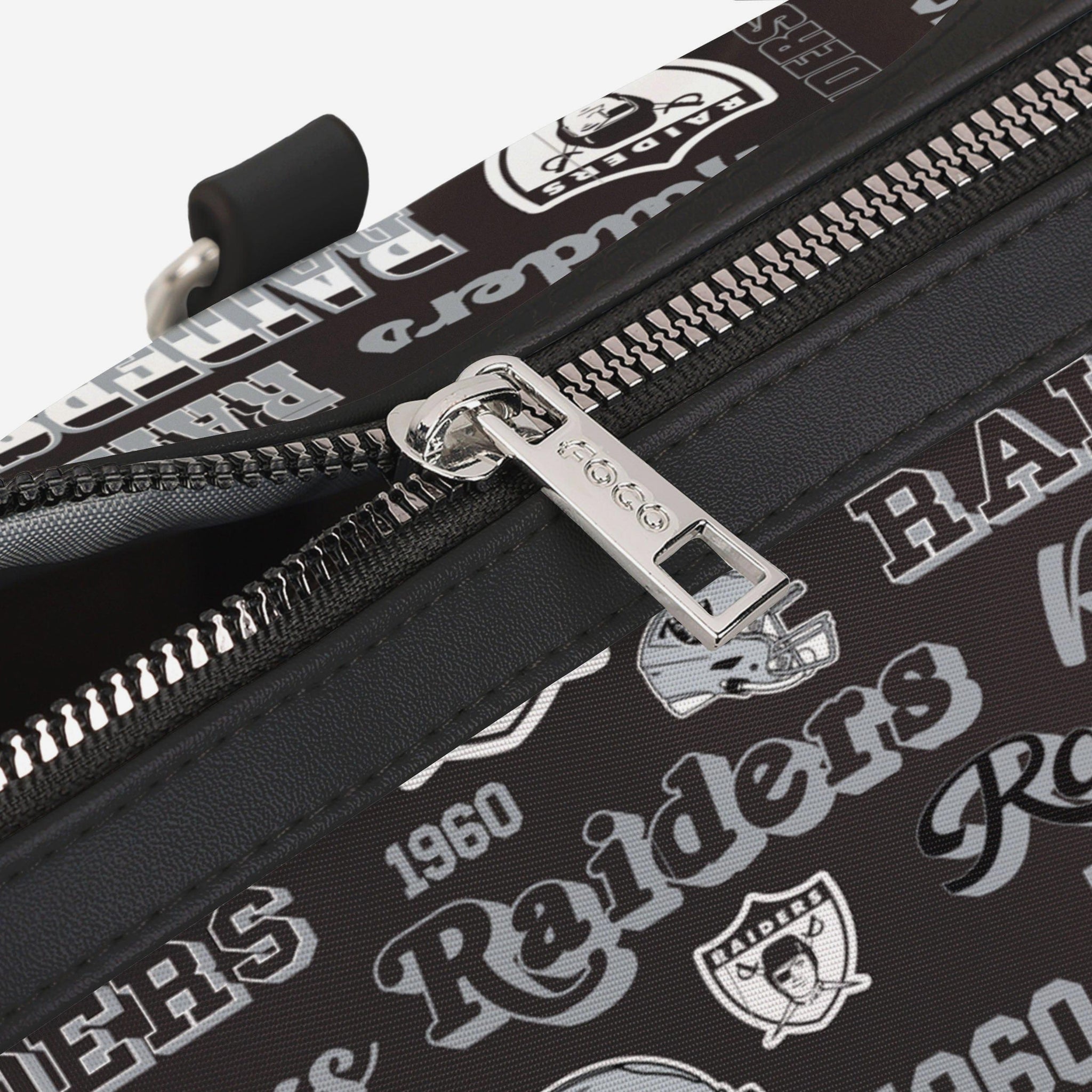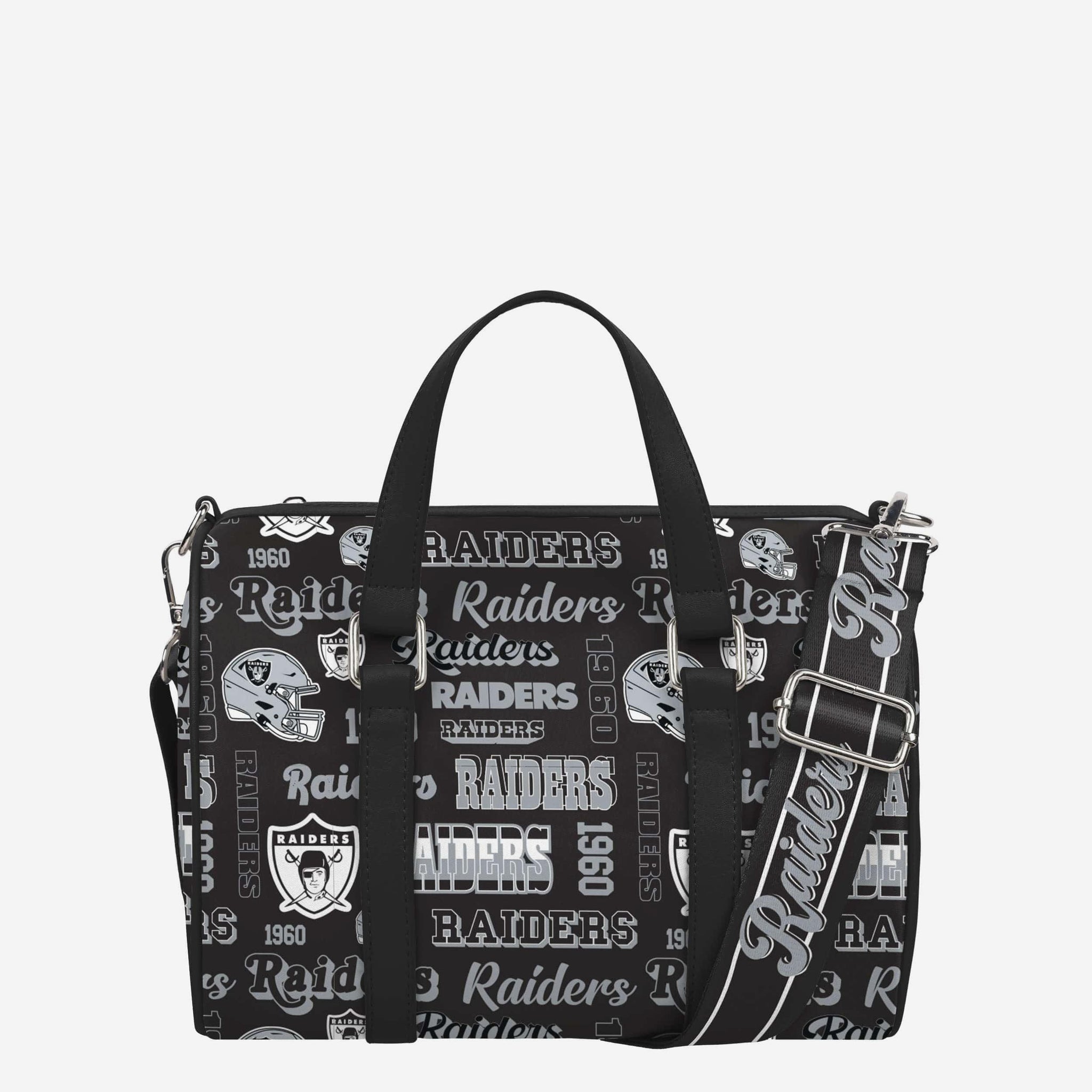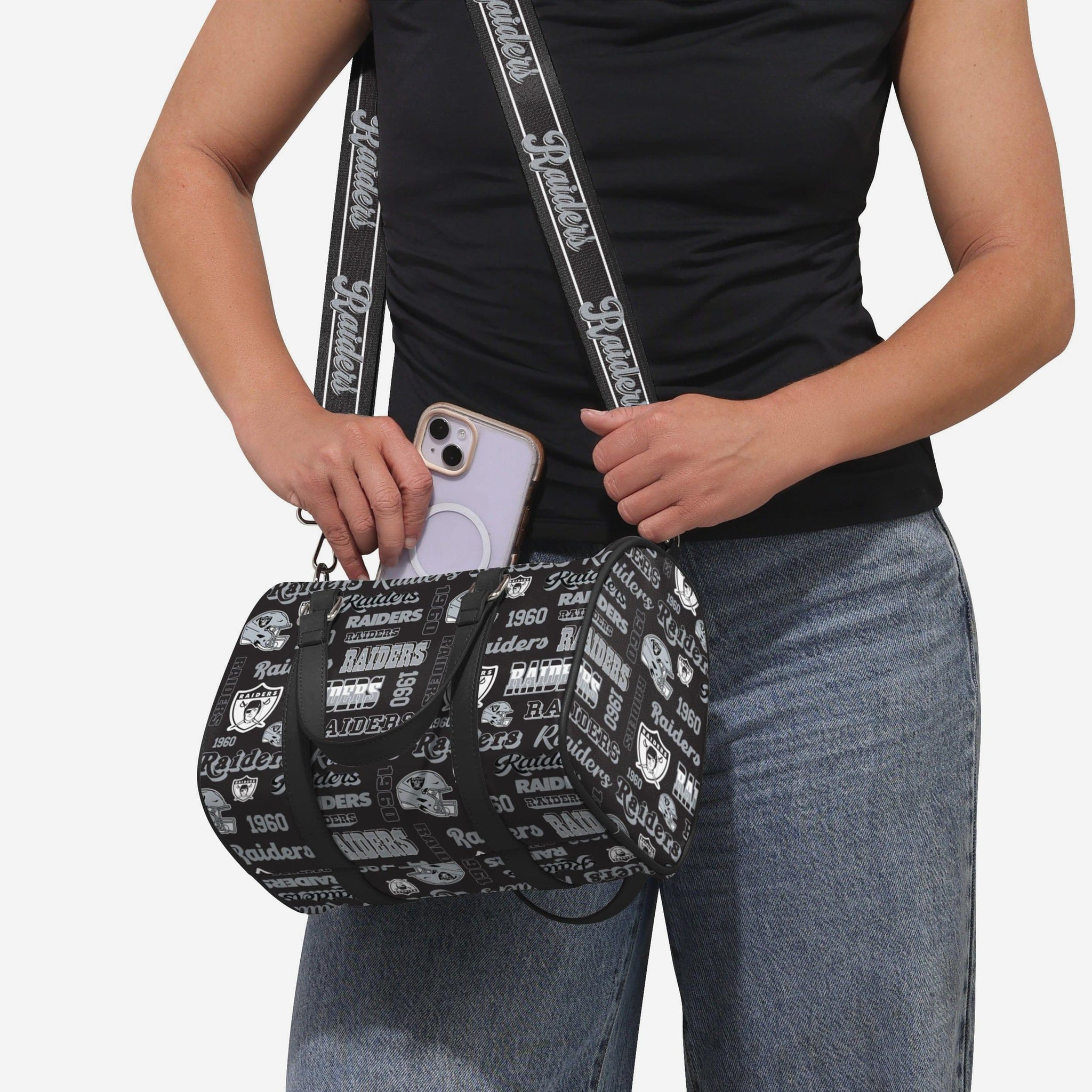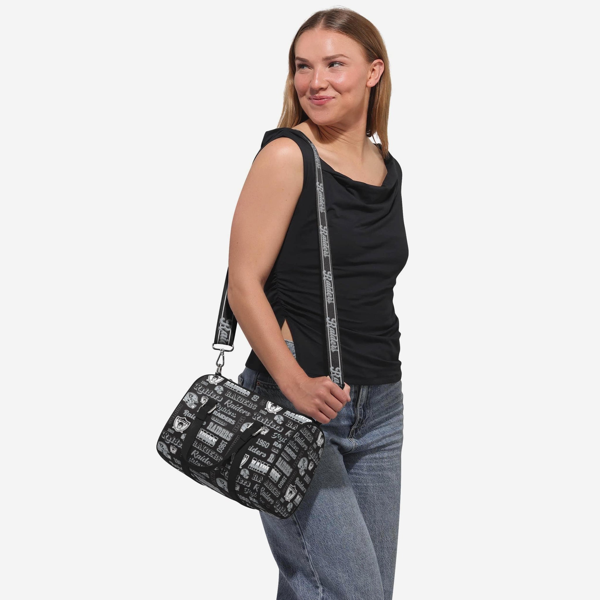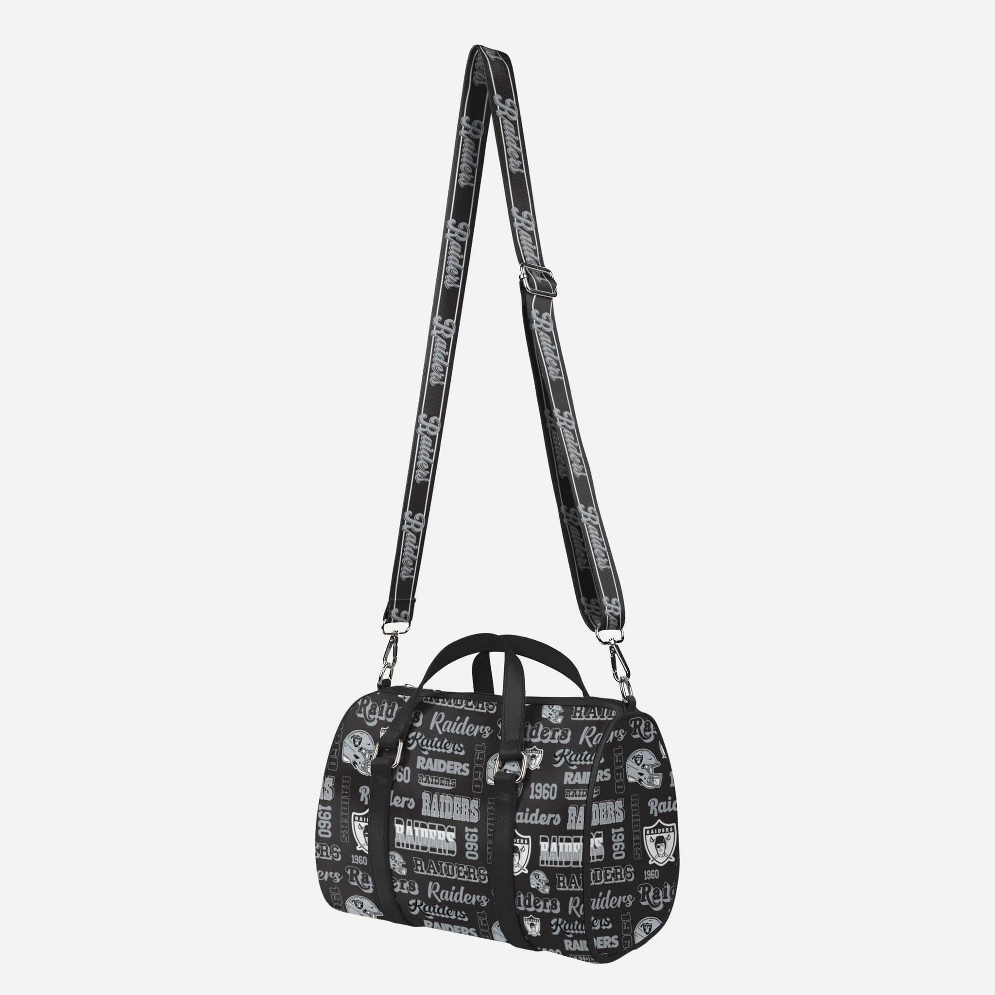 Pack up and play on! Fashion meets fandom in the Las Vegas Raiders Repeat Retro Print Nylon Medium Barrel Bag.