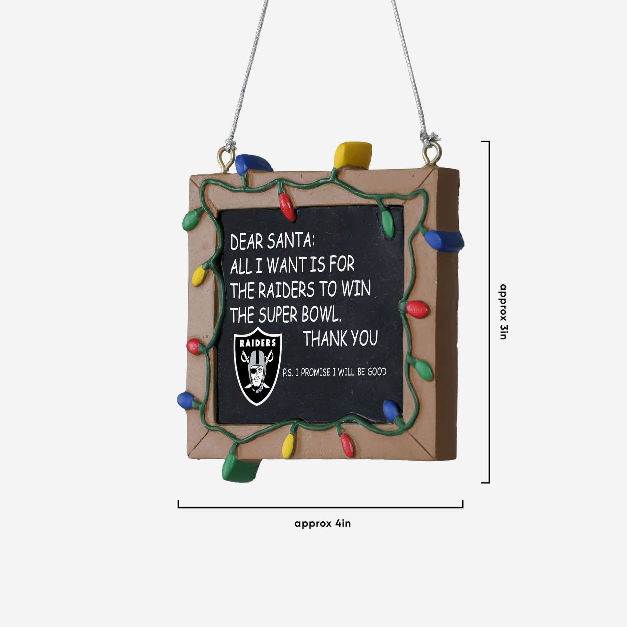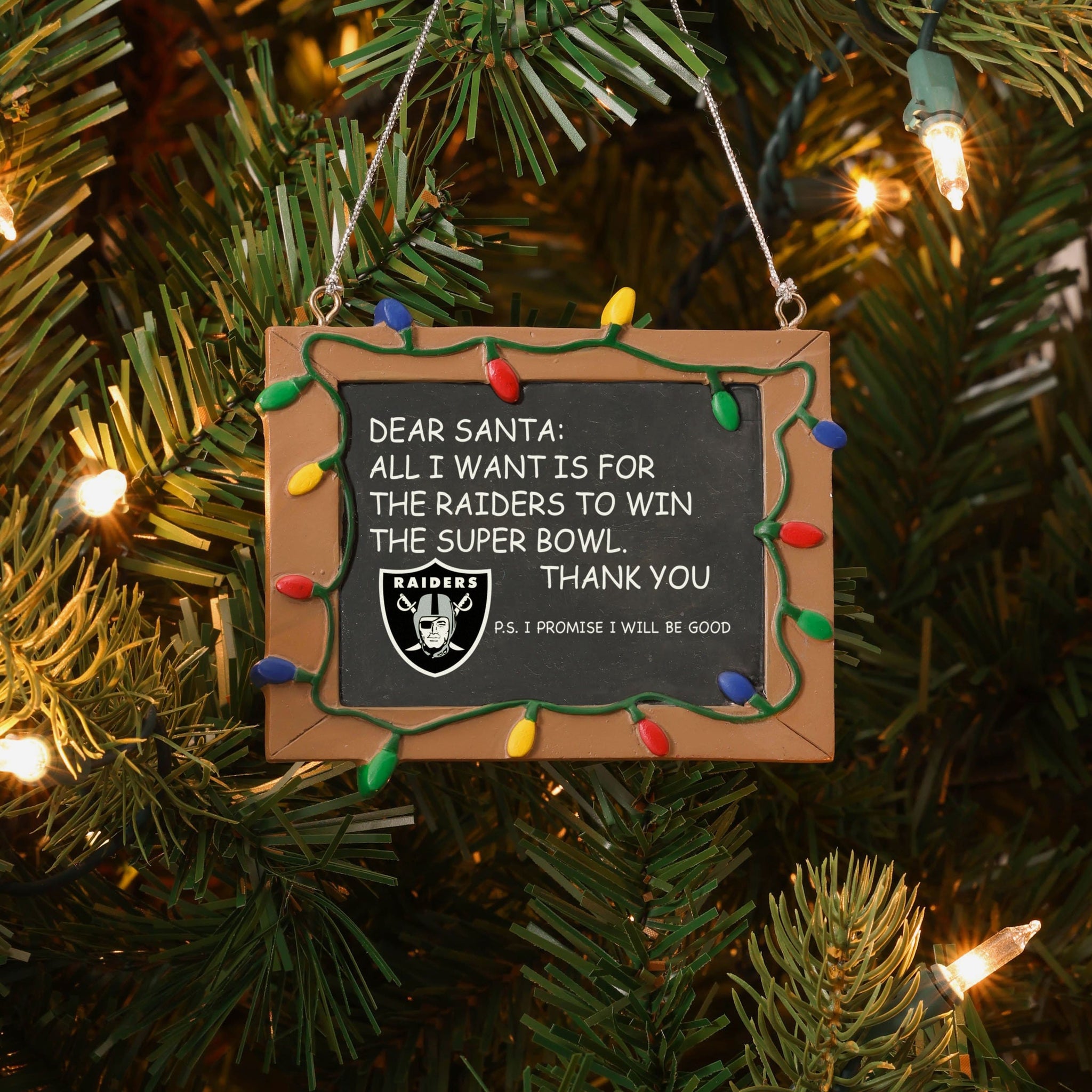 So, you made your list and sent it to jolly ol' Fanta Claus, asking him for a championship. But sometimes letters can get lost in the mail. Just in case, put this Las Vegas Raiders Resin Chalkboard Sign Ornament on your tree to let him know how good you've been this year, and that all you want for the holidays is a trophy.