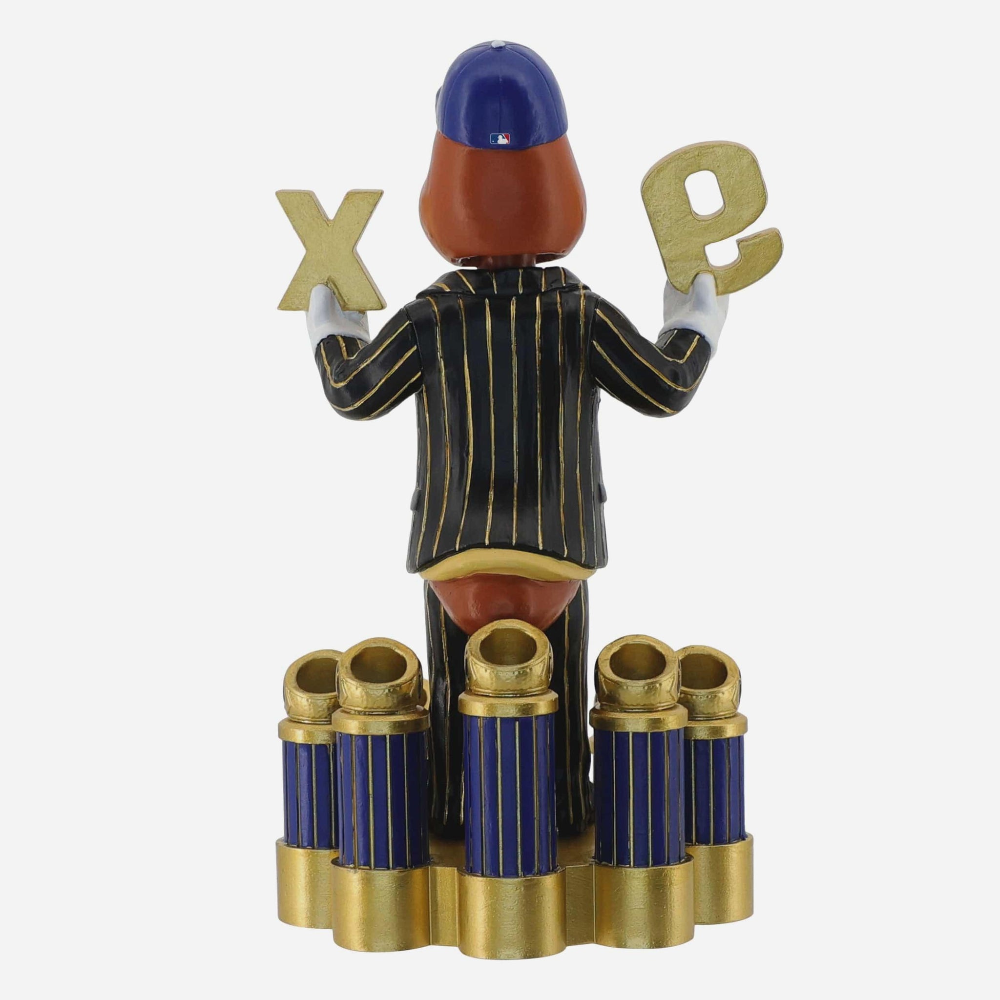 • Portrays the iconic Dodger Dog suited up in a championship-style pinstripe outfit, holding up massive golden “9X” letters for every World Series win