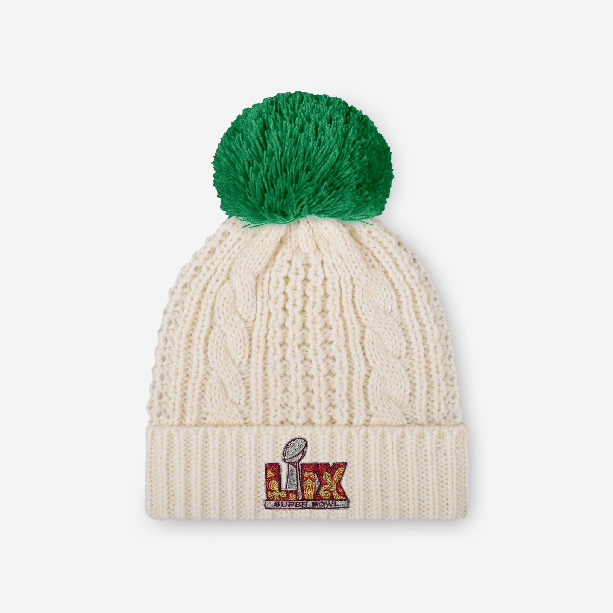 Putting together the ultimate fit for the tailgate and beyond? Make sure to get your head in the game with the Philadelphia Eagles Super Bowl LIX Champions Kelly Green Primary Logo White Cable Knit Pom Beanie!