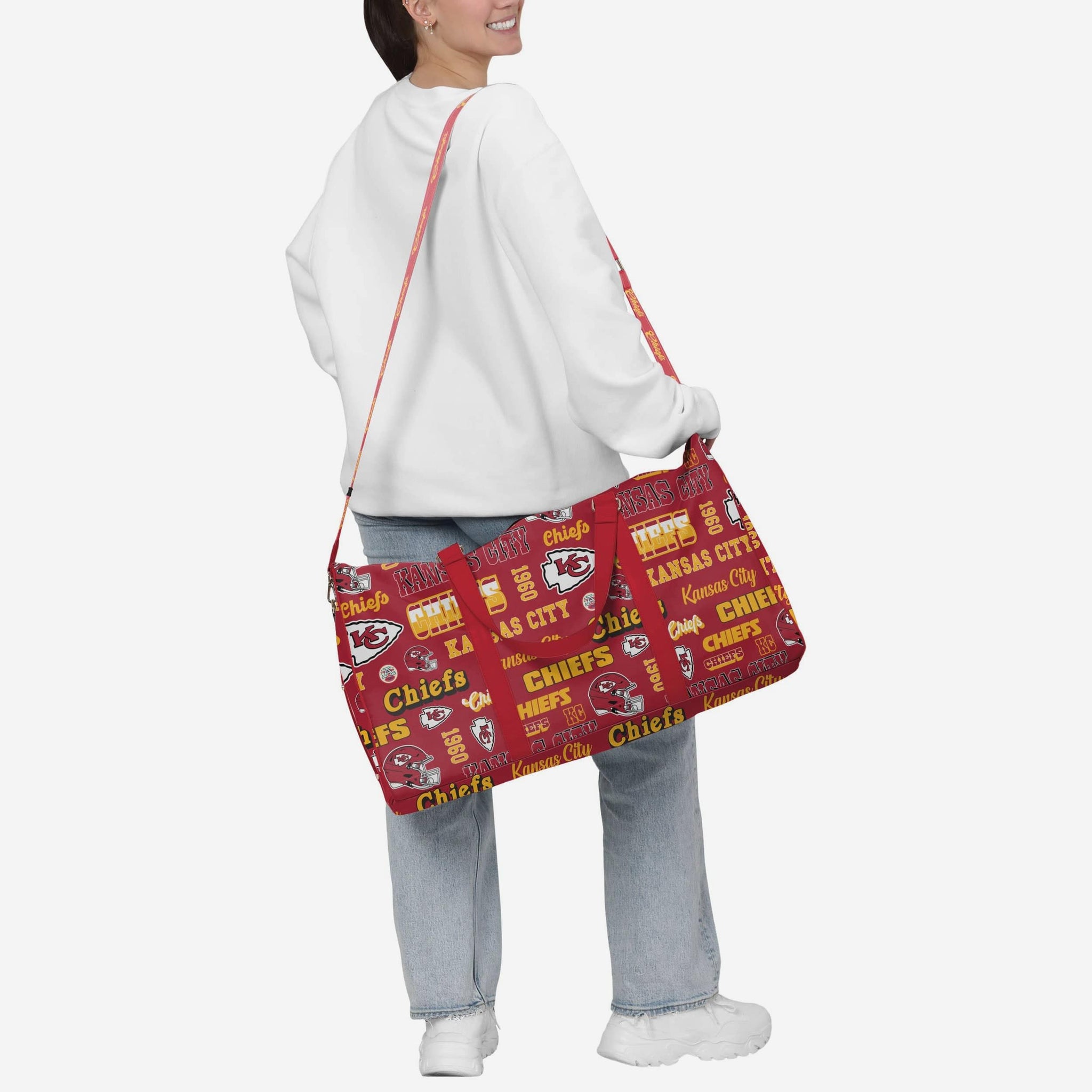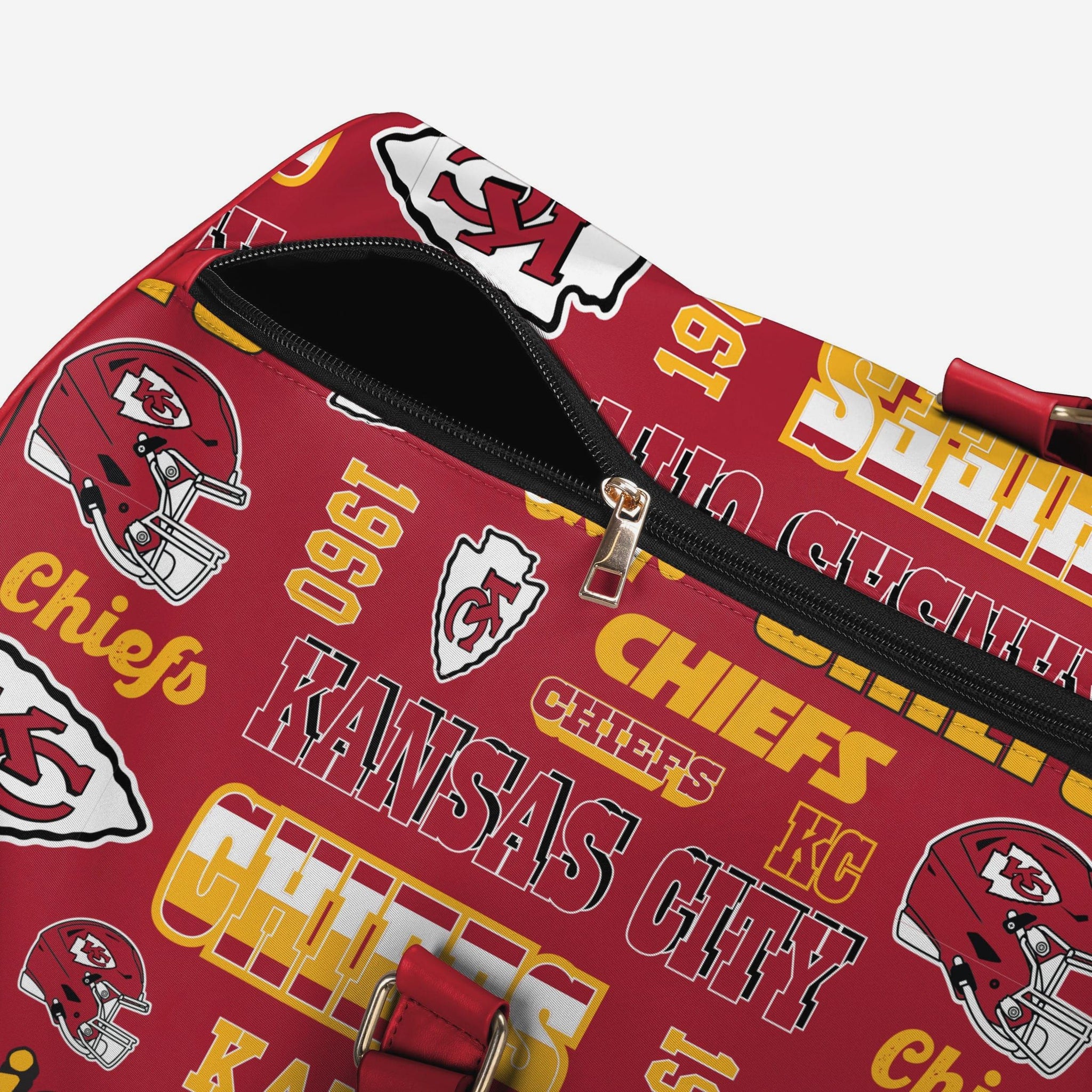 - Repeat retro Kansas City Chiefs wordmarks, logos, and graphics printed all over the bag so your team pride is always on display
