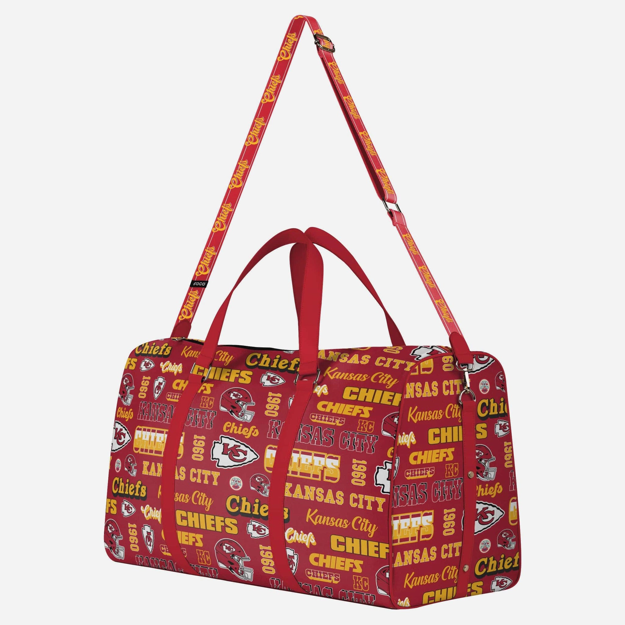 Pack up for game day, road trips, and weekend getaways with this Kansas City Chiefs Repeat Retro Print Nylon Weekender Duffle Bag, featuring bold allover graphics that show off your fandom from every angle.