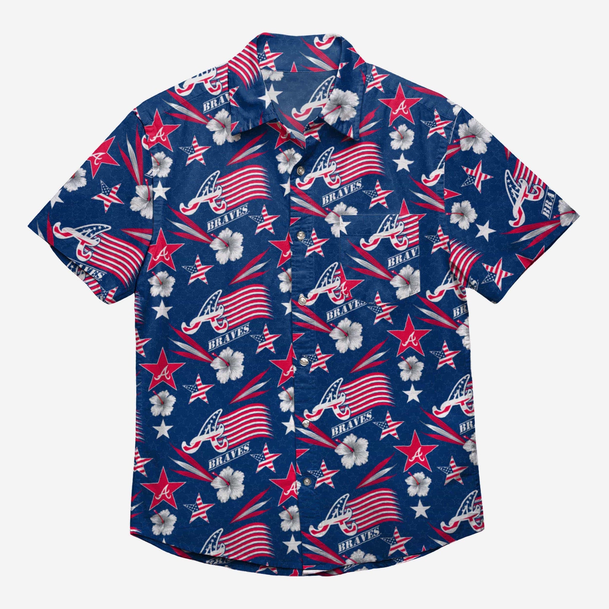 Stars + stripes + team spirit + style = The Atlanta Braves Americana Button Up Shirt. Dress to impress, all summer long!