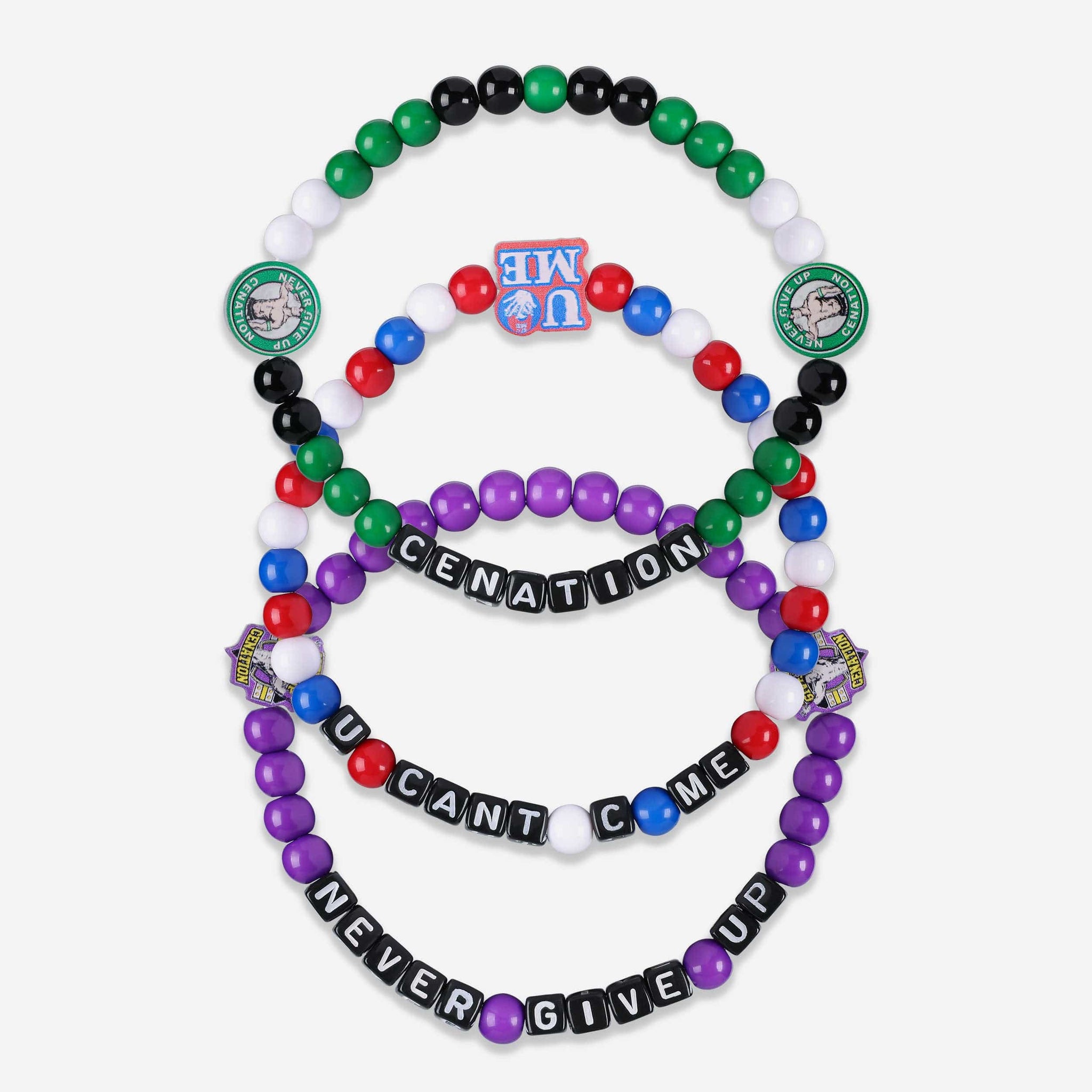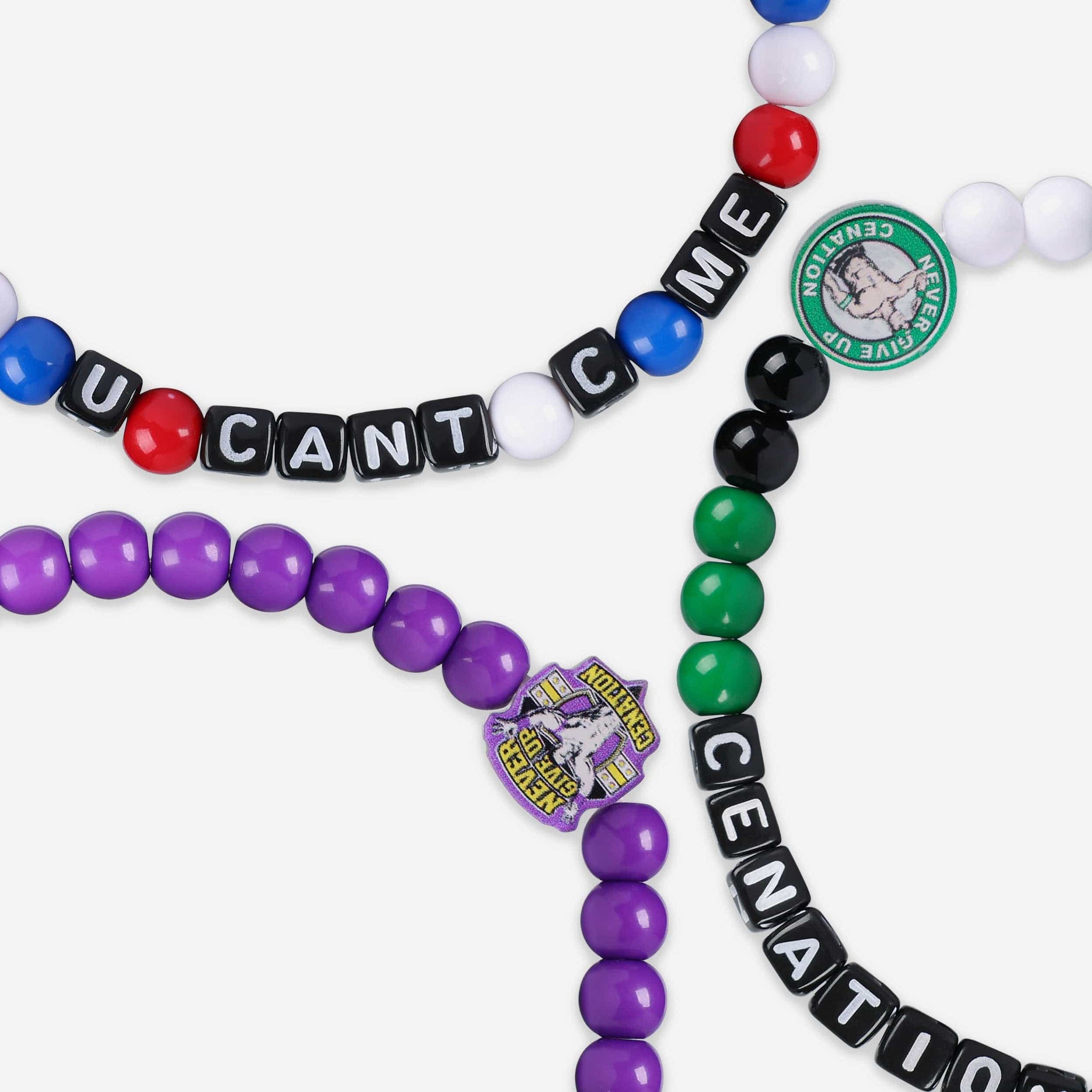 A whole new way to rep your favorite superstar in style is here. Step up your fan fashion sense with this John Cena WWE 3 Pack Beaded Friendship Bracelet. These matching friendship bracelets have an all-over team-colored design and team logo displays, which makes them the perfect way to show your support for The Franchise from the opening bell to pinfall, and every day in between.