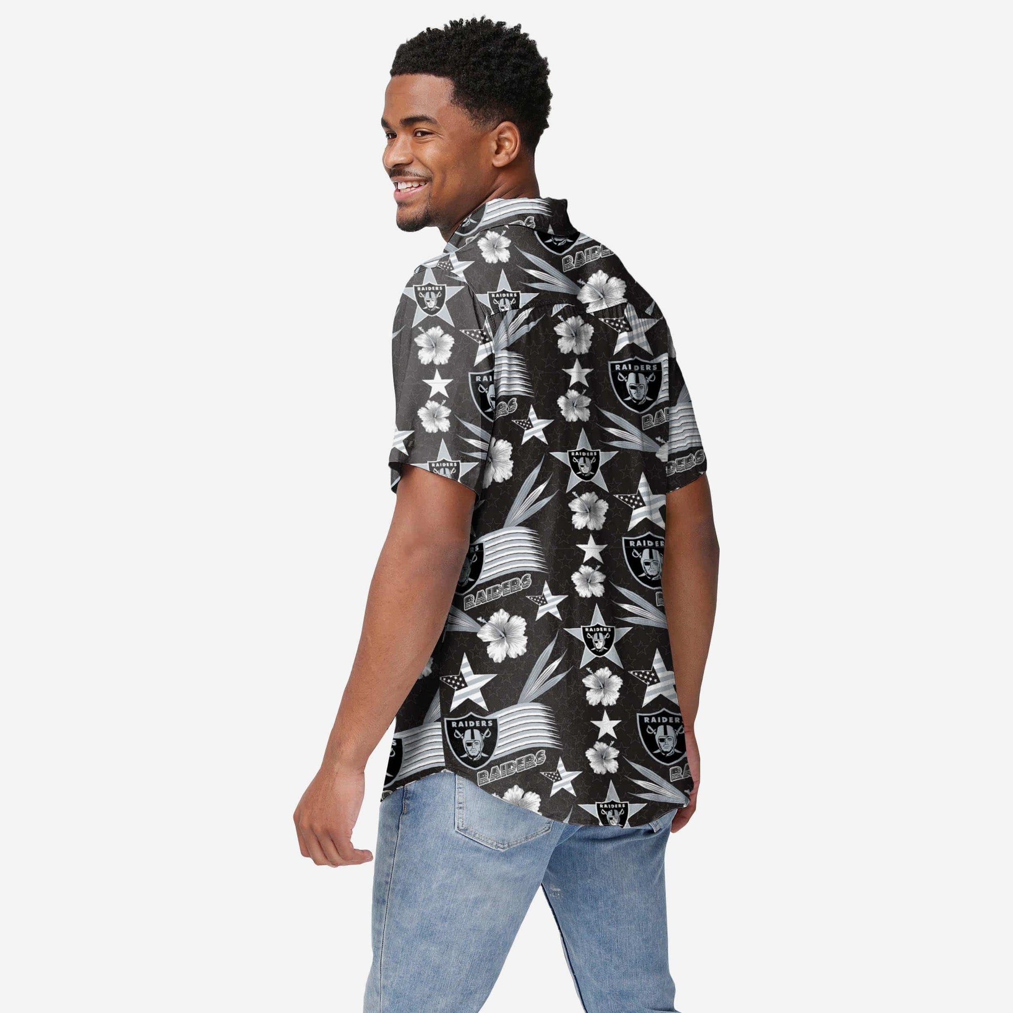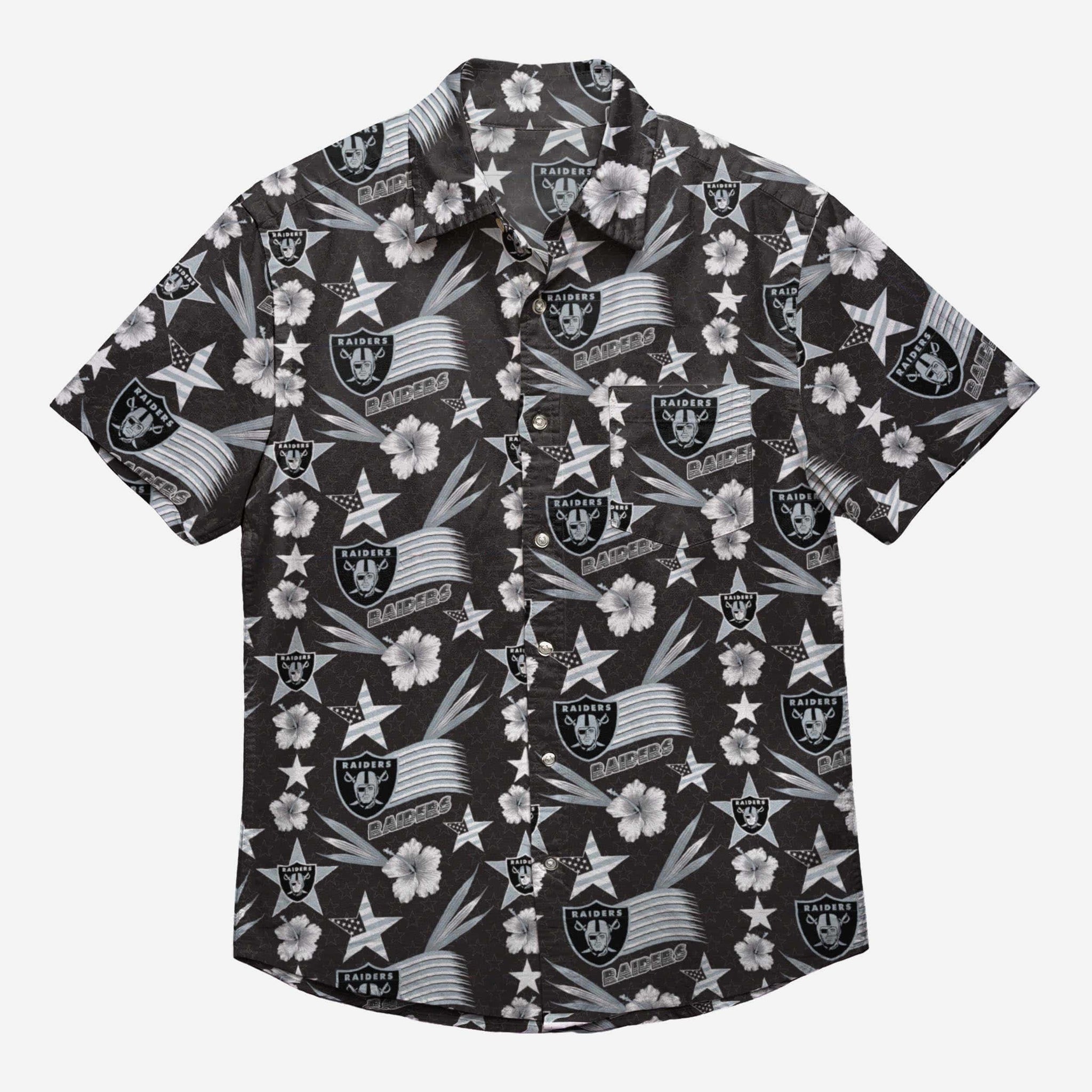 Stars + stripes + team spirit + style = The Las Vegas Raiders Americana Button Up Shirt. Dress to impress, all summer long!